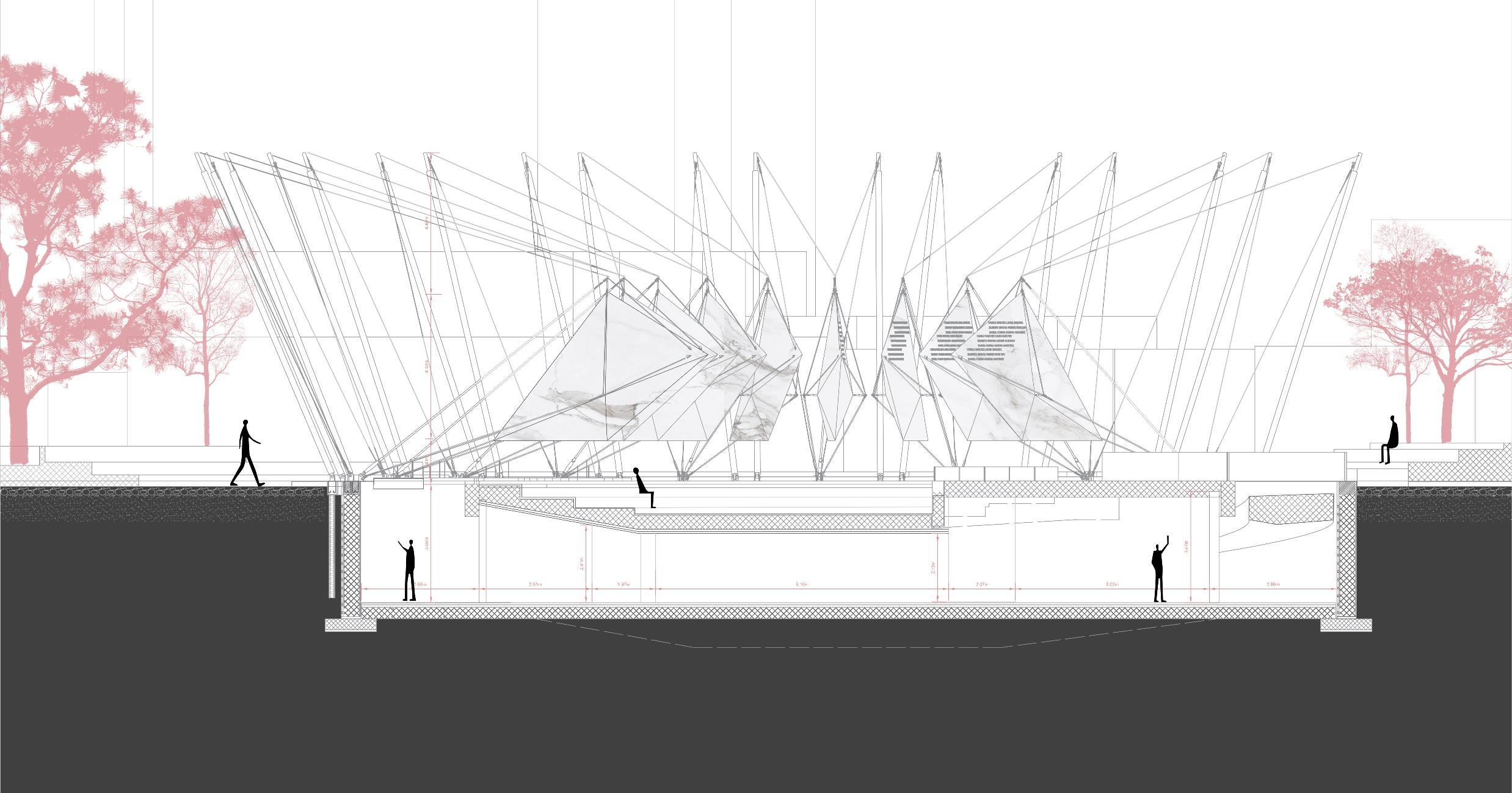 Las axonometrías enseñan el andamiaje interior de la propuesta, espejos de agua complementan la experiencia del peatón, que a la altura de su ojo solamente vera los planos del pórtico saliendo del suelo, al aproximarse se revela la excavación que conduce mediante rampas a un espacio de permanencia