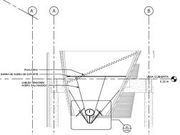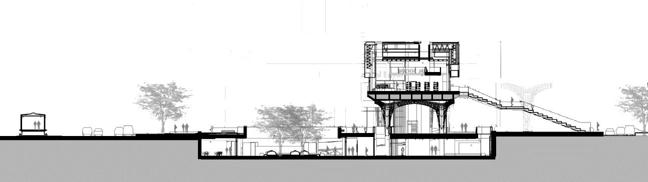 El corte evidencia la naturaleza estructural de los elementos suspendidos, dos núcleos de circulación vertical constituyen la estructura portante principal