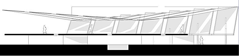El alzado refleja la búsqueda de delimitar un volumen legible e icónico para la ciudad, un faro de atracción al público, que no deja de ser una venia delicada a la técnica, el manejo del acero estructural y la búsqueda de la mayor riqueza de espacio colectivo