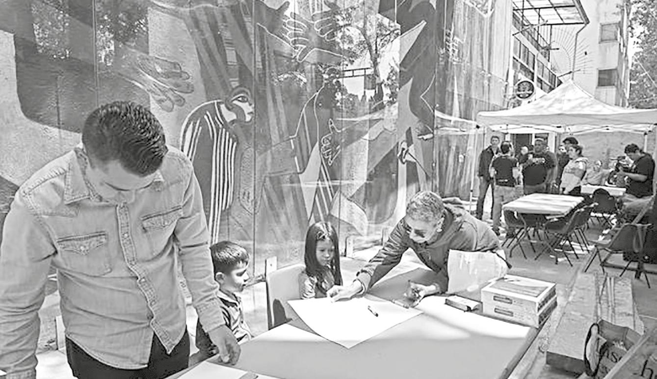 jo al aire libre con residentes de la colonia Santa María la Ribera en torno a la restauración del mural La guerra y la paz, del querido Mtro. Gilberto Aceves Navarro, y así honrar su memoria y legado artístico en el marco