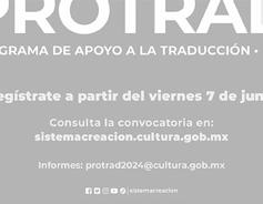 La Secretaría de Cultura del Gobierno de México, a través del Sistema Creación (antes Fonca), invita a participar en la Convocatoria 2024 del Programa de Apoyo a la Traducción (Protrad) con la postulación de proyectos literarios de personas autoras mexicanas y extranjeras, con la finalidad de traducirlos y publicarlos en formato impreso. El Protrad tiene como finalidad contribuir al fortalecimiento de la labor de traductoras y traductores, así como colaborar en la difusión y promoción de la cultura y la literatura nacionales en el extranjero.