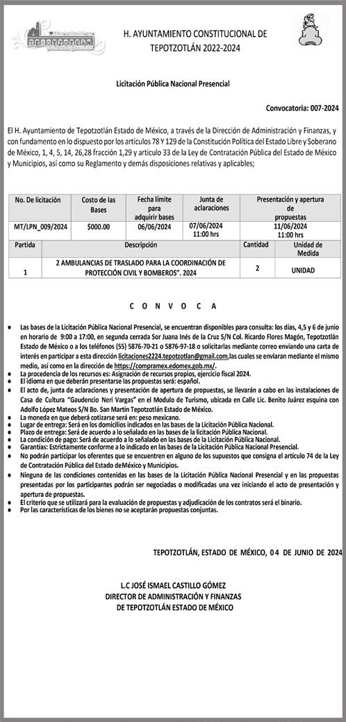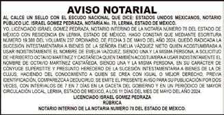 Martes 4 de junio de 2024, El diario HERALDO ESTADO DE MÉXICO es una publicación diaria. Editor responsable: Esteban Gildardo Peláez Bautista. Número de Certificado de Reserva de Derechos de Uso Exclusivo del Título que otorga el Instituto Nacional del Derecho de autor: 042022-030110194100-30. Número de Certificado de Licitud del Título y Contenido: en trámite. Domicilio de la publicación: Miguel Hidalgo y Costilla Poniente 505 B, Col. La Merced, Toluca Estado de México. Impreso en Talleres Belmont, ubicado en Vialidad Salvador Díaz Mirón No. 700 Colonia Salvador Sánchez Colín, distribuido por la Unión de Voceadores de Periódicos y Revistas del Estado de México, Honduras No. 205 Col. Américas. Toluca, Estado de México, resto del Estado distribución propia a través de oficinas regionales. Oficinas Tlalnepantla, Calle Vallarta número 18, Int. 1 C.P. 54000, Tlalnepantla Centro, Edo. Méx. Teléfono 55 7258 3017, 55 7155 6757. Oficina en Zumpango, Segundo Callejón de Uruguay sin número, Barrio de San Miguel, Zumpango, Estado de México. Teléfono: 01 (591) 611-49-68. Oficina en Texcoco, Calle 2 de Marzo número 215-A Int. 6, Col. Centro Texcoco, Méx. Teléfono: 01 (595) 95 516 97 Servicios Informativos NOTIMEX, miembros de la Cámara Nacional de la Industria Editorial No. 556. DIRECTORIO Responsable Editor y Director General: Lic. Esteban Peláez Bautista Subdirectora Janet Hernández Bárcenas Jefa de Redacción: Martha González Aguilera Coordinador Zona Texcoco: Youssef Buendía Huerta Coordinador Región Zona Norte: Salvador Marrón Suaréz Gte. de Publicidad: Susana Martinez de la Borbolla