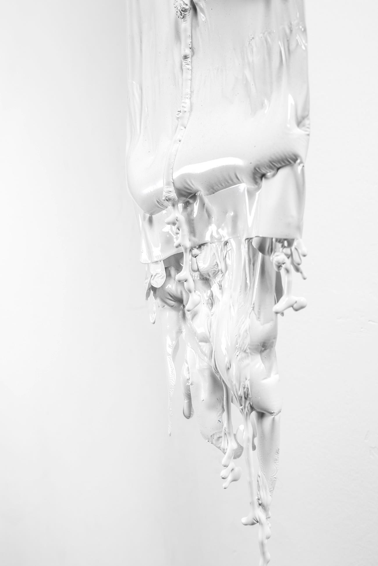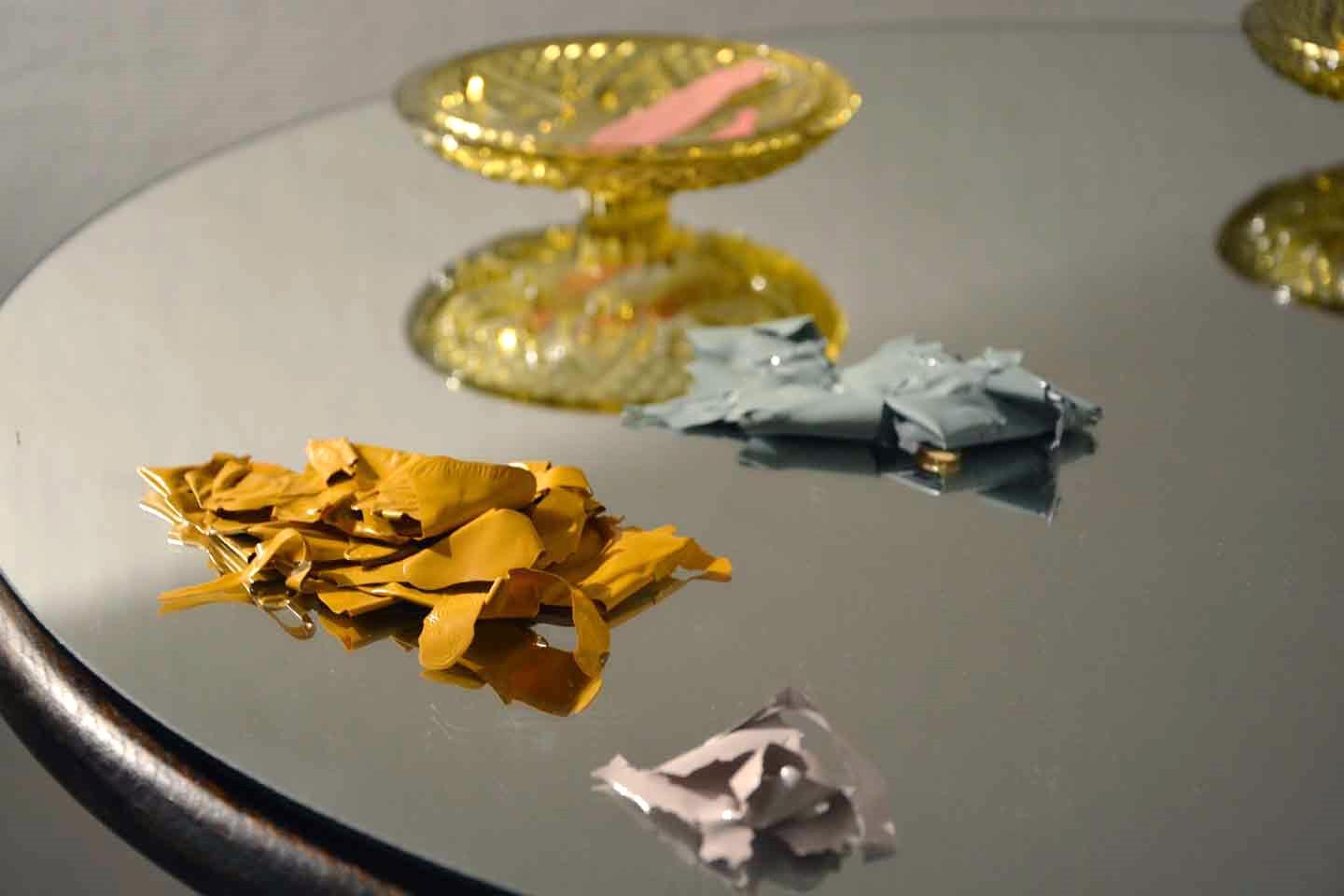 Elijo el esmalte sintético por su plasticidad y lentitud en su tiempo de secado, que me permite jugar con otro elemento que elijo como partícipe del proceso: la gravedad. Diseño soportes para poder contemplar la pintura sin obstáculos, con la relevancia que podría tener el marco de un cuadro.