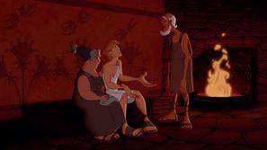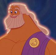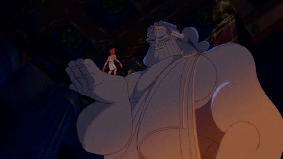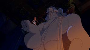 Durante unos años, ellos lo criaron en Tebas como un hijo propio. Pero Hércules, no tiene control de su fuerza y llega a destruir una parte de la ciudad. Luego, empieza a dudar sobre su origen, ellos le comentan cómo lo encontraron y le muestran el collar que llevaba puesto llevaba puesto en ese momento, el cual tiene el símbolo de Zeus, él decide ir al templo de este para asegurarse de ello, al llegar ve la estatua.