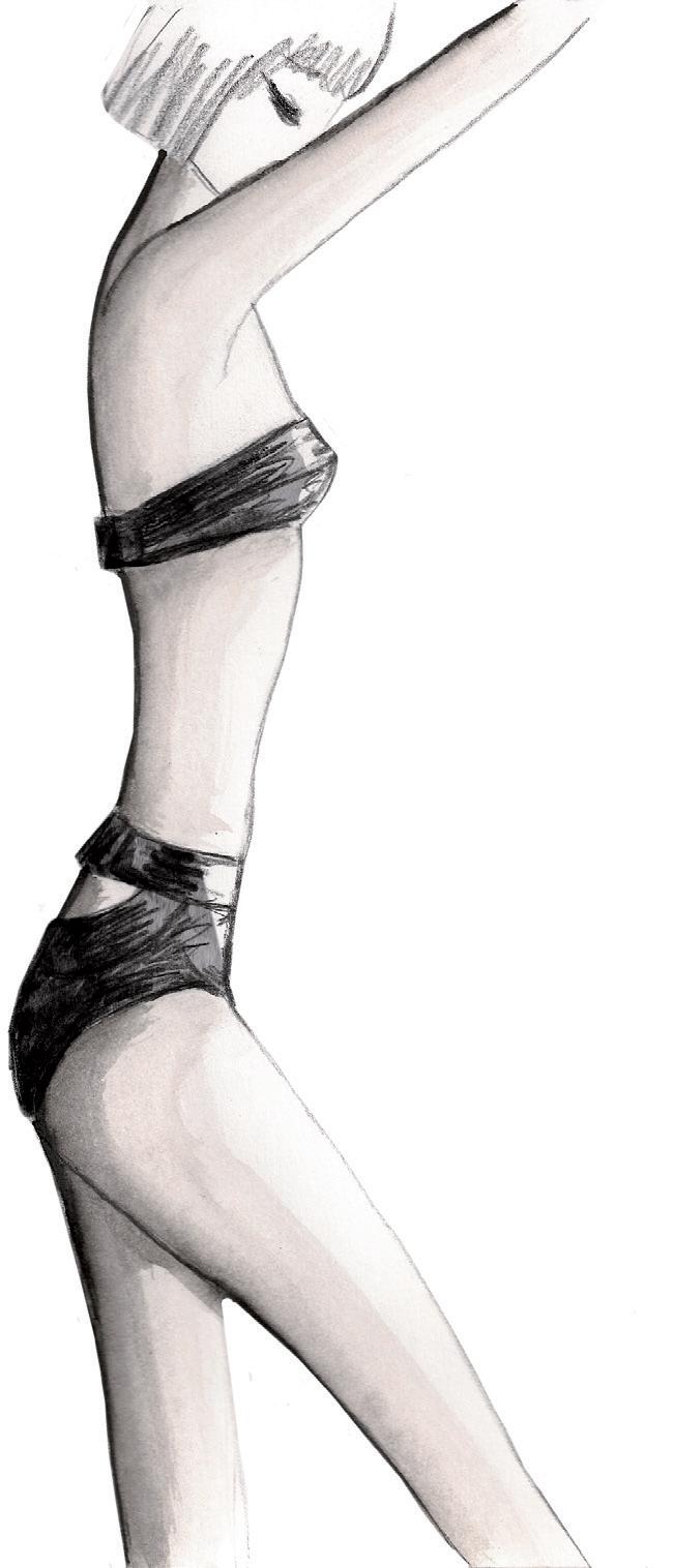 El sujetador se compone de cascos forrados en licra con tirantes elásticos adornados con un volante de organza cada uno, que sólo va cosido con cuatro puntadas apenas visibles al tirante para que haga la onda. El tanga de licra contiene tres volantes de organza en la parte posterior.