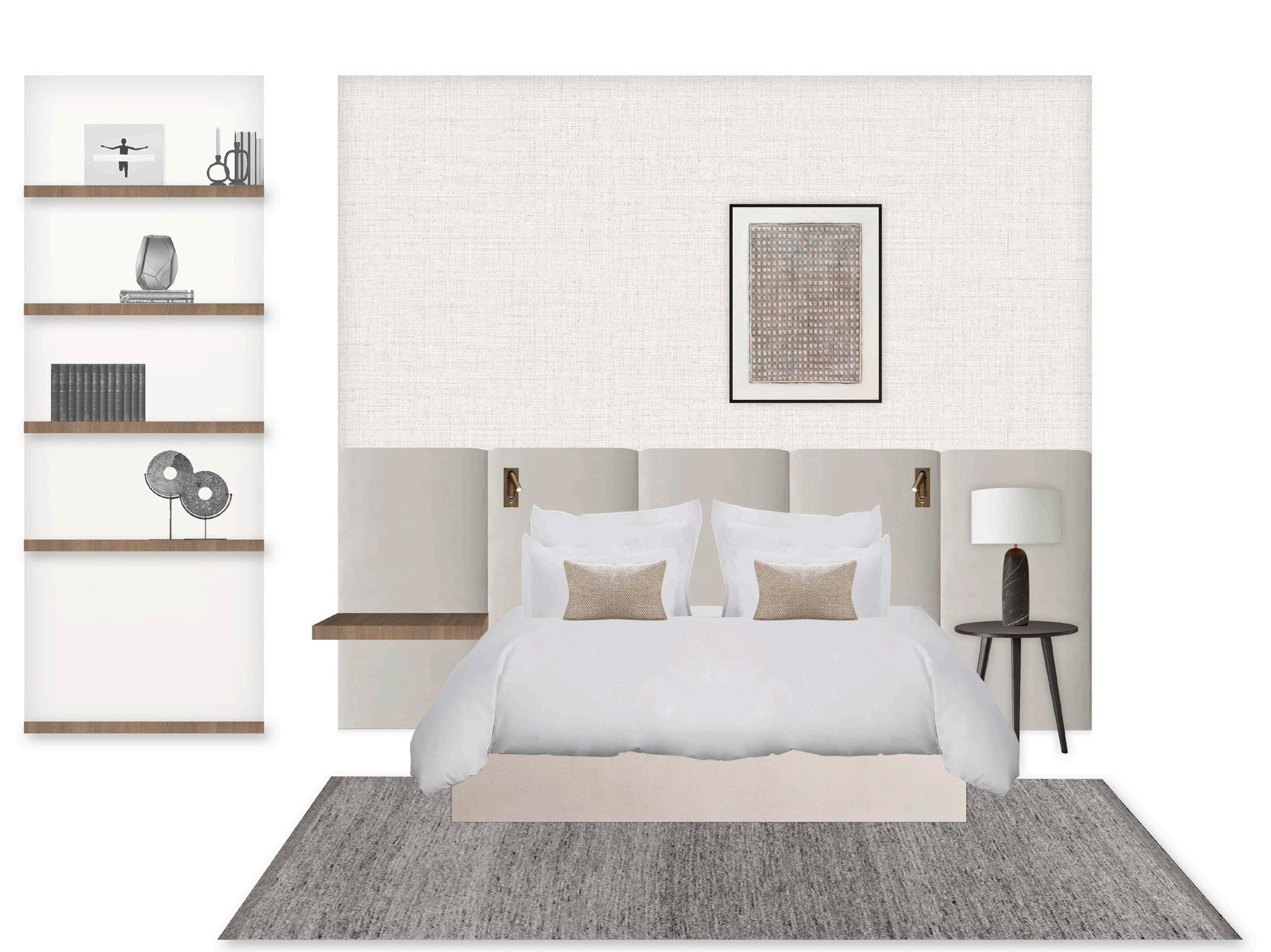 Para las habitaciones, el diseño se centra en elementos hechos a medida en madera, que aportan calidez y confort a los espacios. Los cabeceros, también diseñados a medida, son los diferenciadores de cada habitación, otorgándole un toque único y personal a cada una. Se han seleccionado cuidadosamente textiles en colores claros, que contribuyen a la luminosidad y la serenidad del ambiente. Los papeles pintados texturizados añaden profundidad y un toque acogedor, creando un refugio perfecto para la relajación y el disfrute.