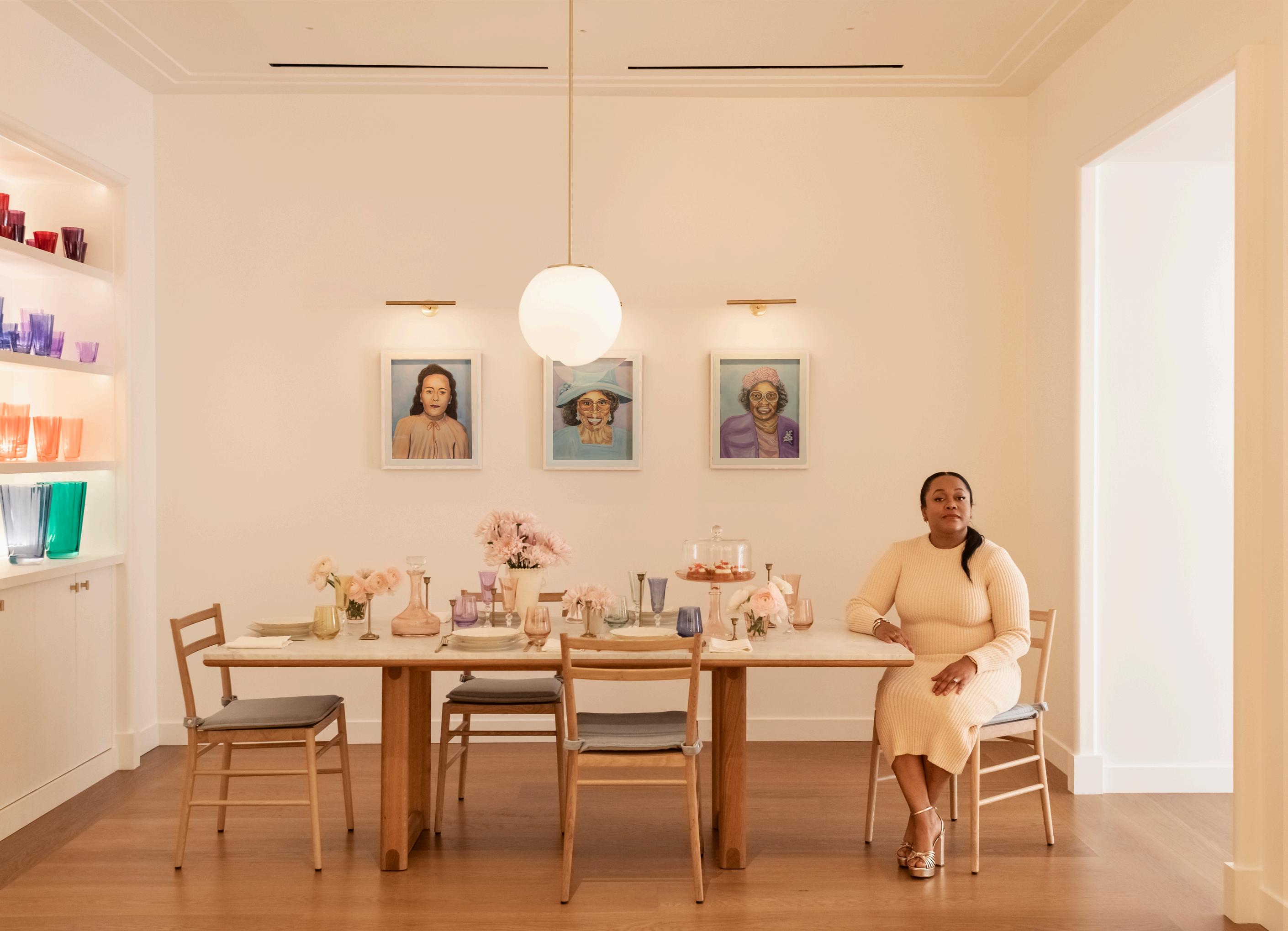 On the wall next to the communal table in the Estelle store is a trio of portraits by Tasha Bock titled Matriarchs at Sunday Dinner honors the strong women from Stephanie’s childhood.