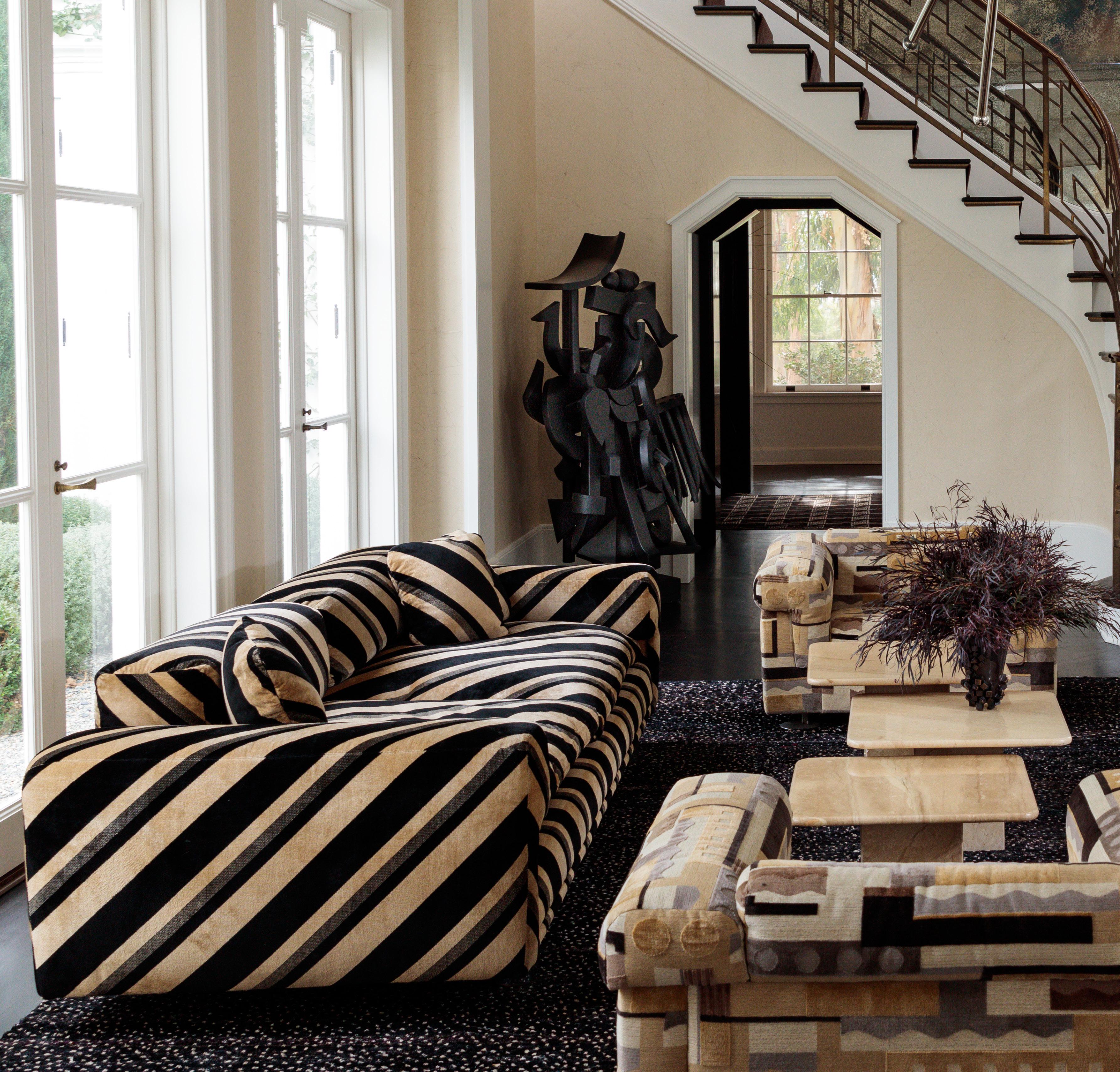 Kelly creates a sequenced sense of discovery from one room to the next in her home by seeking out rare and unusual pieces and curating them with her custom work. The living space features her custom sofas, and Dolores armchairs designed by Rob Eckhardt, together with vintage and flea market finds.