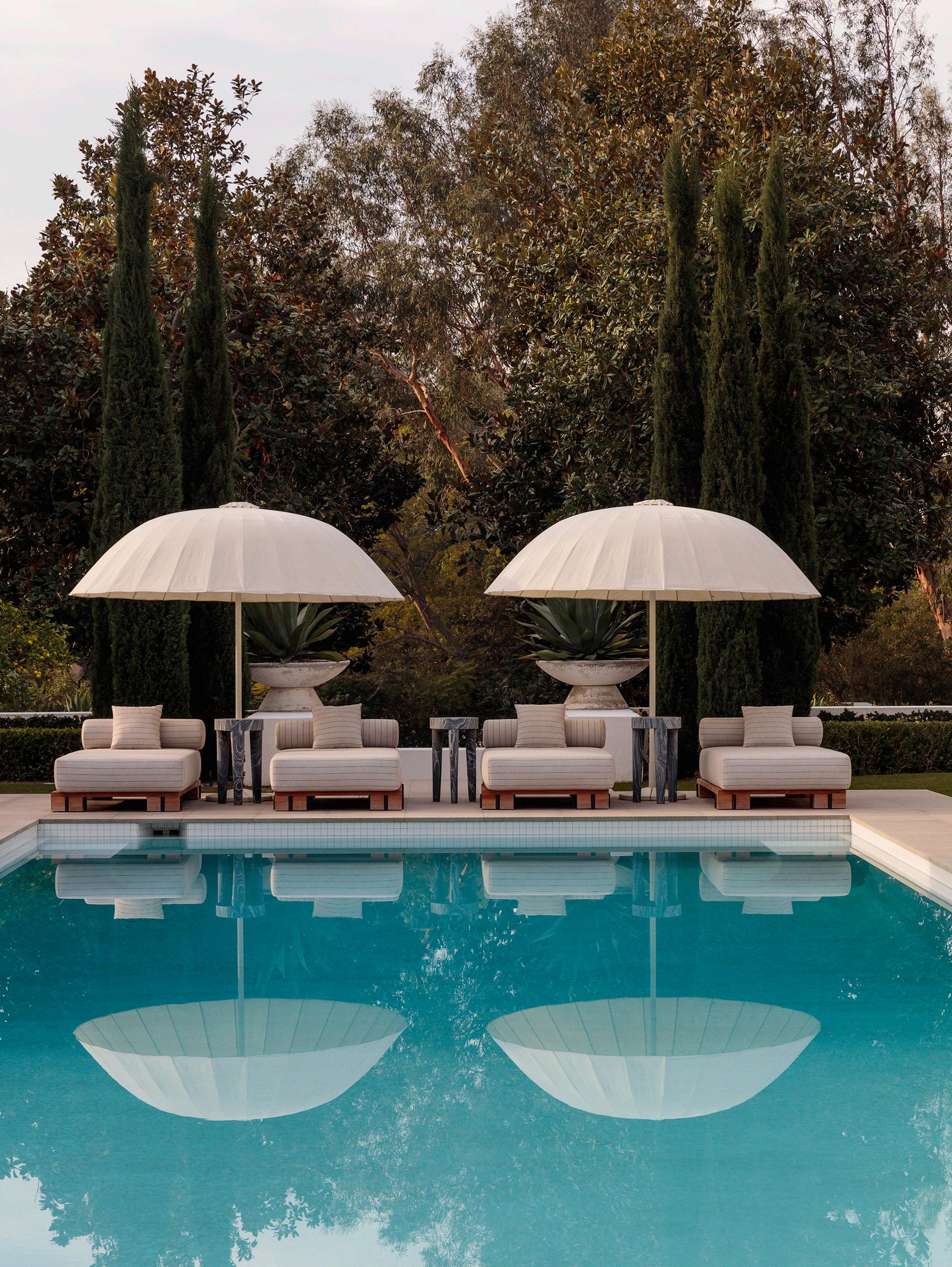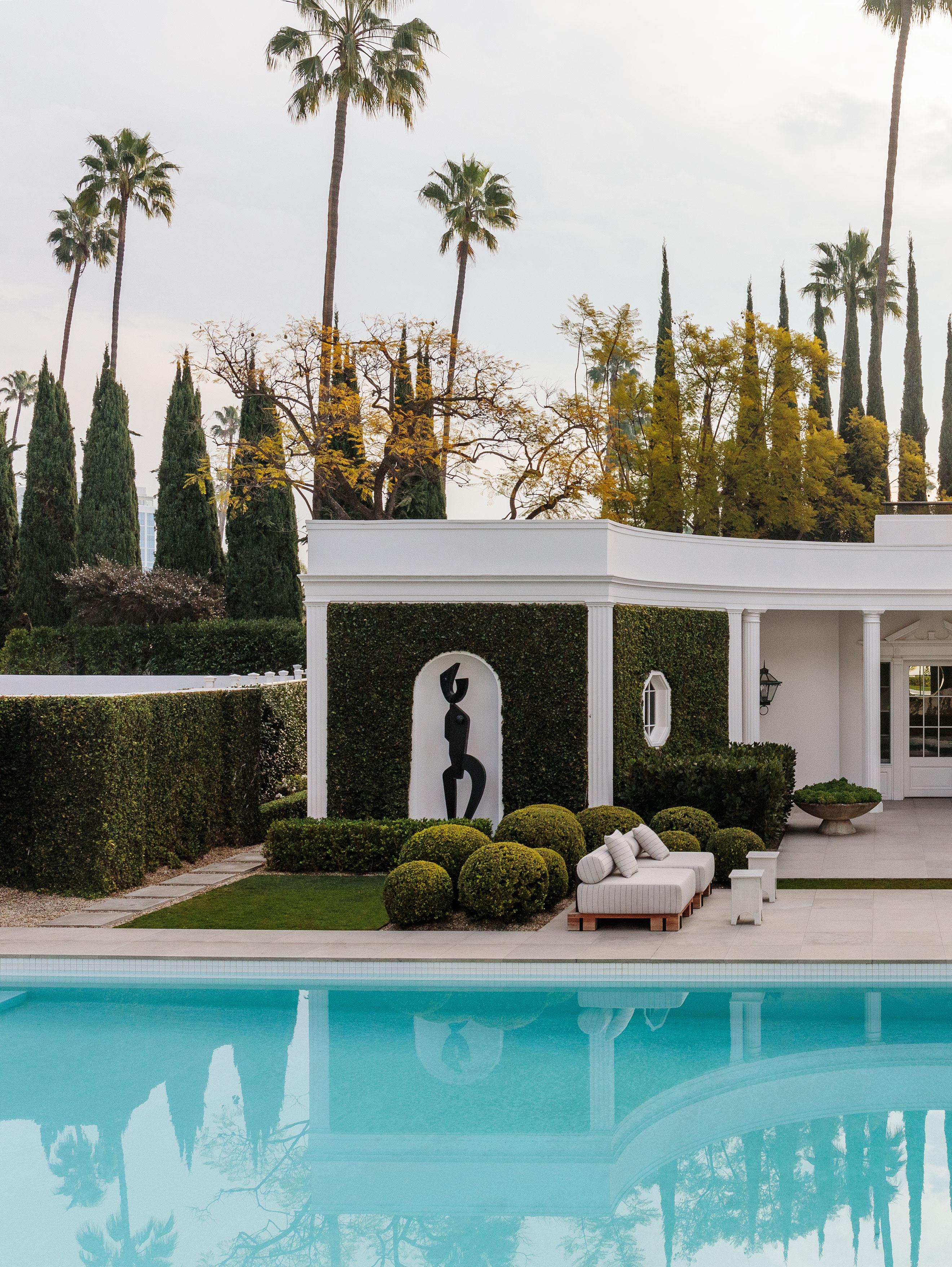 Kelly worked closely with Art Luna studio on the poolhouse and landscaping, reflecting the home’s consistent sculptural thread. The Krios loungers by Conrad Sanchez and coupe-shaped umbrellas by Paola Lenti are for relaxing by the pool – in true Beverly Hills style.
