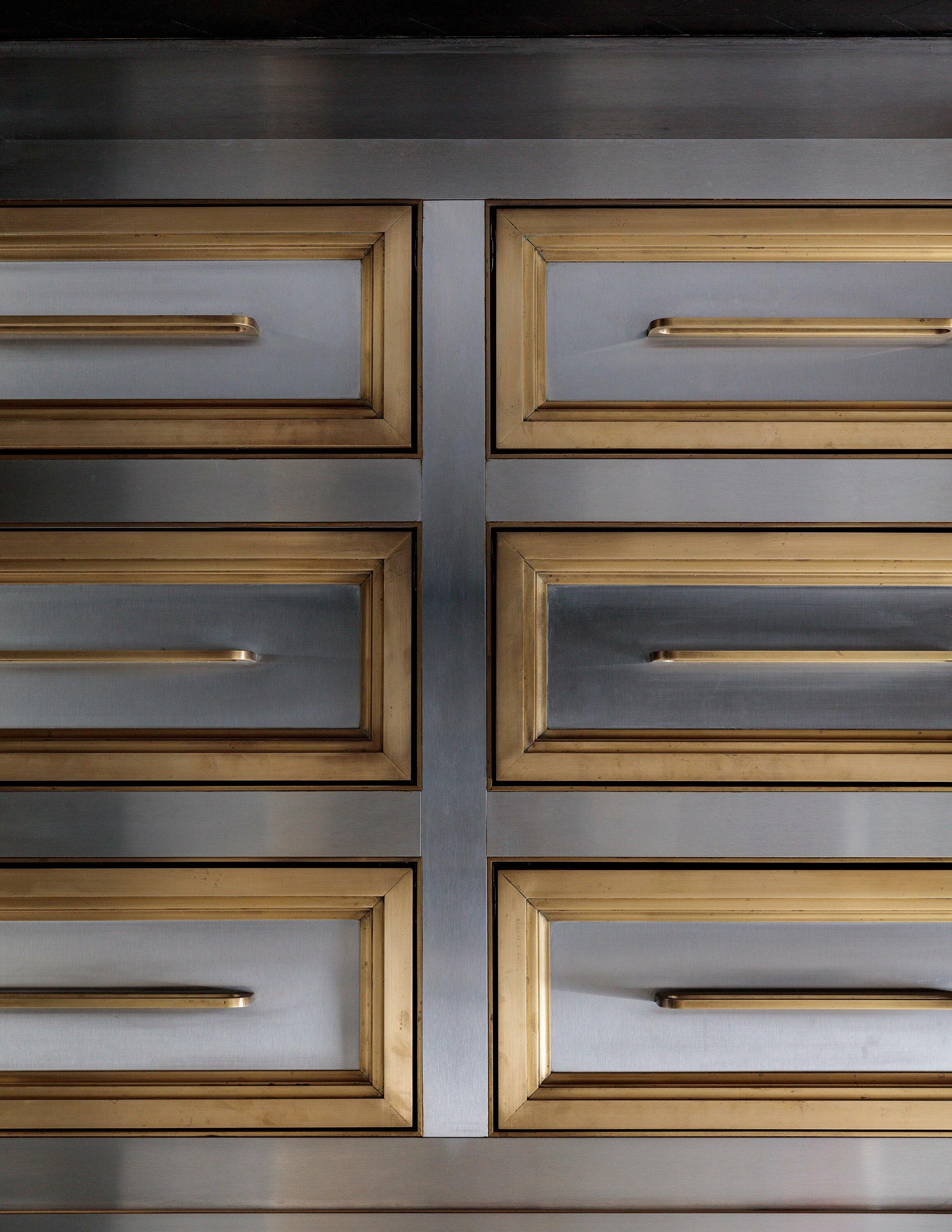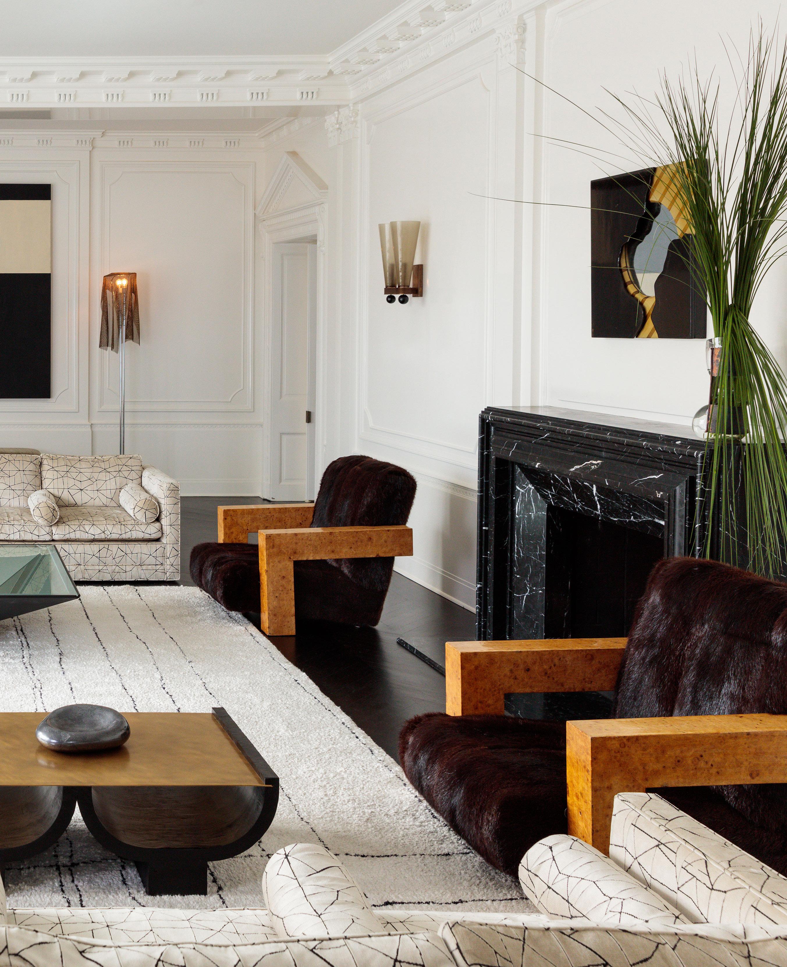 Originally Spanish Colonial in style, architect James E. Dolena, loved by A-listers at the time, remodelled the home as Georgian in 1934. “The house has so many amazing architectural features – from the intricate Georgian, Federal and Neoclassical mouldings to the handsome marble bathrooms and the solid boiserie panelled doors,” Kelly says. Her material mix speaks to the home’s confluence of styles, engaging with the existing architecture, but at times through tension and unexpected pairings, creating contrast.