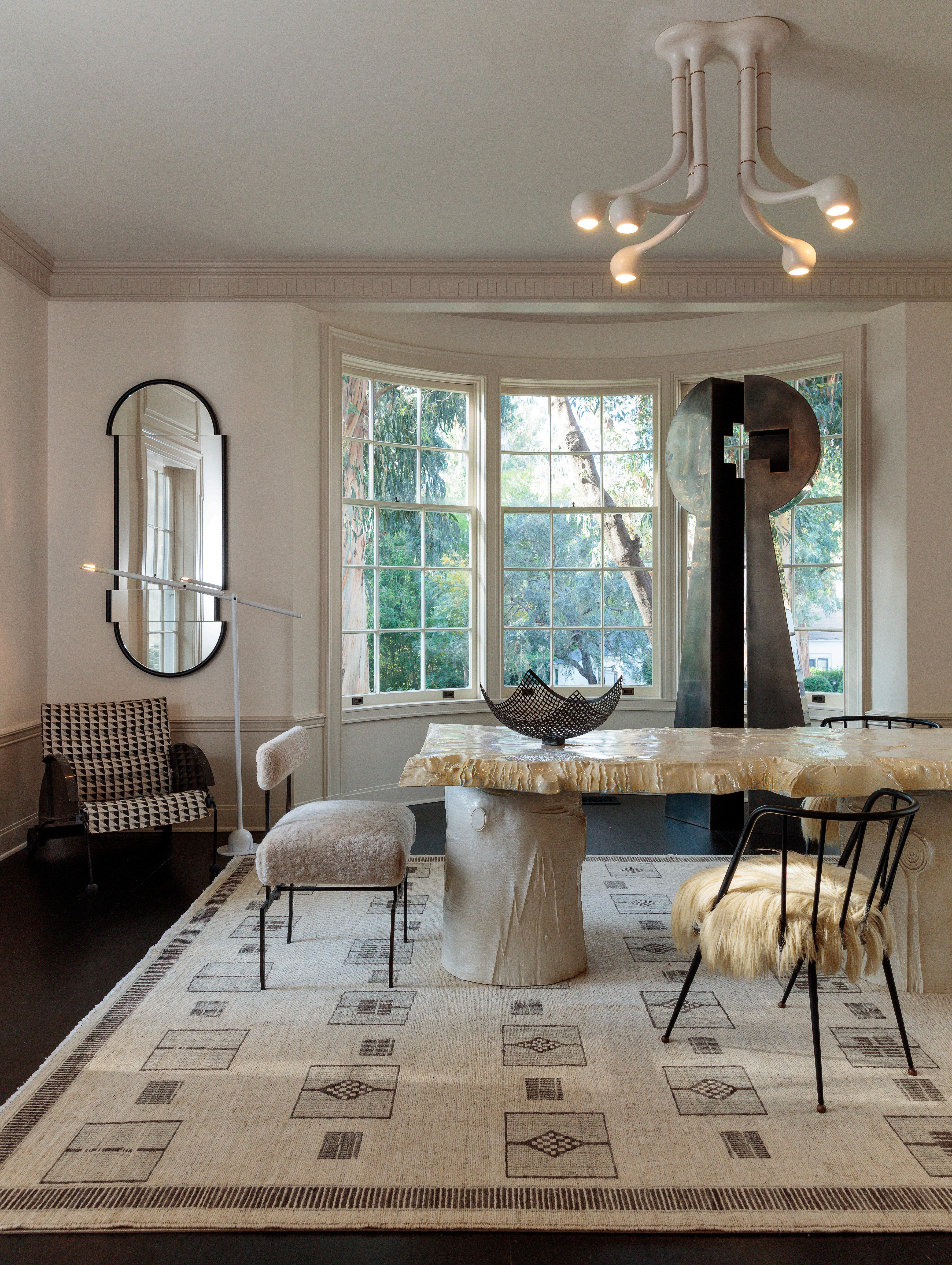 Texture is an important part of Kelly’s approach, as seen in the dining room with her goat hair-upholstered Sonnet chair, Entler 6-Globe plaster chandelier and antique ceramic table cast as a tree trunk. A Split mirror by friend Lee Broom also features by the bay window.