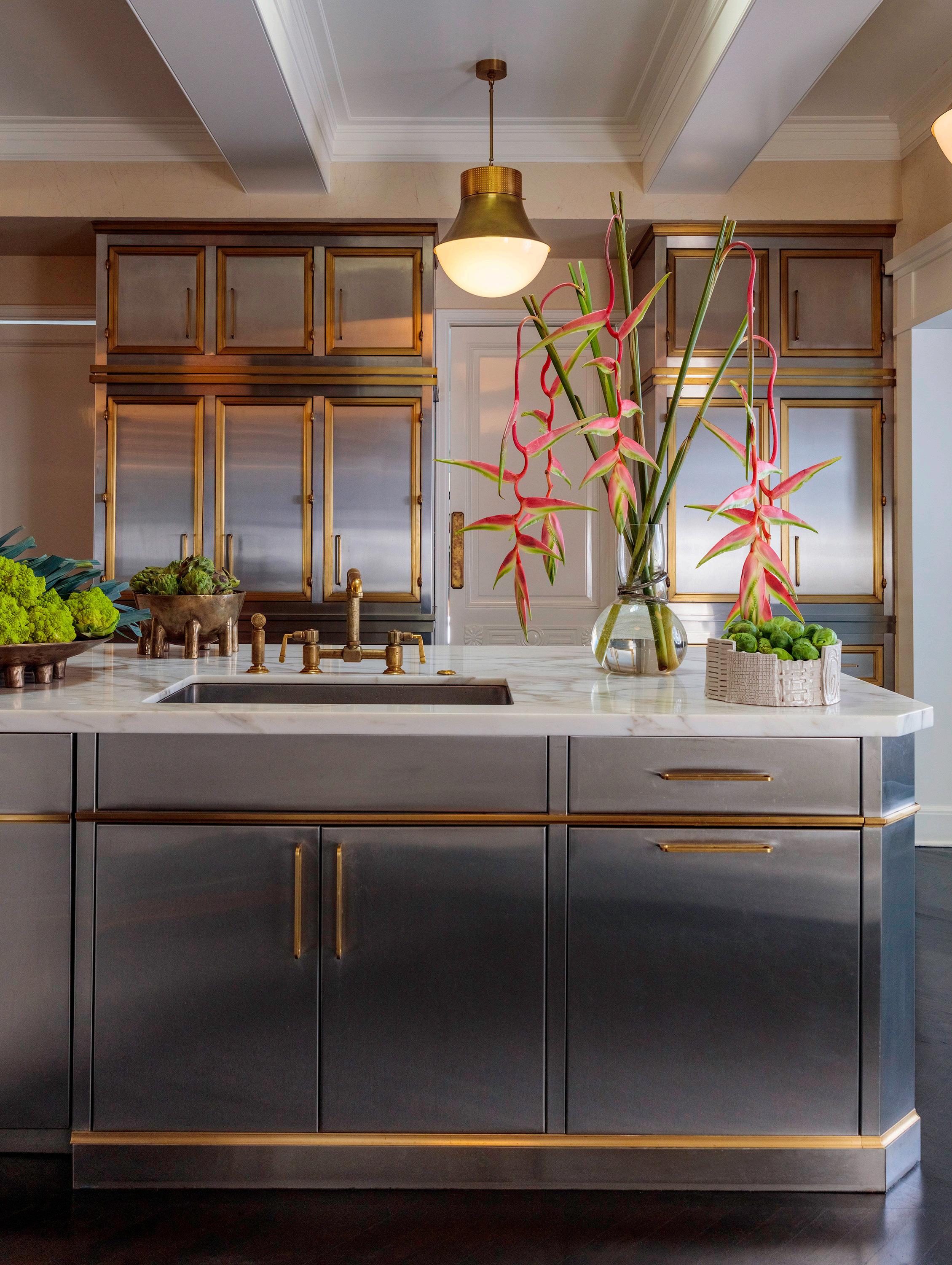 Kelly custom-designed her kitchen using stainless steel cabinetry and solid brass trim. The kitchen also features her Precision pendant and Heath bowl.