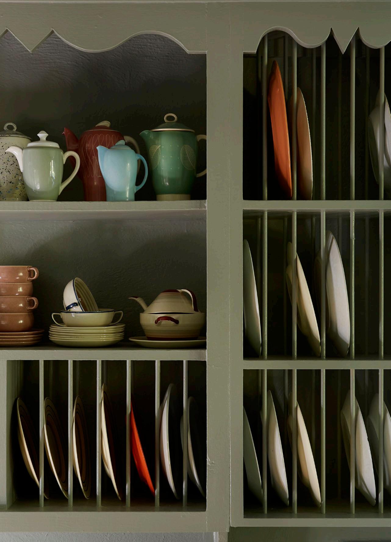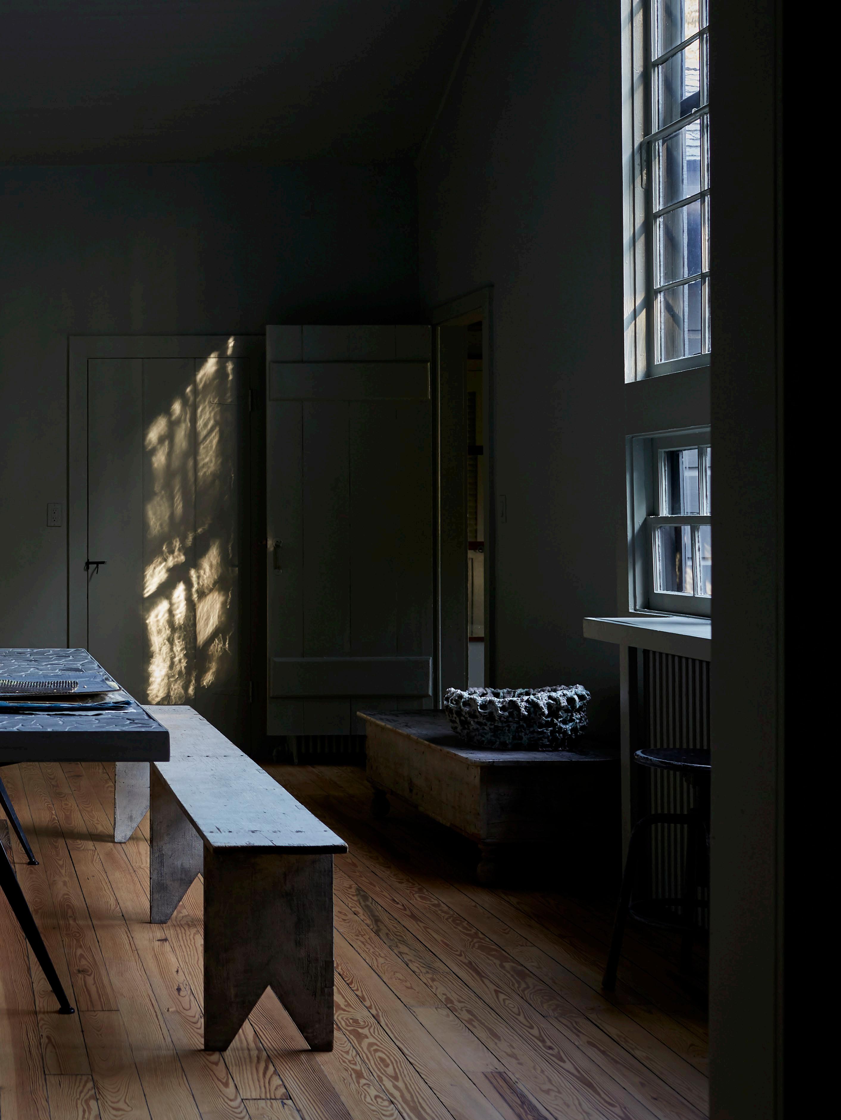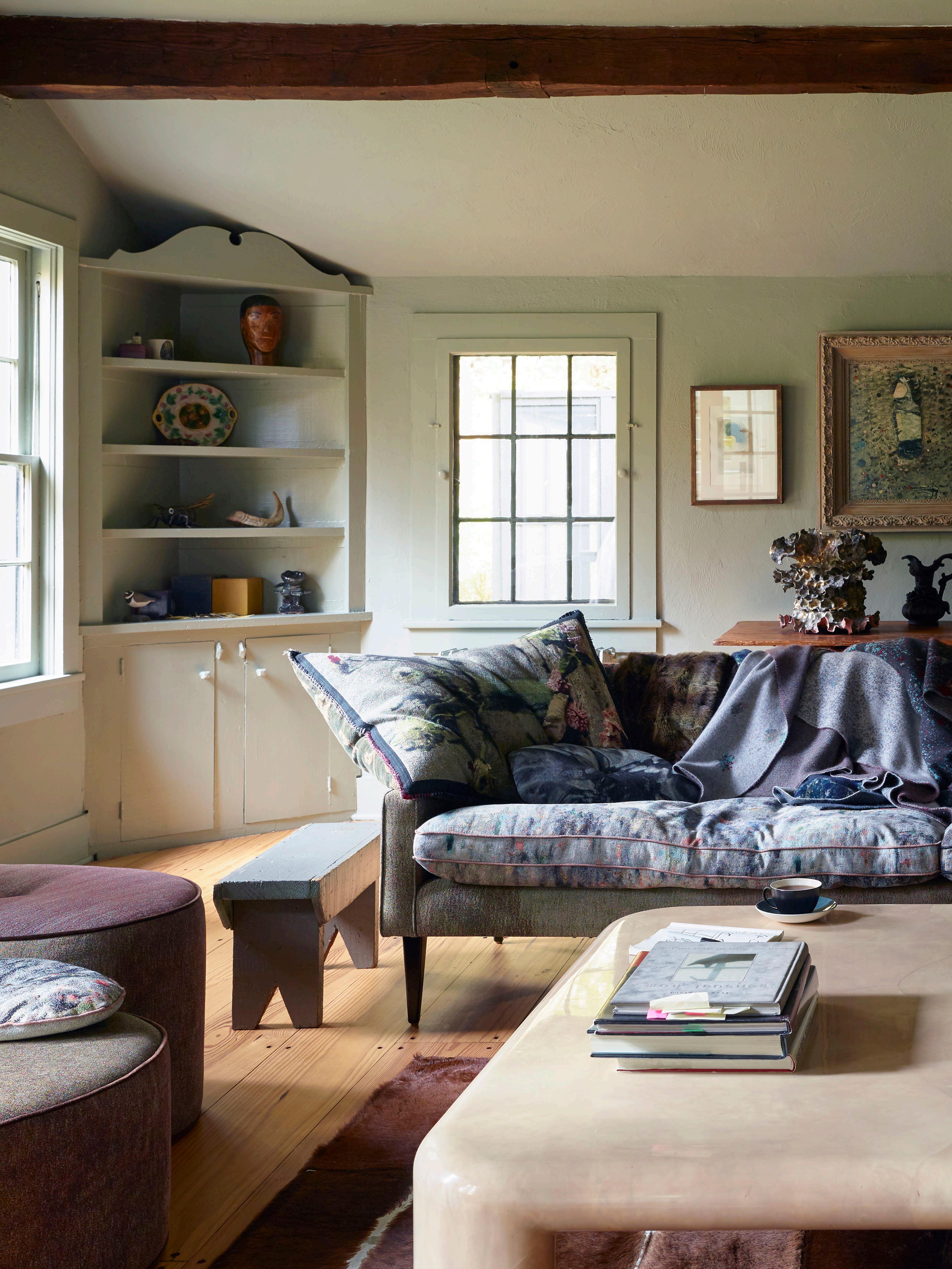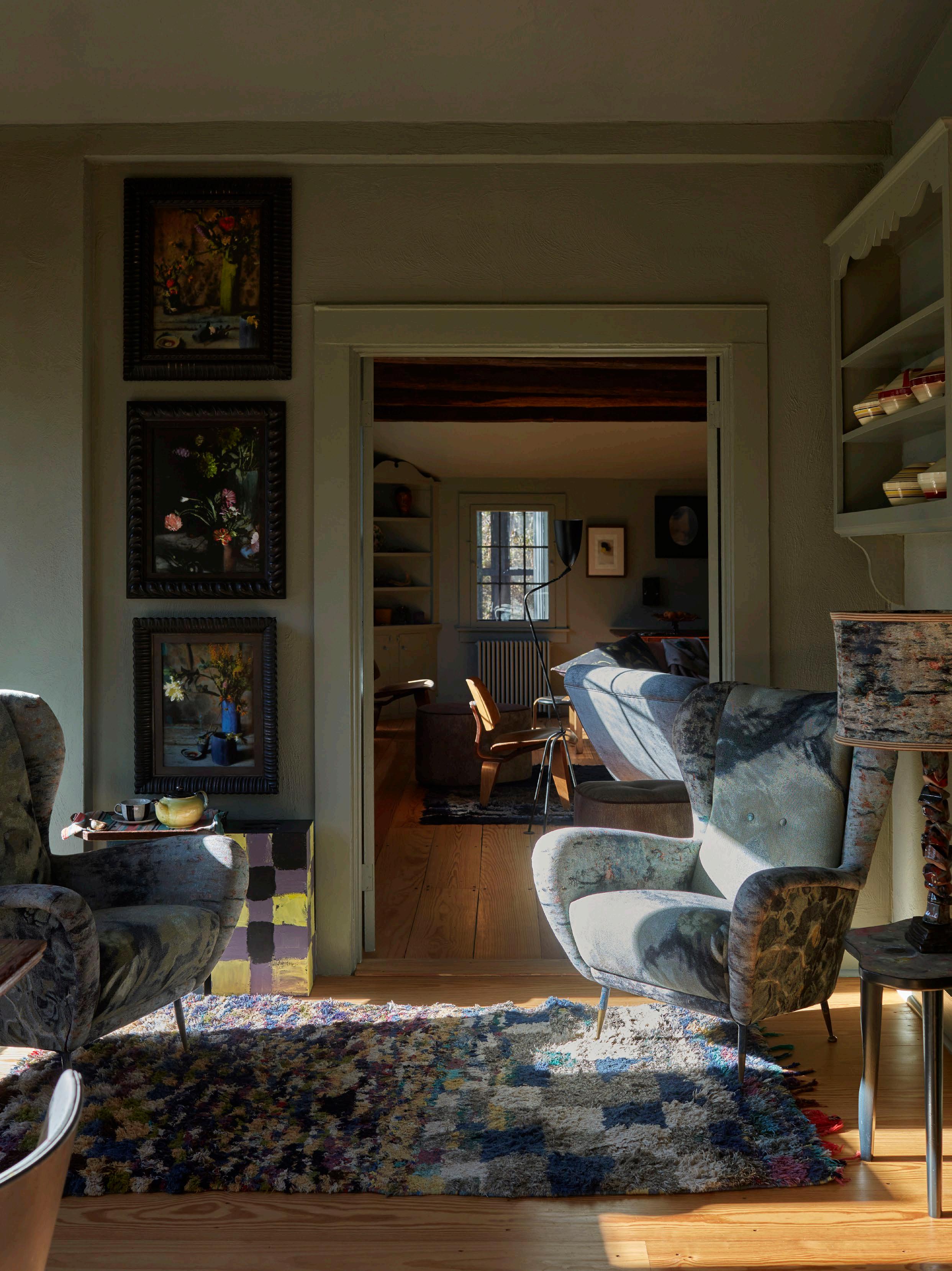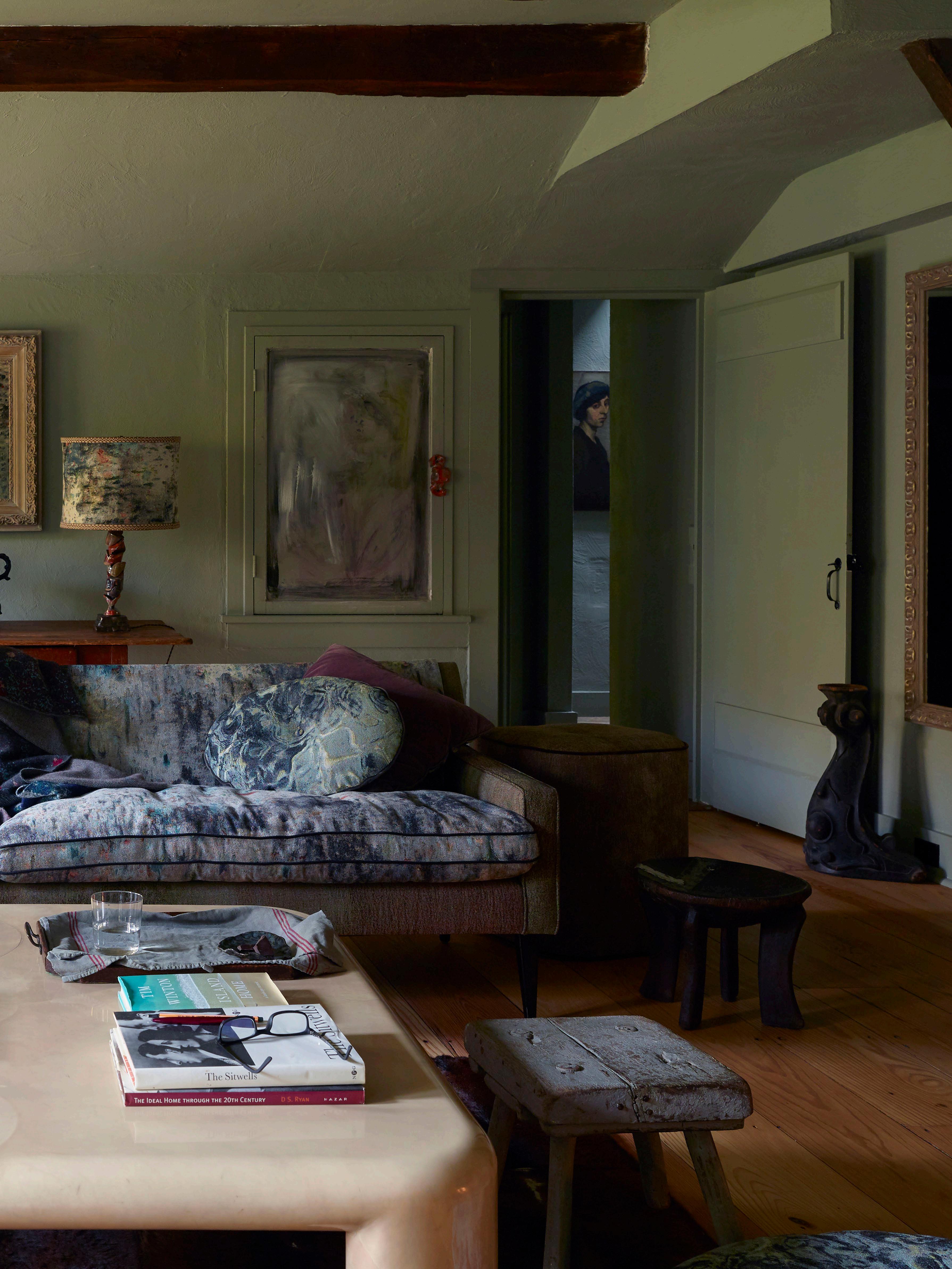 The area appealed because it reminded him of where his mother grew up in Staffordshire in the English West Midlands, and the house, on the edge of town, was, at its original core, a 1920s artist’s house with several ill-advised add-ons throughout the ensuing decades. Undaunted, Martyn painted the exterior timber black, a common treatment in the area, while the interior was subjected to several unifying coats of his favourite paint, Farrow & Ball’s Pigeon. “It was a very stylistically inconsistent house, with windows from every decade, but also with a great deal of charm with different ceiling treatments – some lower with the wooden beams, another sporting a giant internal pitch,” he says.