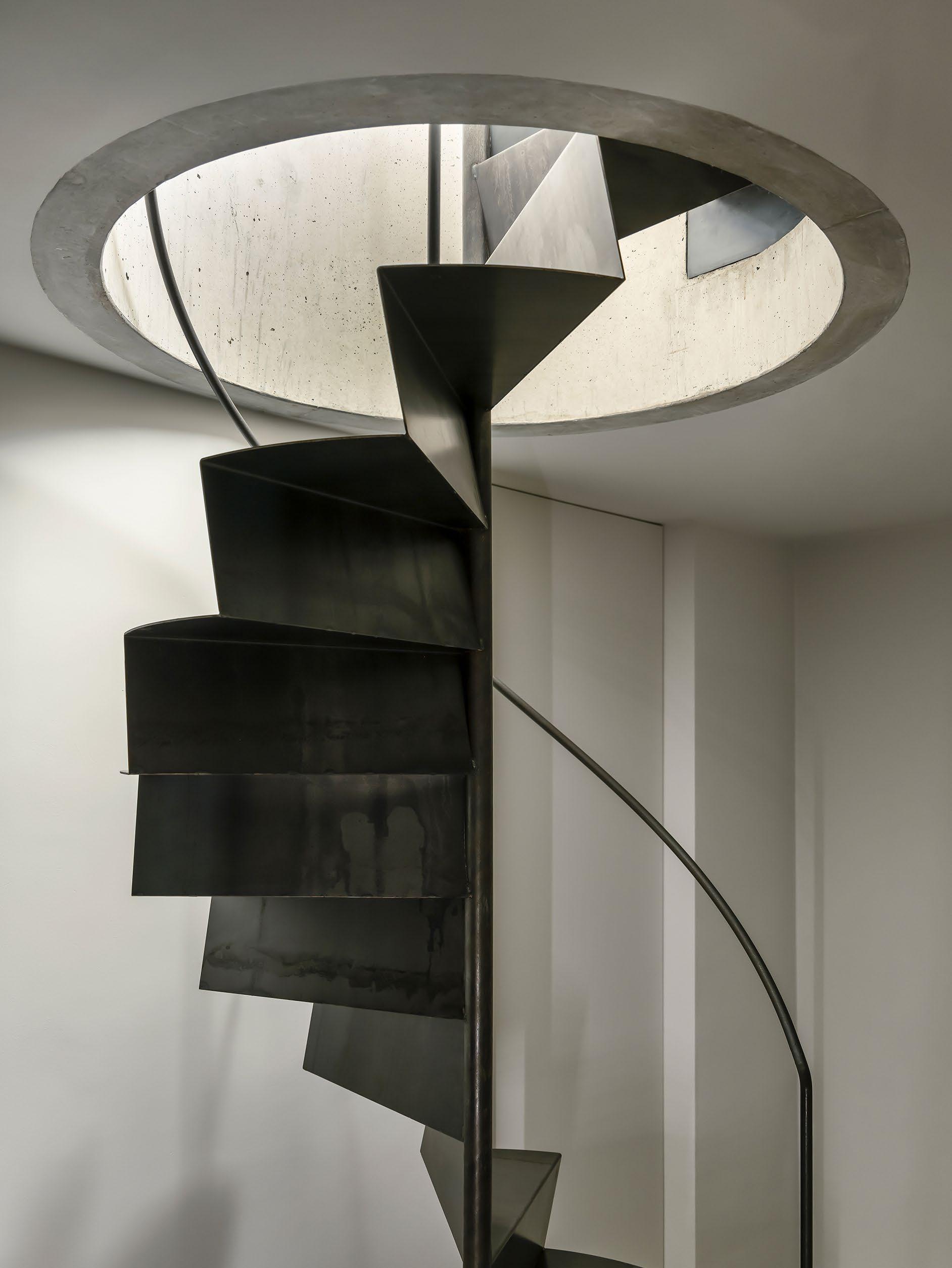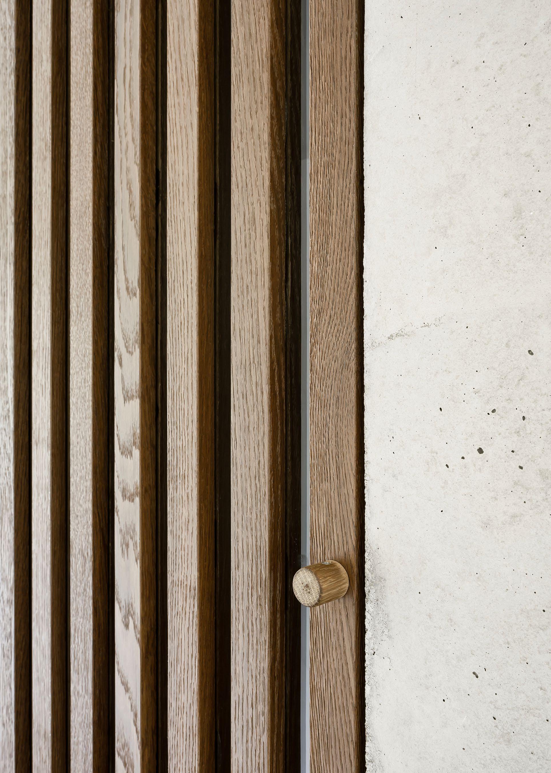 The farmstead’s functional layout accommodates a large open space for communal zones, including a generous kitchen, dining, and living space, in contrast the private spaces are all located at the opposite end of the building, across two floors via a splitlevel, steel spiral staircase. In keeping with the exterior, the interior materials are purposefully restrained with an emphasis on artisanal and raw materials such as exposed concrete, terracotta tiles from Italy, and natural stone from Germany. The subdued palette has been built around a foundation of cool greys and cream and is offset by the warmth of dark, smoked oak timber which offers a reoccurring thread throughout the home in the form of built-in joinery.
