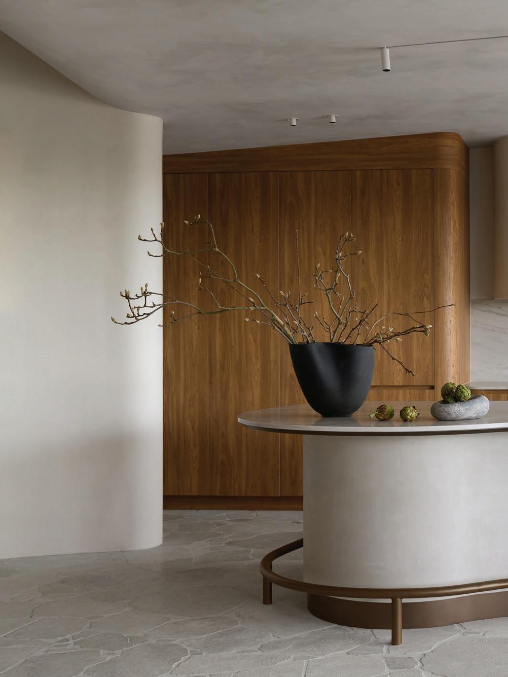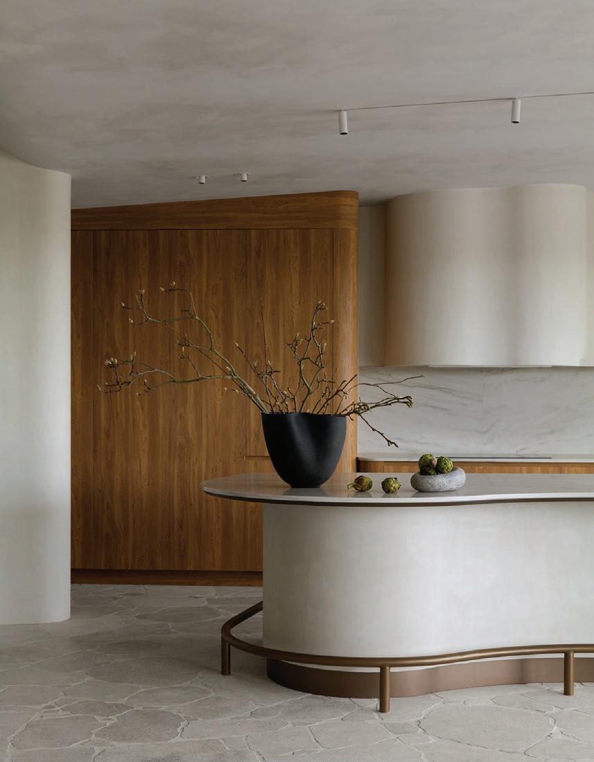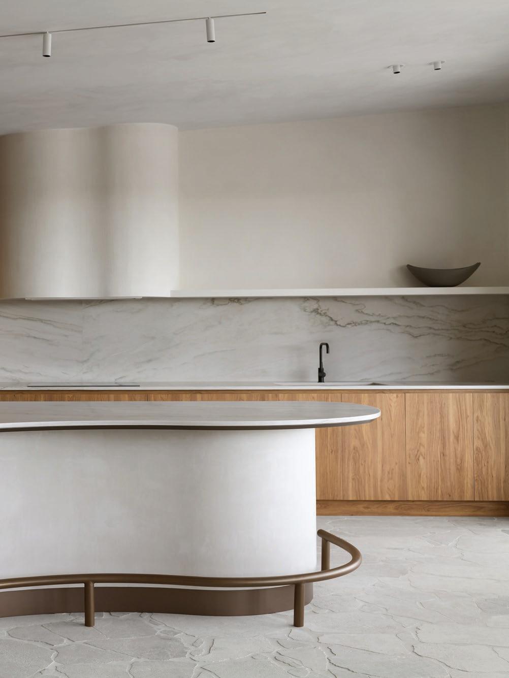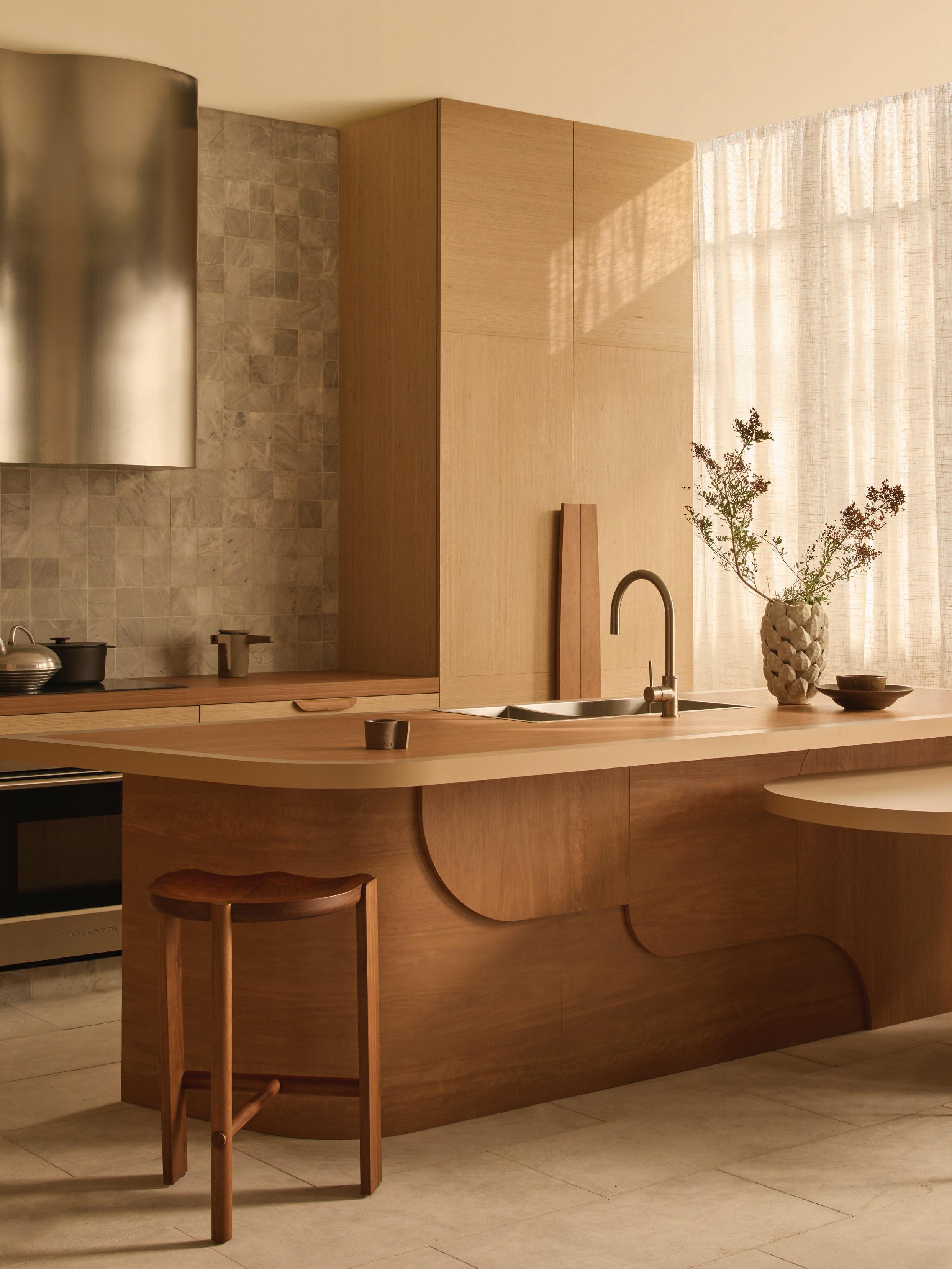 Clad in hand-applied render with a custom steel base, the island is a functional but beautiful object—a place for gathering. “Its soft, serpentine edge feels at once grounded and fluid, echoing the home’s namesake,” State of Kin director Ara Salomone notes. A palette of natural timber, finely veined stone and tonal finishes deepens the sense of warmth and tactility, inviting touch as much as admiration. Behind a seamless form lies extraordinary craftsmanship including the expertly-radiused joinery.