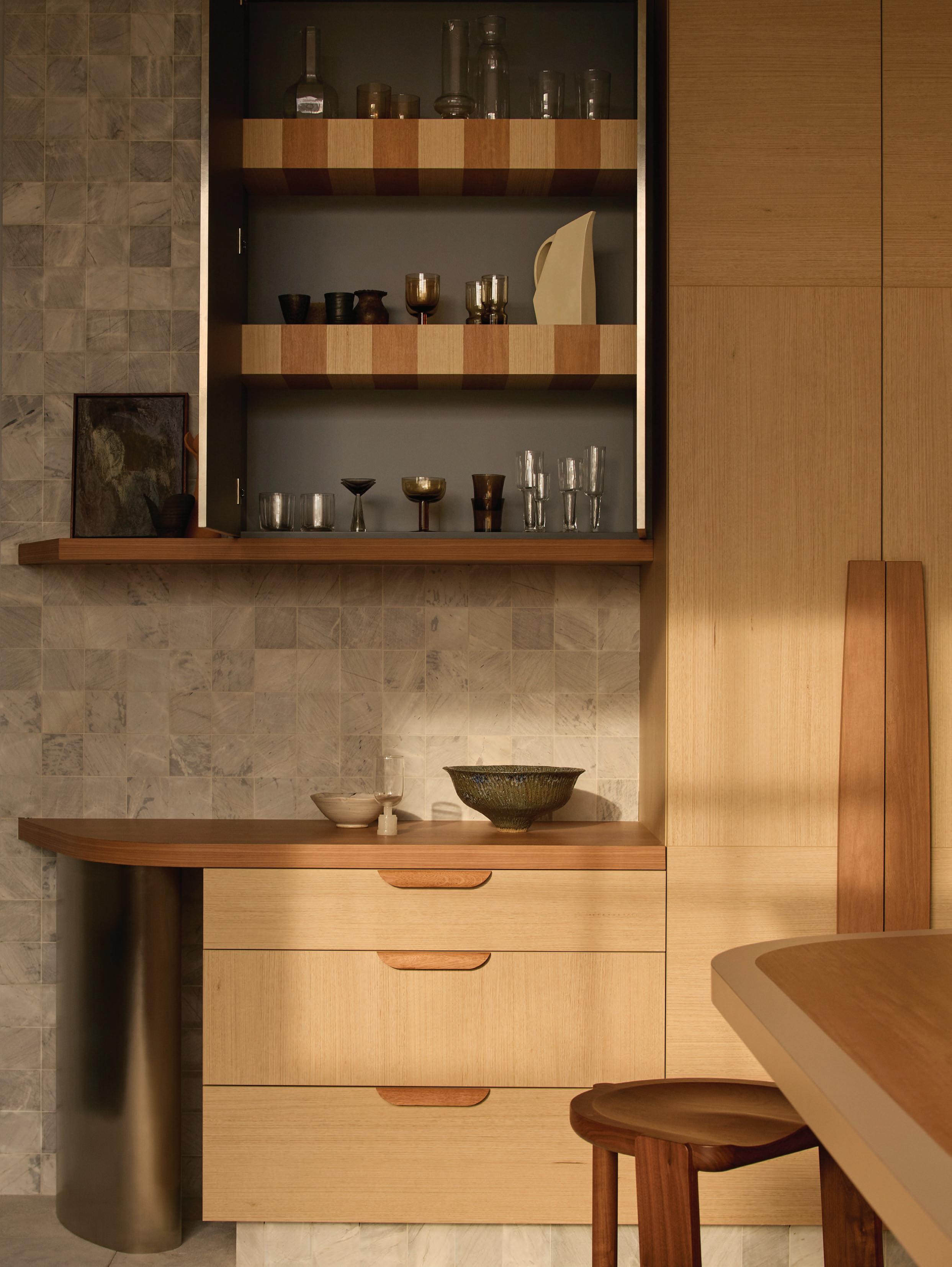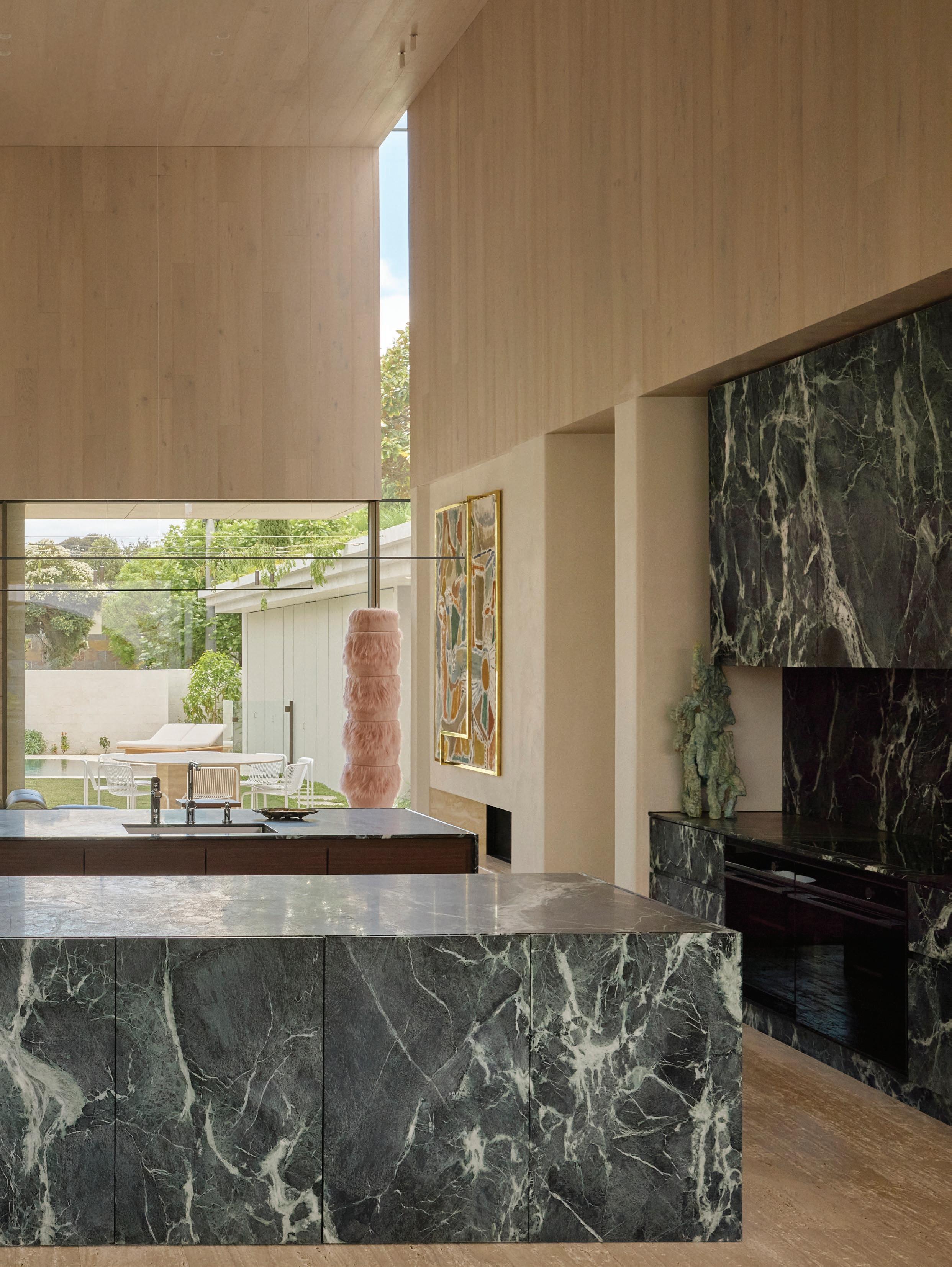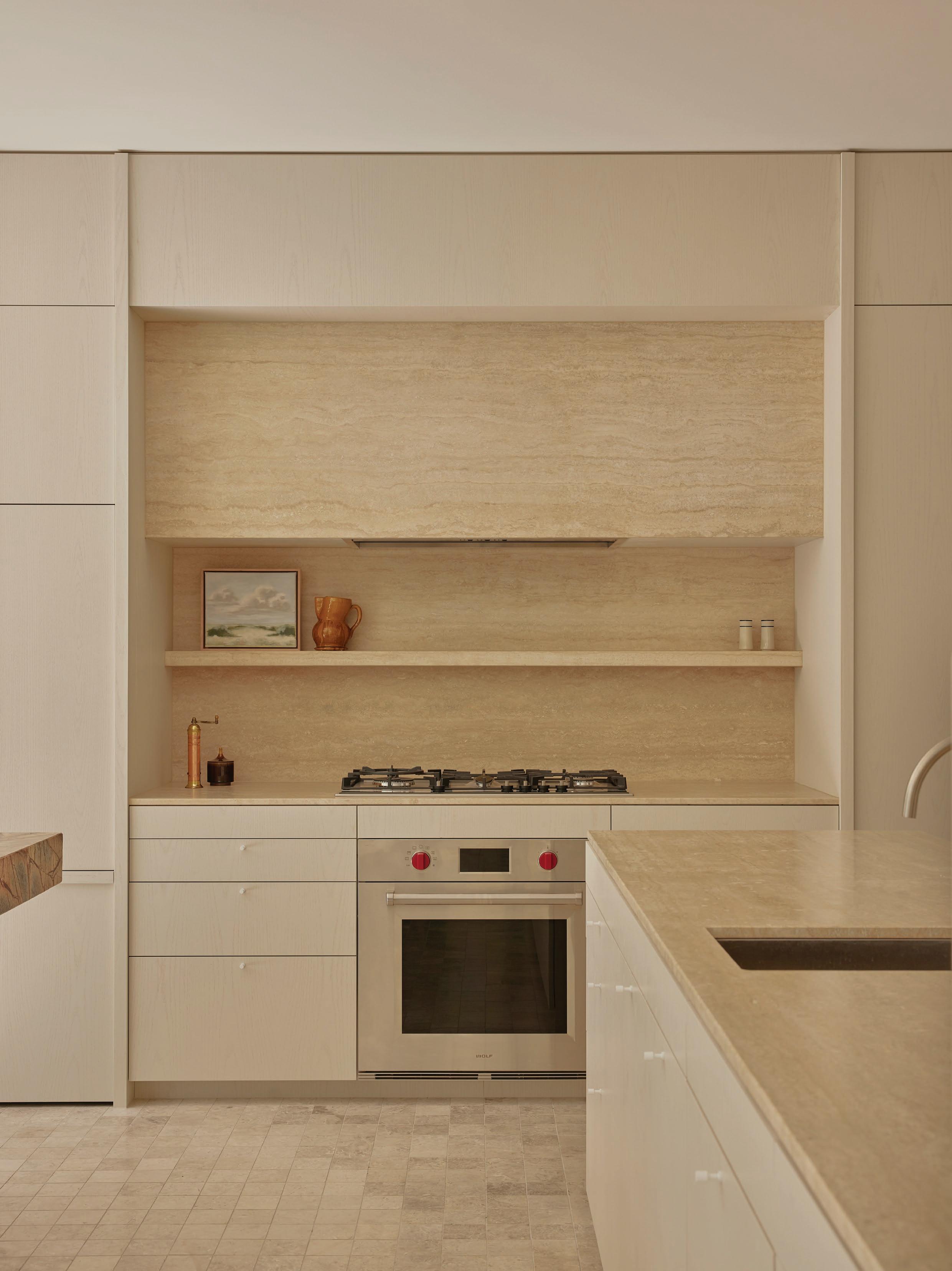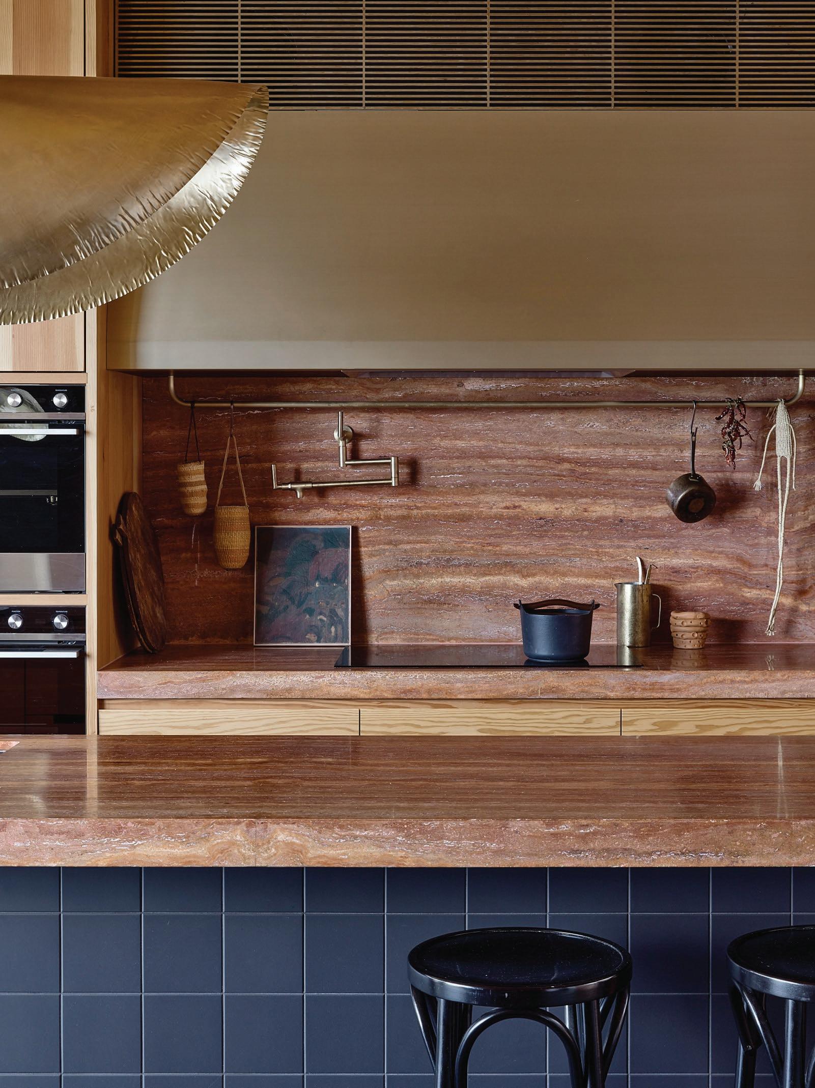 Clad in hand-applied render with a custom steel base, the island is a functional but beautiful object—a place for gathering. “Its soft, serpentine edge feels at once grounded and fluid, echoing the home’s namesake,” State of Kin director Ara Salomone notes. A palette of natural timber, finely veined stone and tonal finishes deepens the sense of warmth and tactility, inviting touch as much as admiration. Behind a seamless form lies extraordinary craftsmanship including the expertly-radiused joinery.