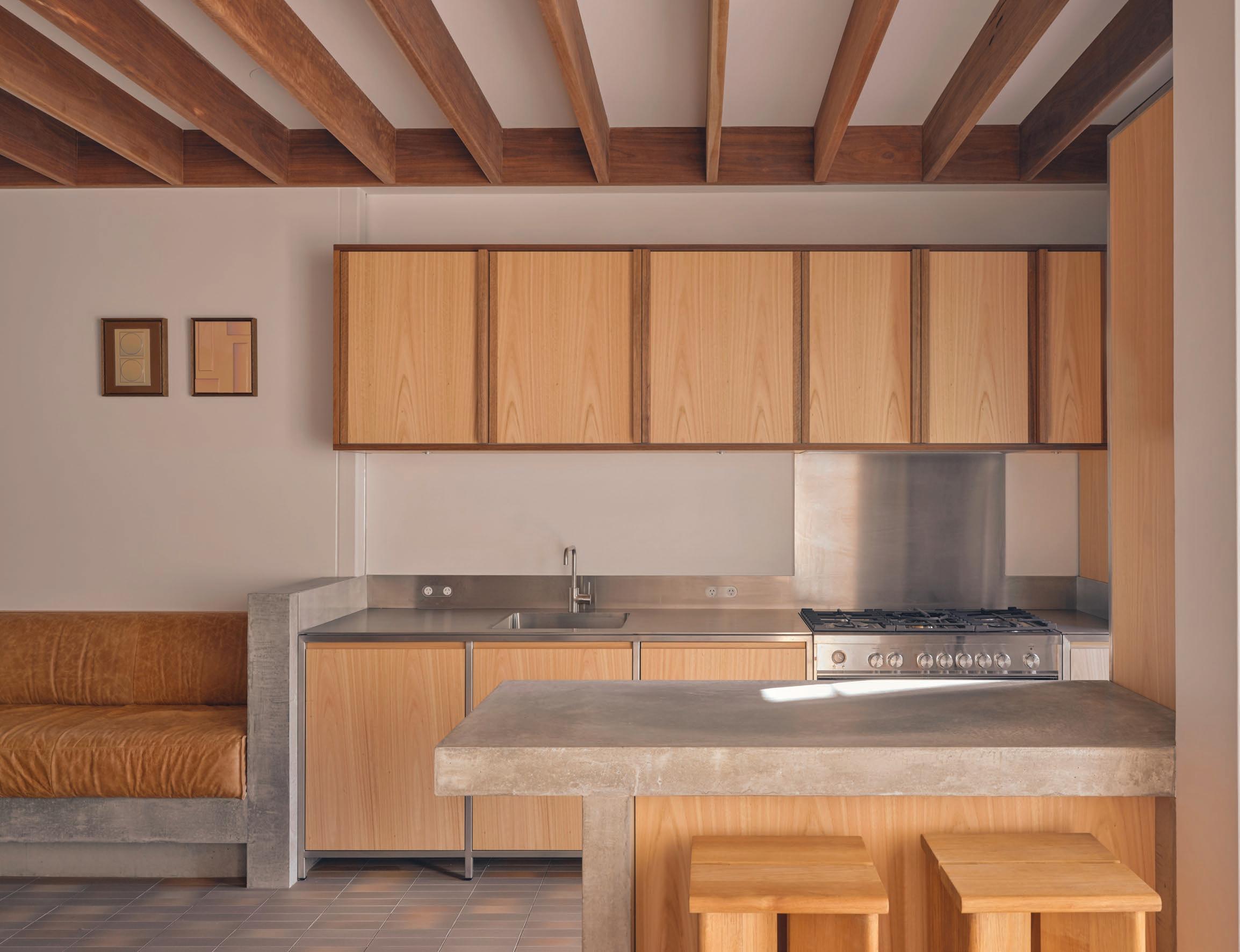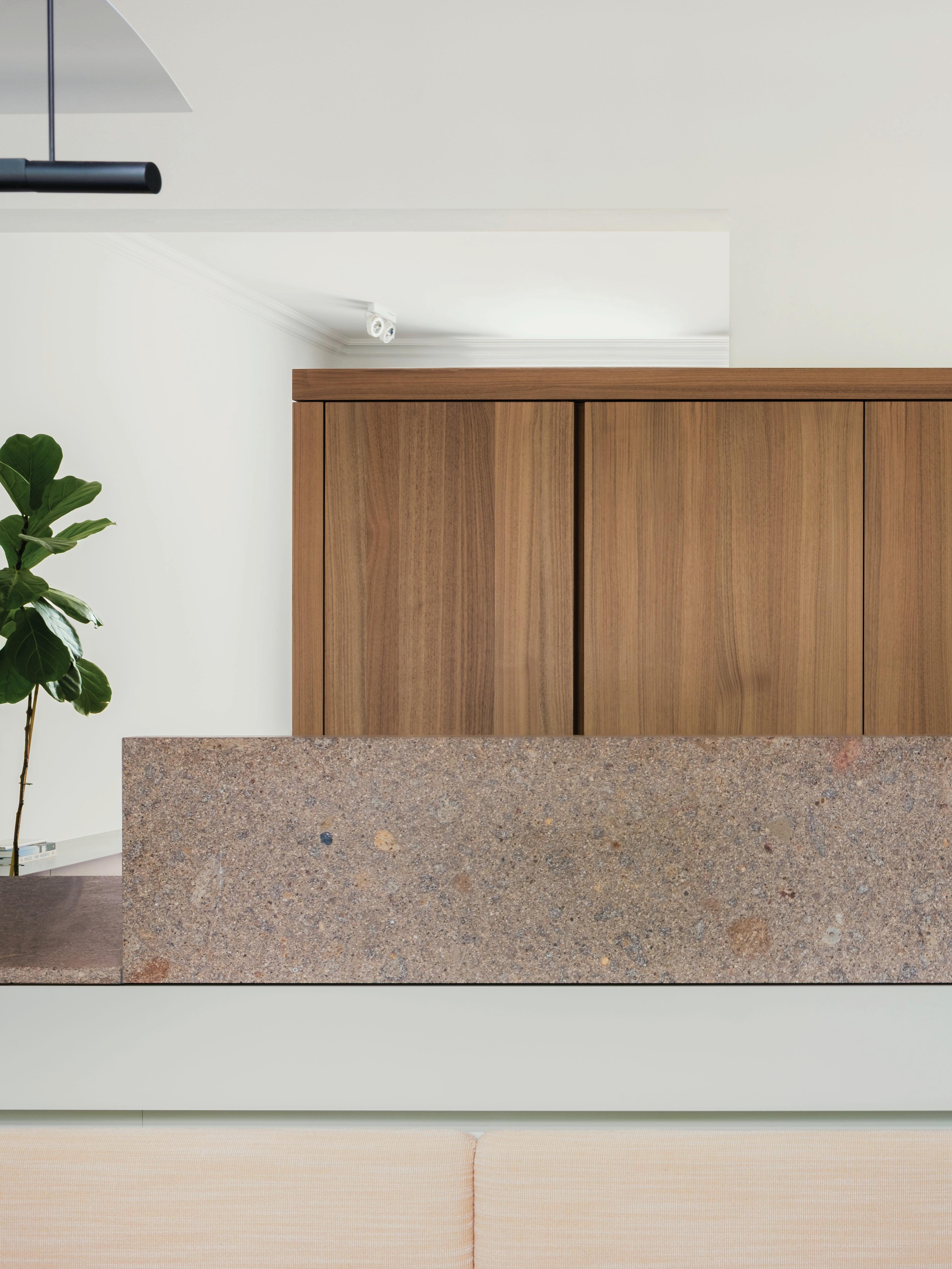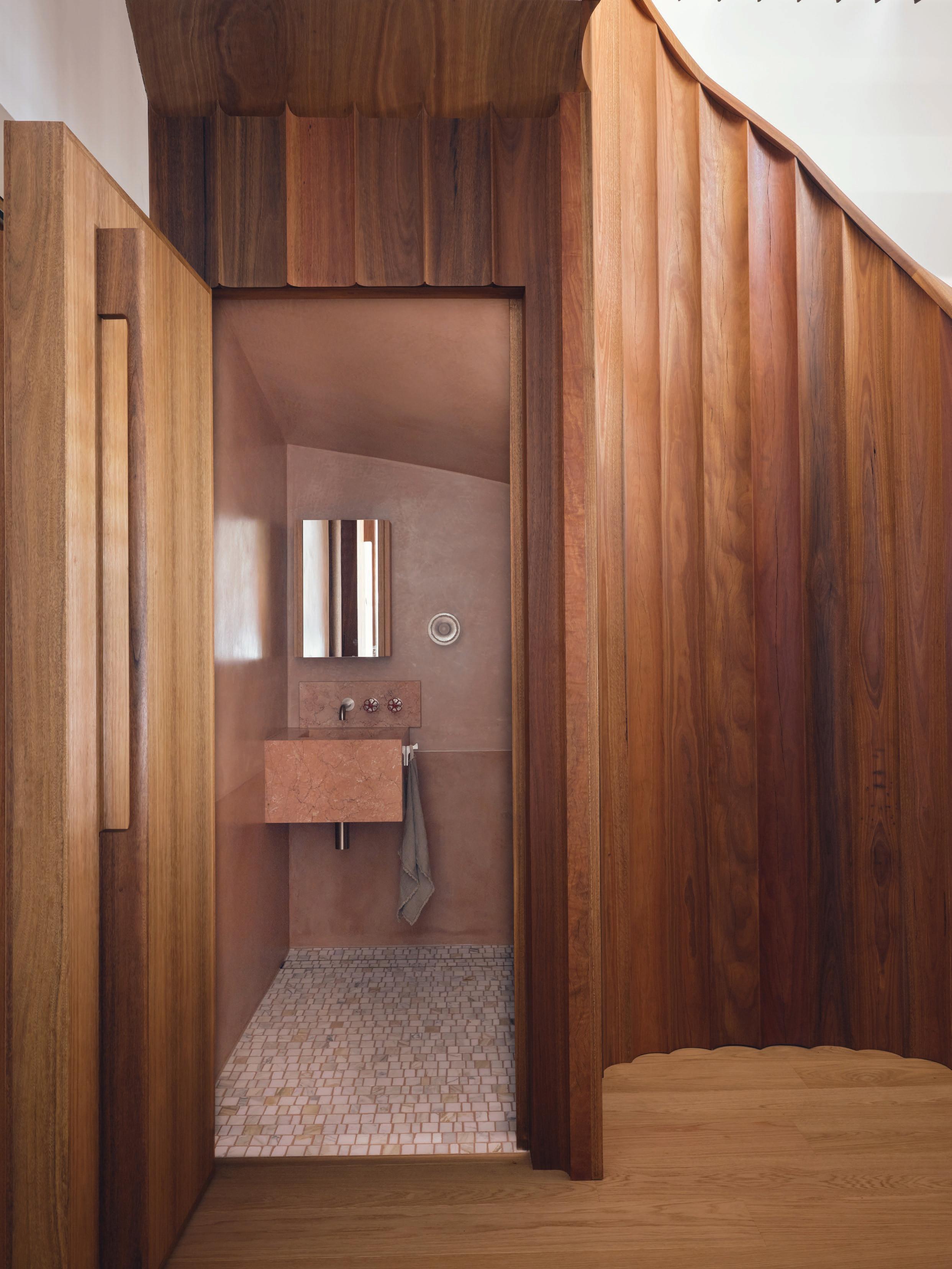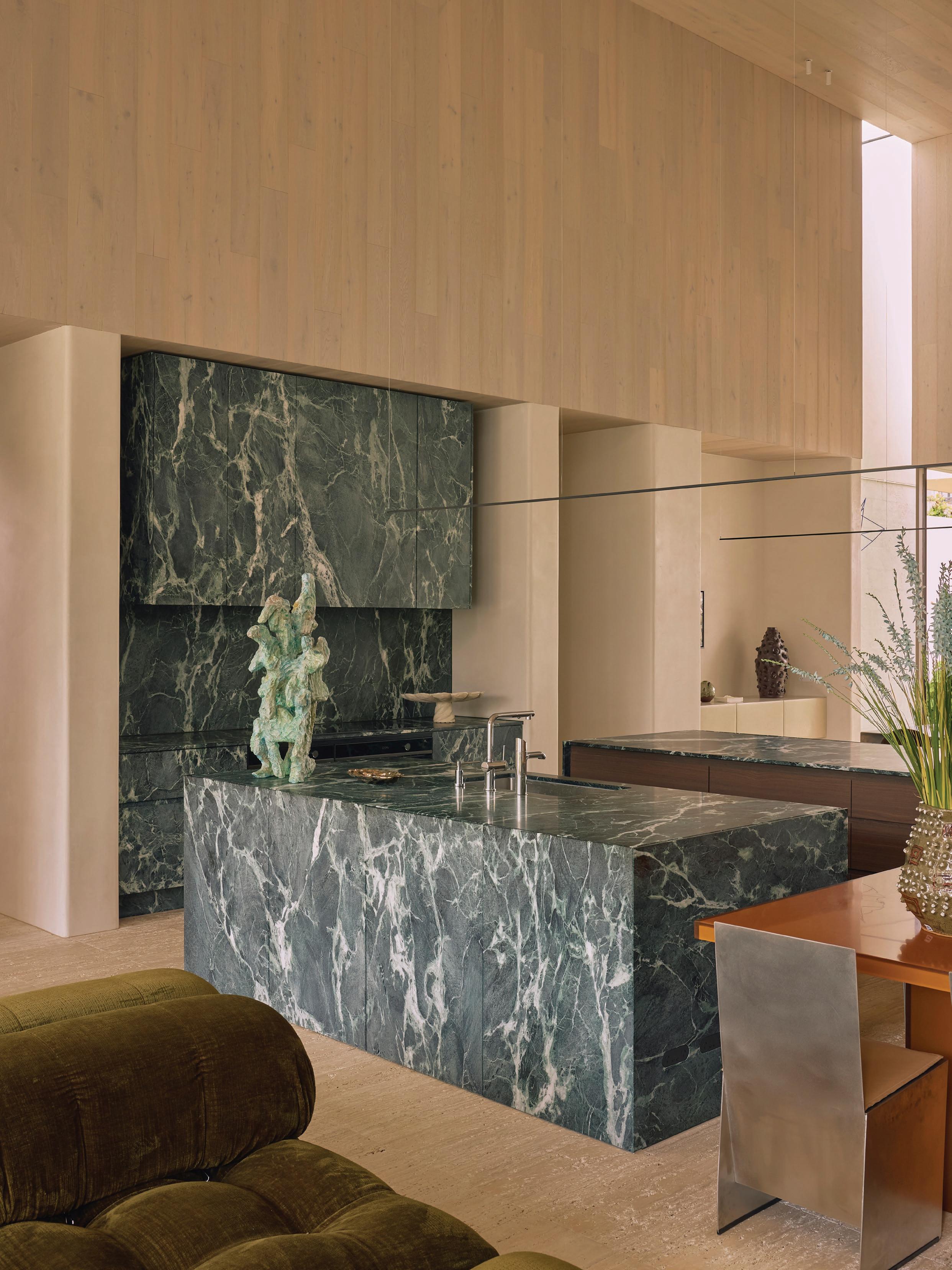 Clad in hand-applied render with a custom steel base, the island is a functional but beautiful object—a place for gathering. “Its soft, serpentine edge feels at once grounded and fluid, echoing the home’s namesake,” State of Kin director Ara Salomone notes. A palette of natural timber, finely veined stone and tonal finishes deepens the sense of warmth and tactility, inviting touch as much as admiration. Behind a seamless form lies extraordinary craftsmanship including the expertly-radiused joinery.