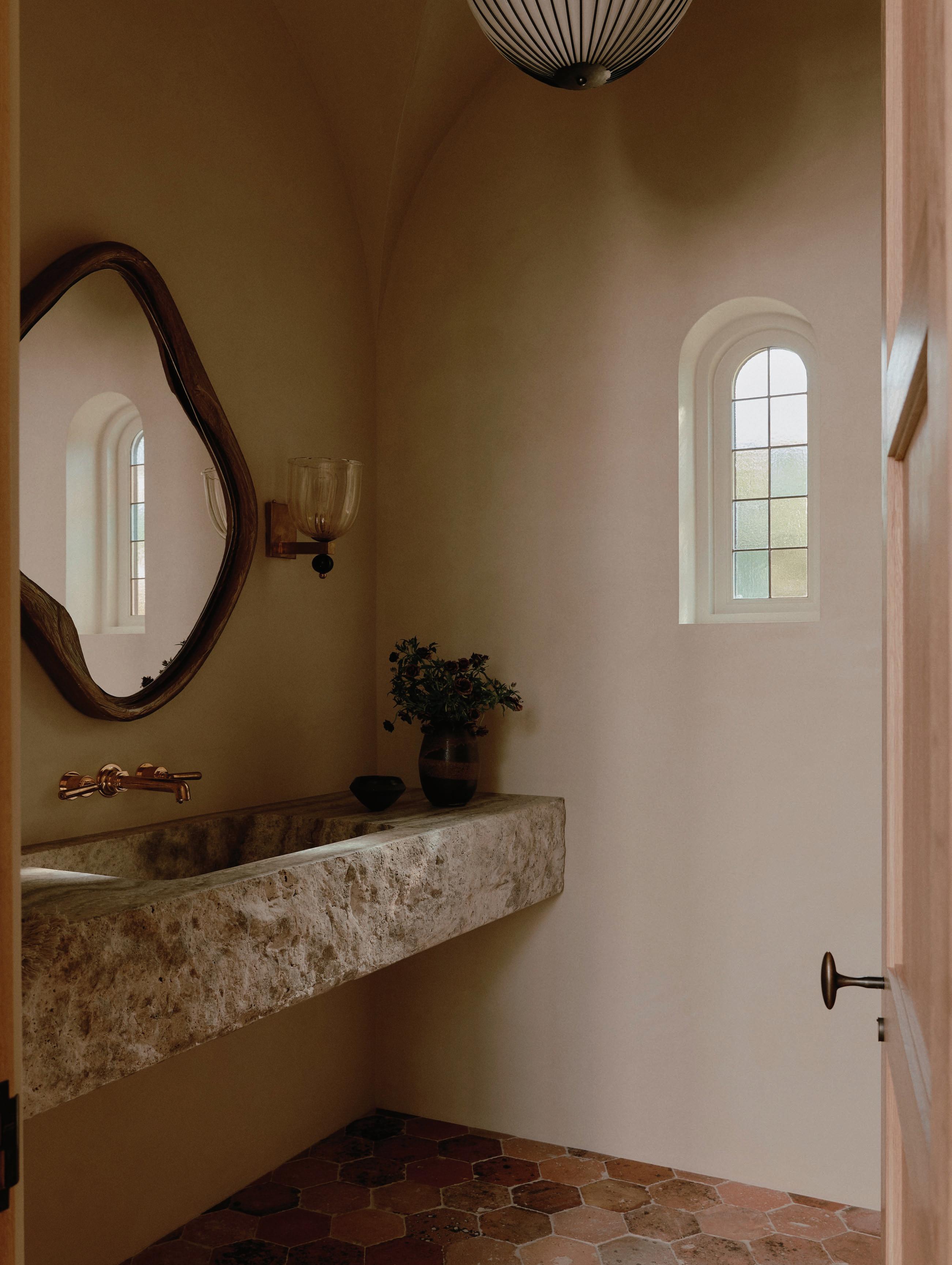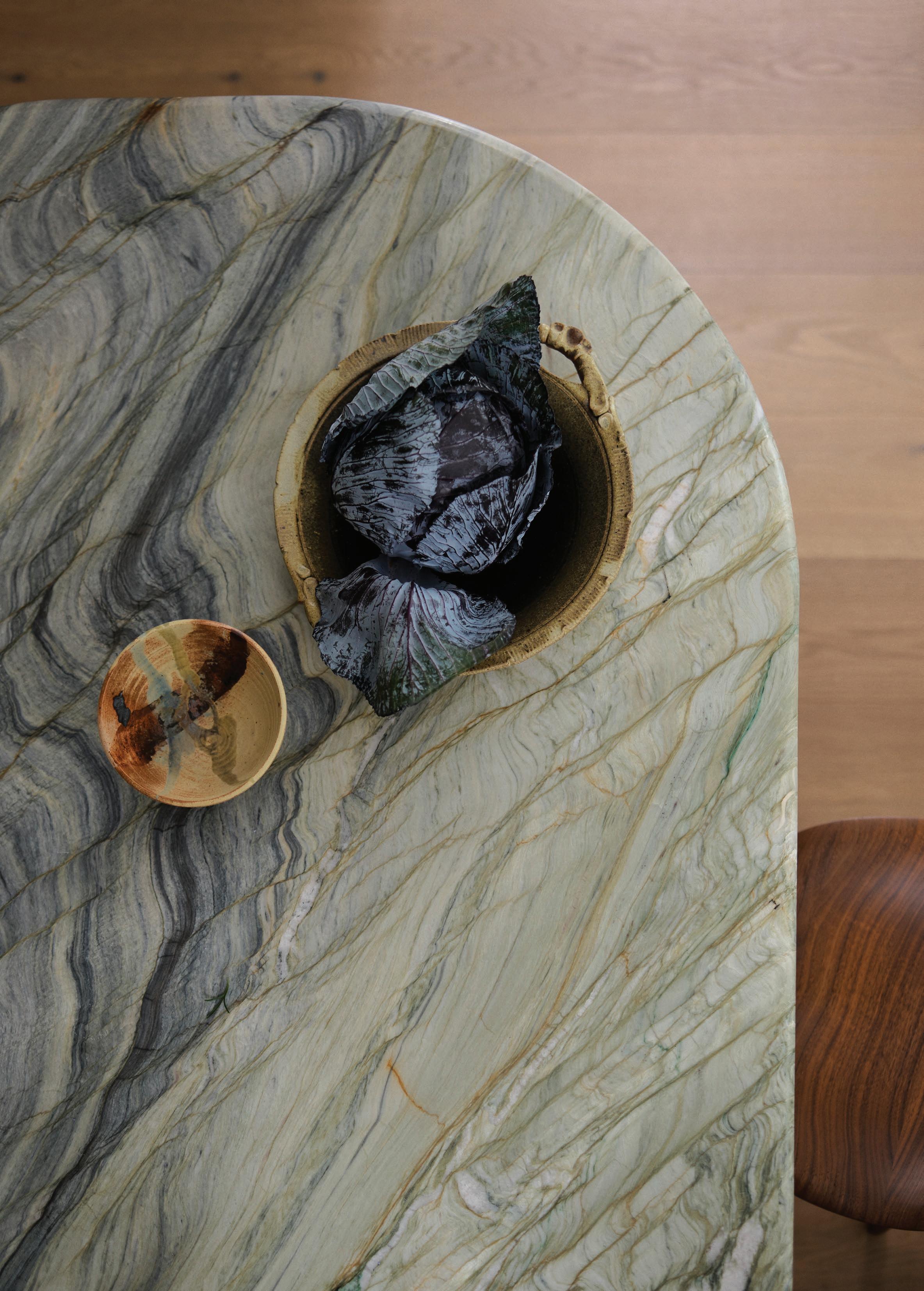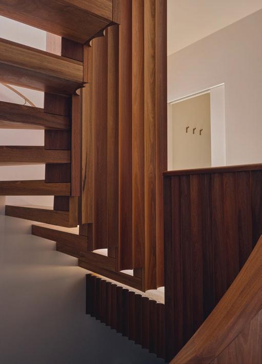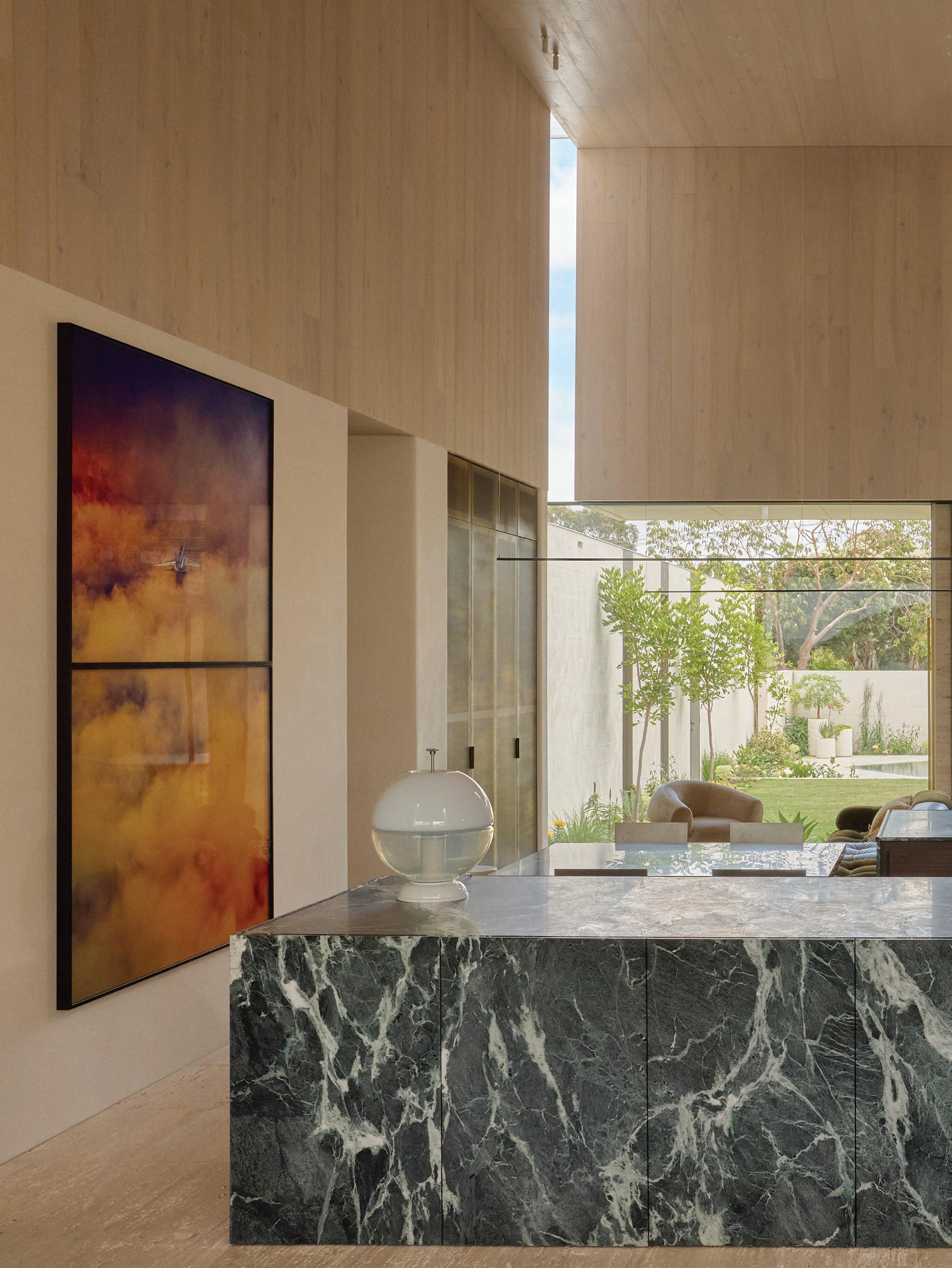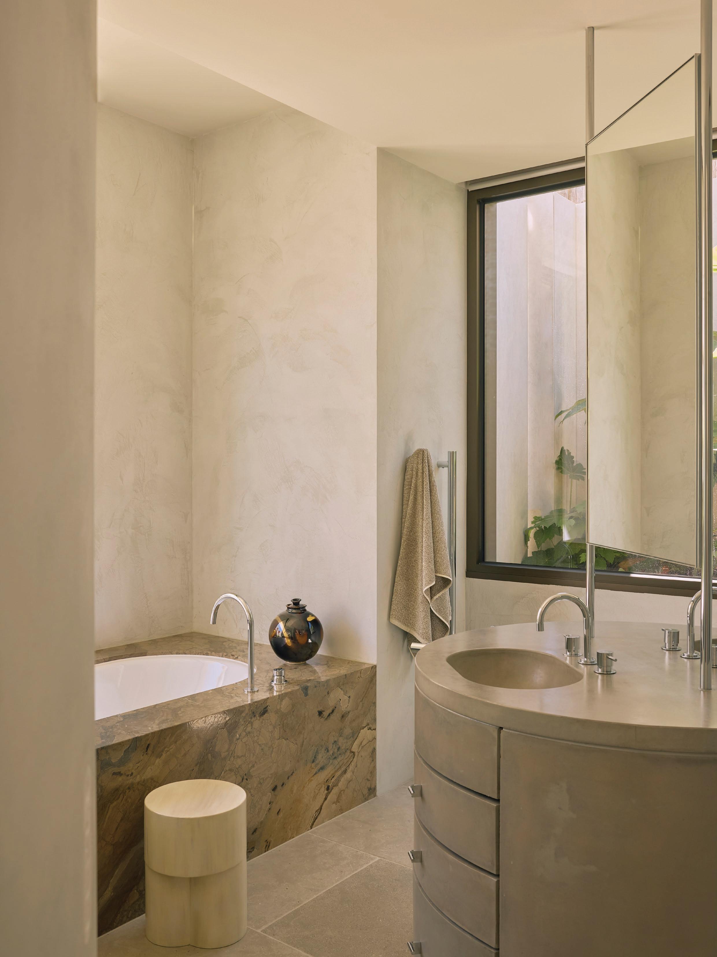 Clad in hand-applied render with a custom steel base, the island is a functional but beautiful object—a place for gathering. “Its soft, serpentine edge feels at once grounded and fluid, echoing the home’s namesake,” State of Kin director Ara Salomone notes. A palette of natural timber, finely veined stone and tonal finishes deepens the sense of warmth and tactility, inviting touch as much as admiration. Behind a seamless form lies extraordinary craftsmanship including the expertly-radiused joinery.