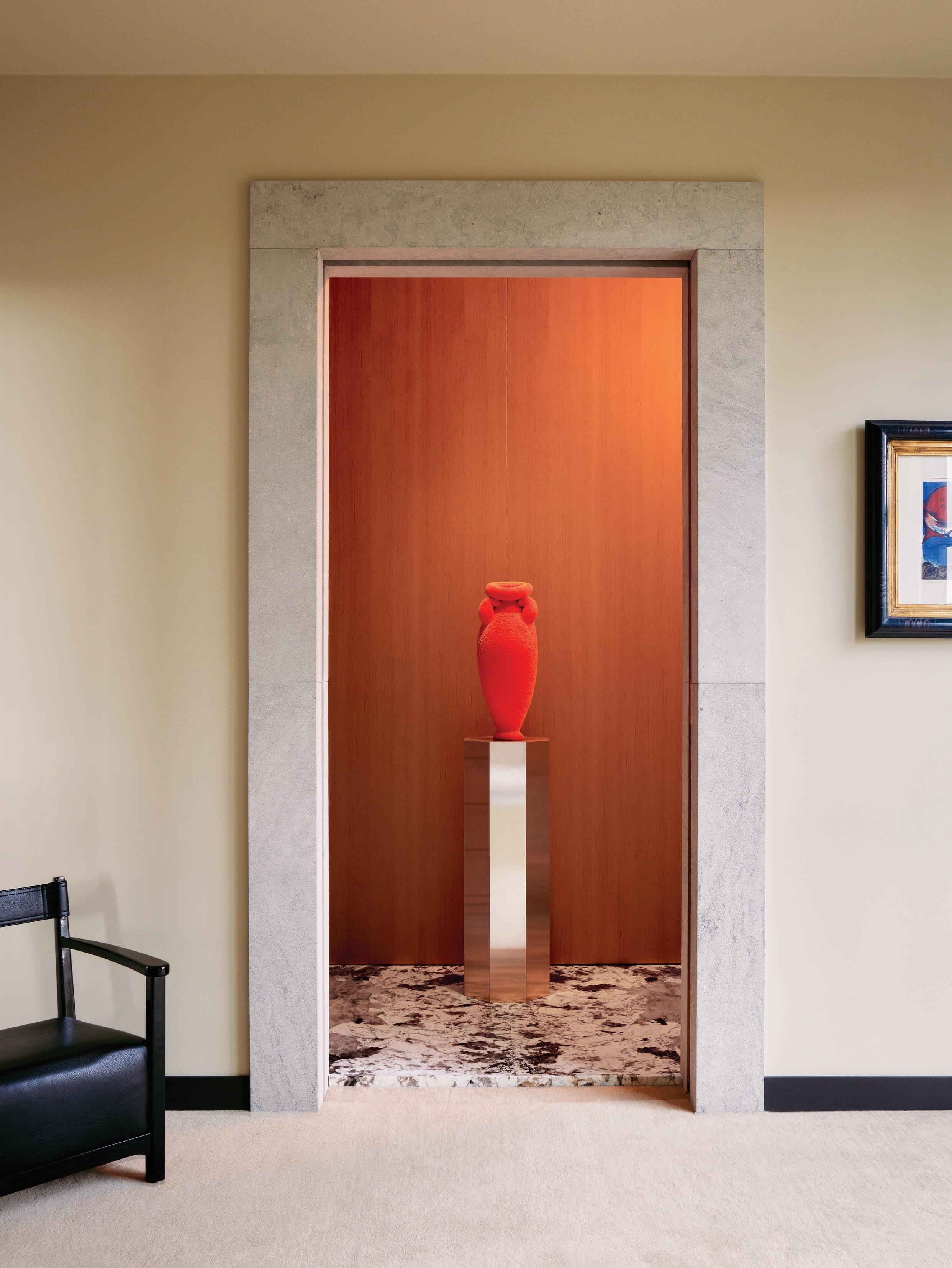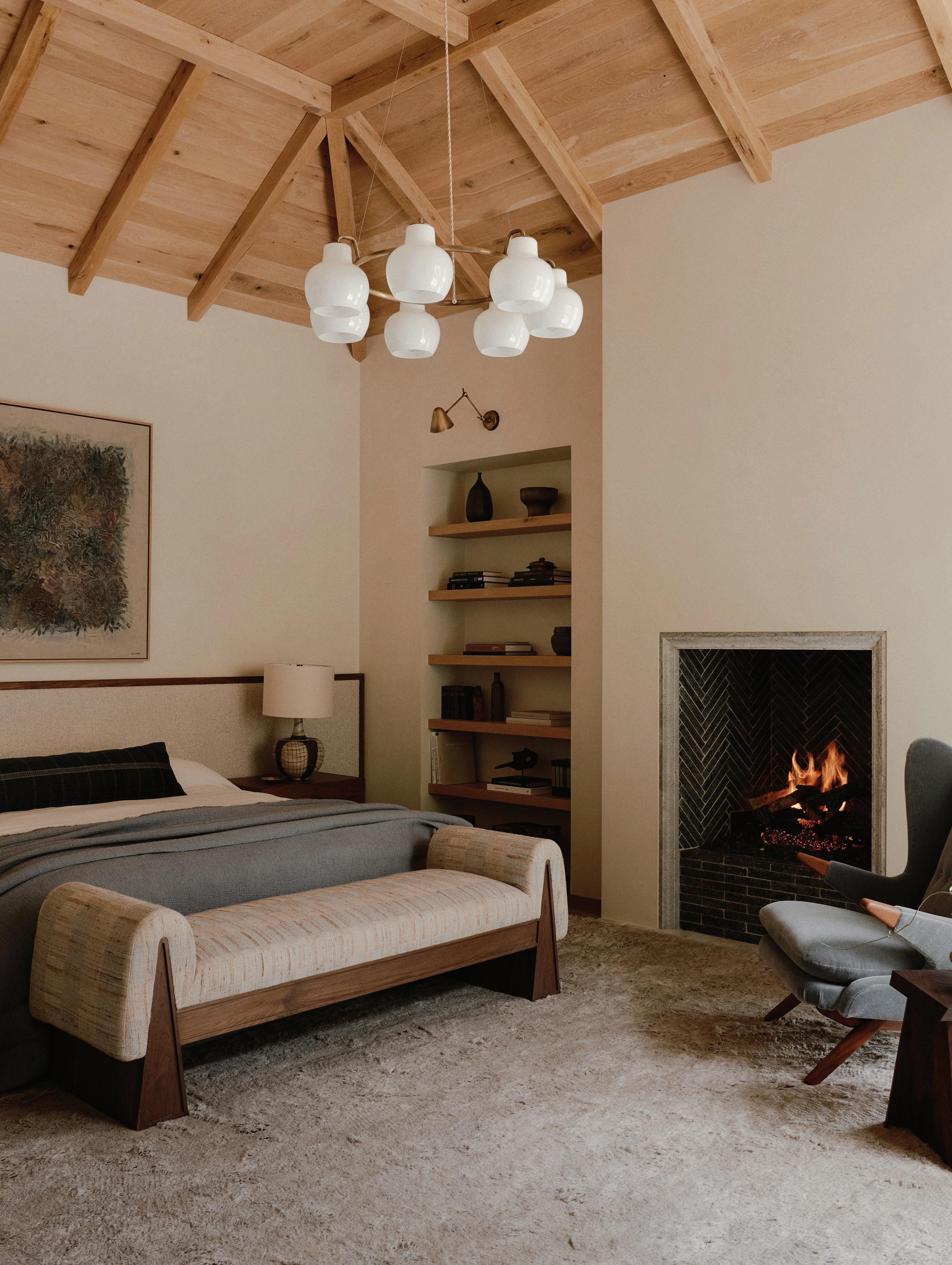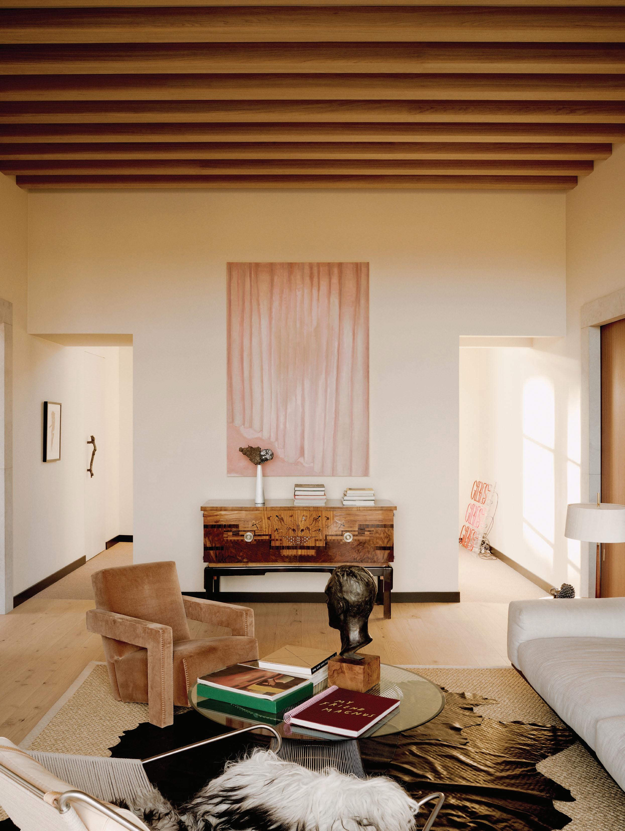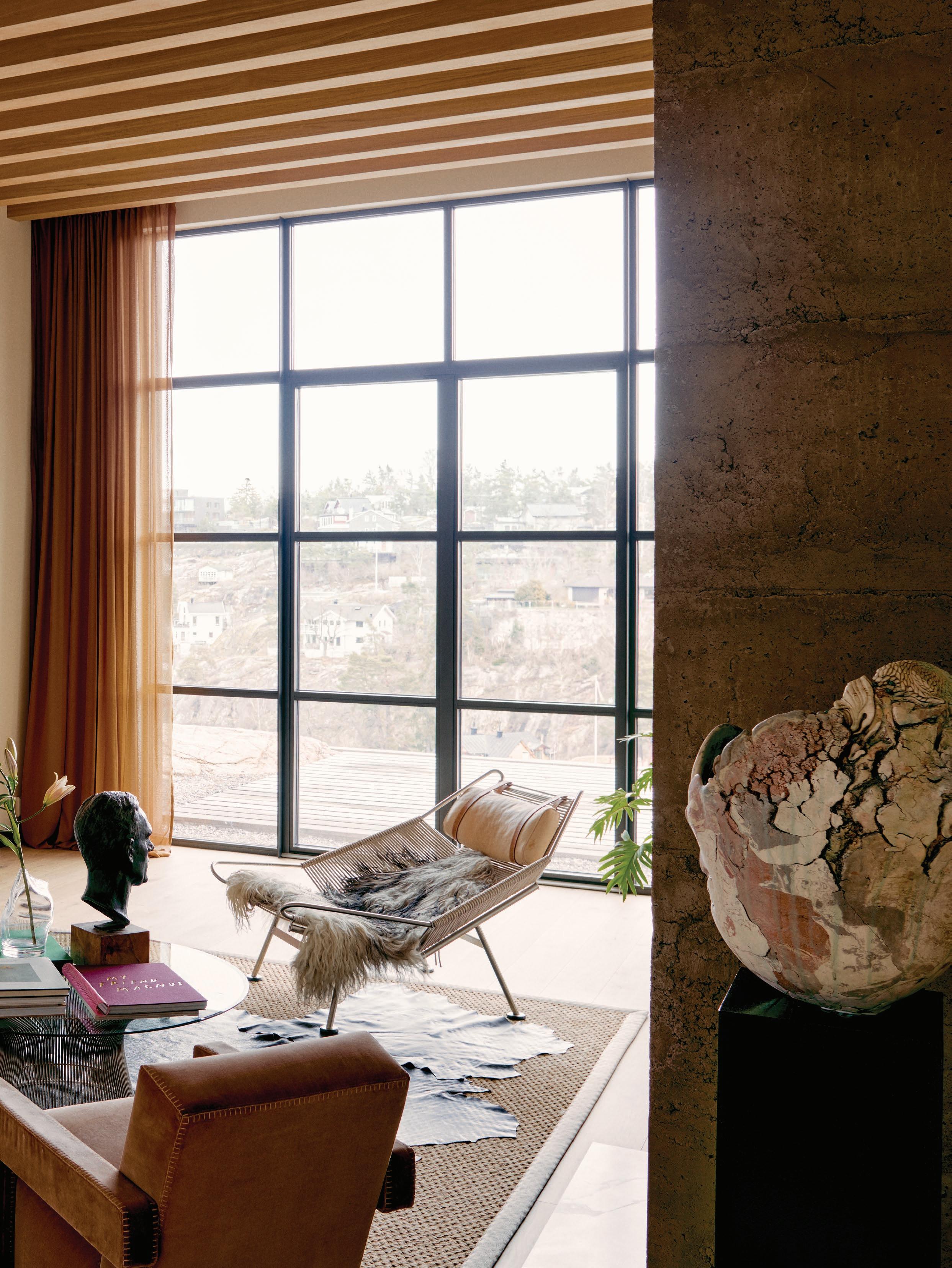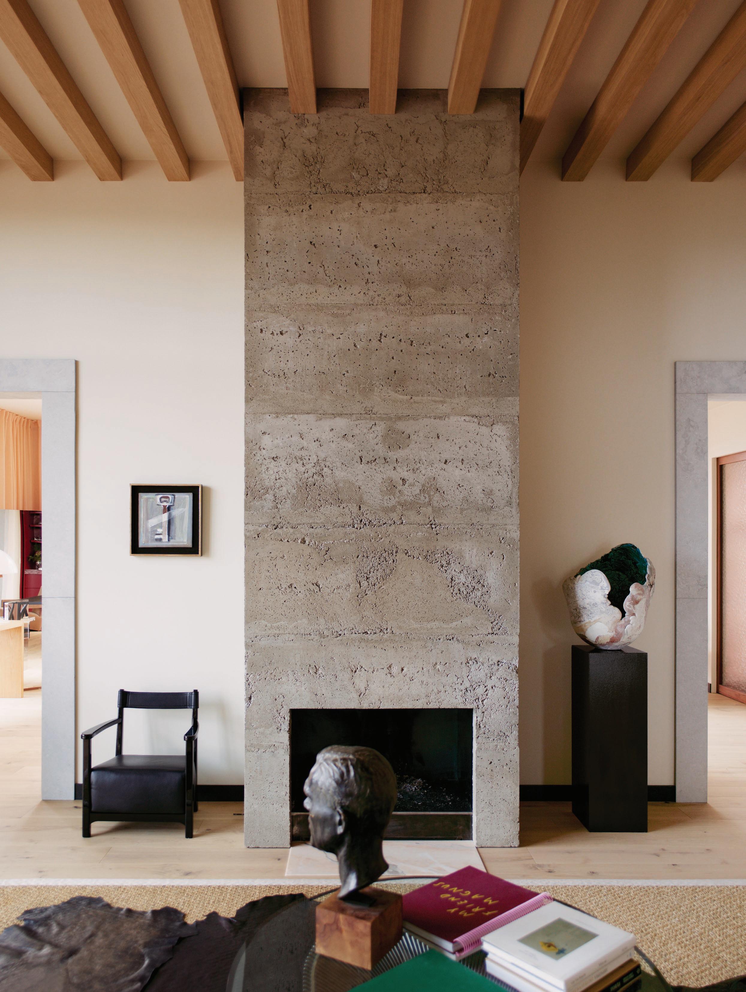 This page: Designed for entertaining and social interaction, the home’s main light-filled living spaces exude a warm ambience. The living room features high wooden ceilings and a statement concrete fireplace, forming part of an interplay between light, materiality, and texture. A Cassina Utrecht armchair by Gerrit Thomas Rietveld sits alongside a Knoll Platner coffee table by Warren Platner, a PP Møbler PP225 Flag Halyard chair by Hans J. Wegner, and a Muuto In Situ Modular sofa. Opposite page: The entrance features a curved ceiling that channels natural light into the home, showcasing a collection of art—including a marble sculpture by artist Jesper Sundberg Örtegren.