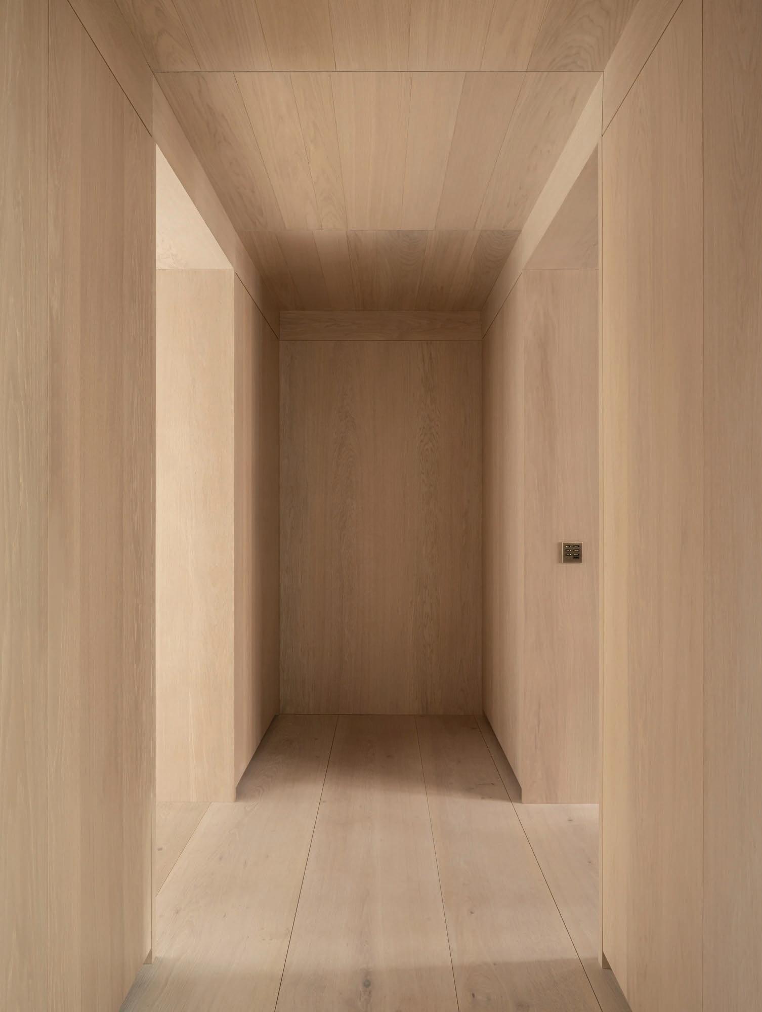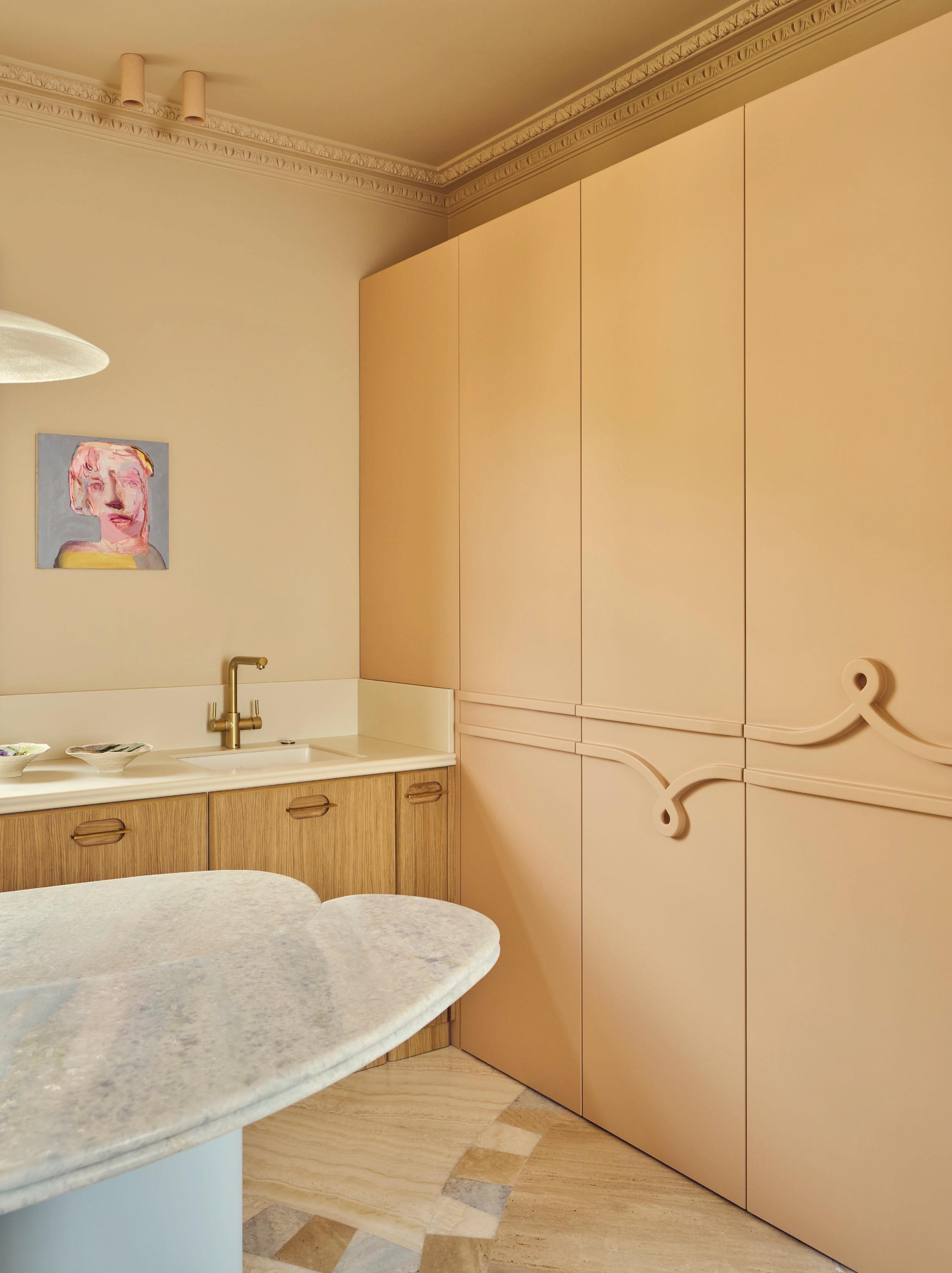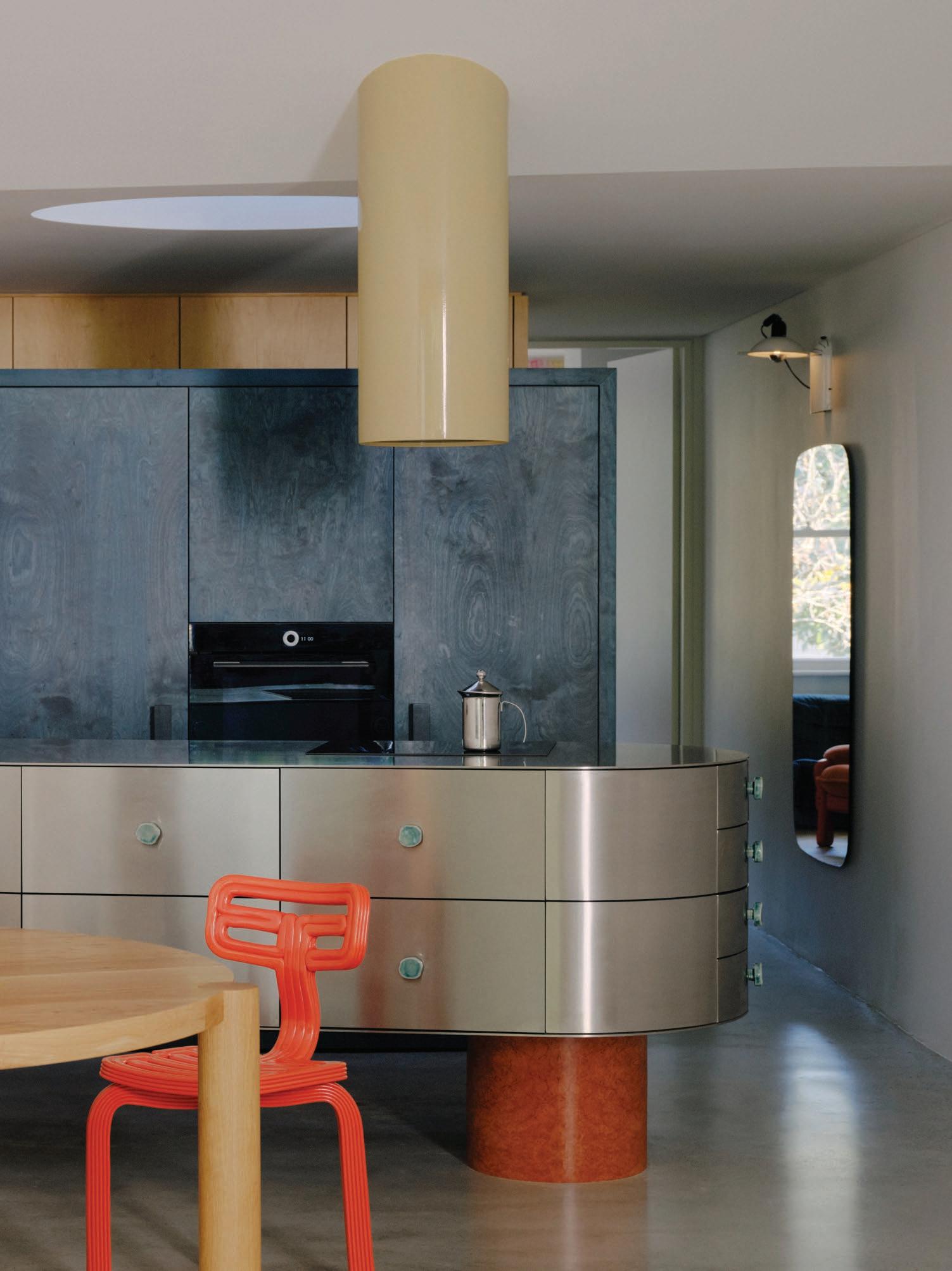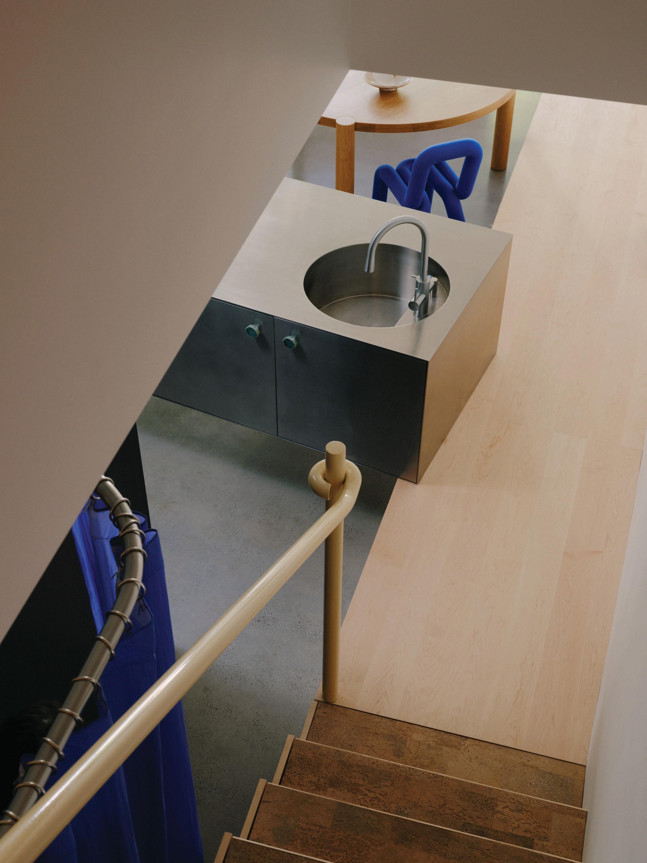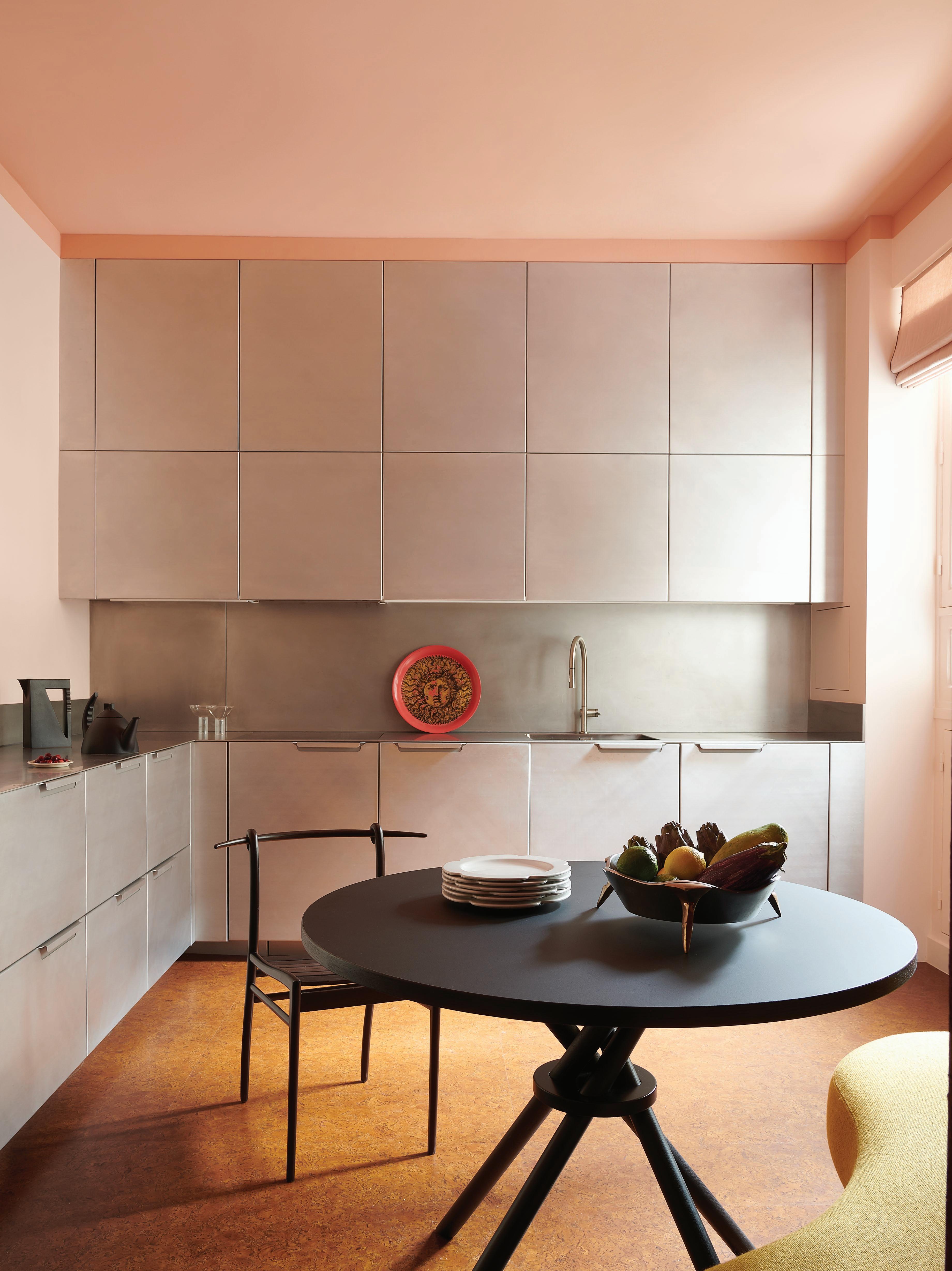 Built around a balance of industrial and sensual elements, the kitchen pairs brushed stainless steel cabinetry with cork flooring and a soft peach-toned ceiling, landing on a graphic yet inviting tone. A curved partition folds into the corner, giving structure to the space while softening its edges. An industrial-esque Castiglioni Stilnovo pendant light asserts the room’s cross-disciplinary sensibility. Every surface has been custom crafted in close collaboration with artisans, reflecting a deep dialogue between concept and craft.