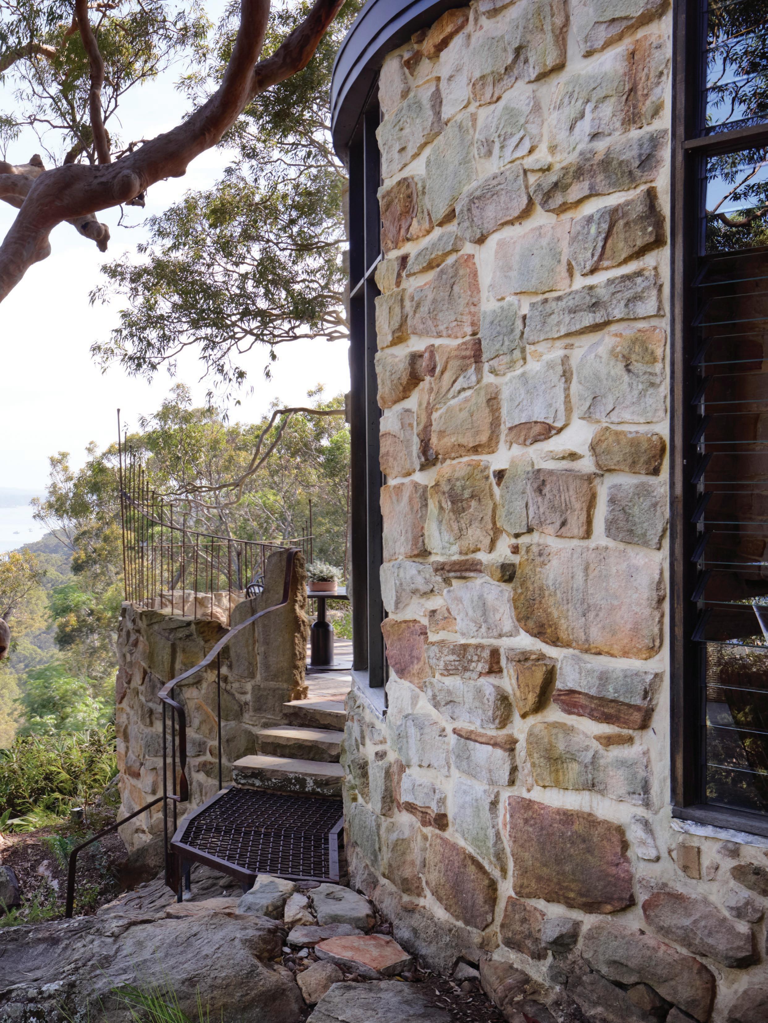 This page: Rough-sawn pine planks define the home’s façade, creating a sense of contextual authenticity with its surrounding natural environment. Opposite page: Structural stone elements integrate seamlessly with the landscape’s imposing natural rock formations. In the sunken atrium—designed to bring natural light into the home’s lower levels—a grouping of Montana Pantonova Concave chairs by Verner Panton sit alongside a marble sculpture by artist Jesper Sundberg Örtegren.