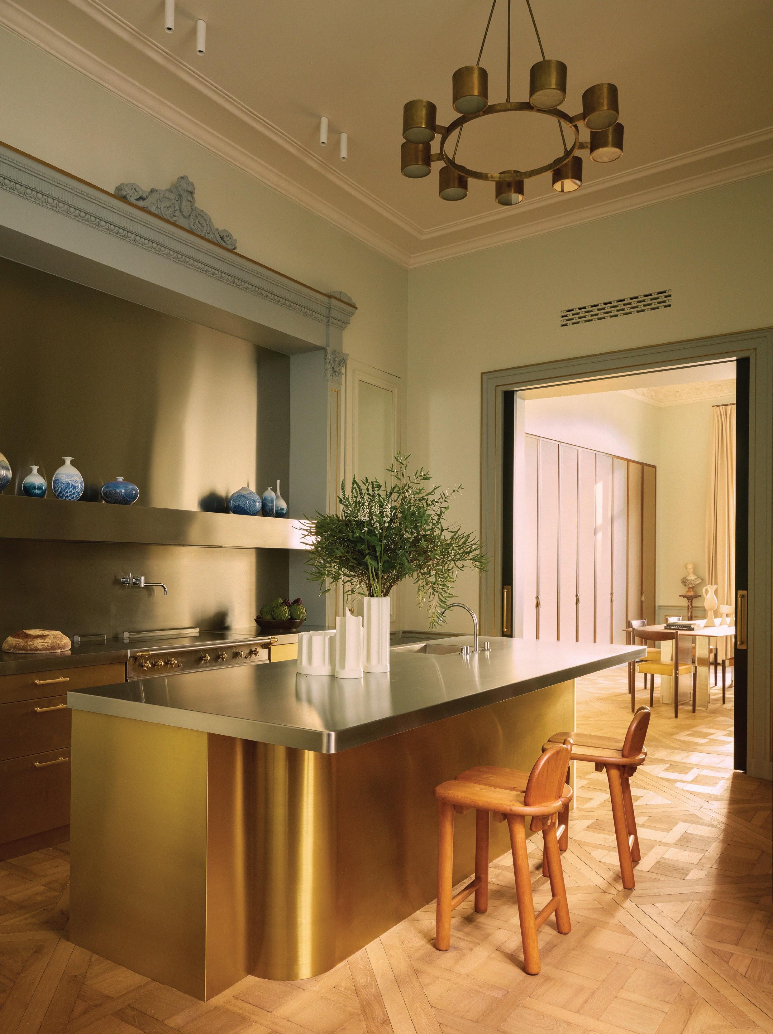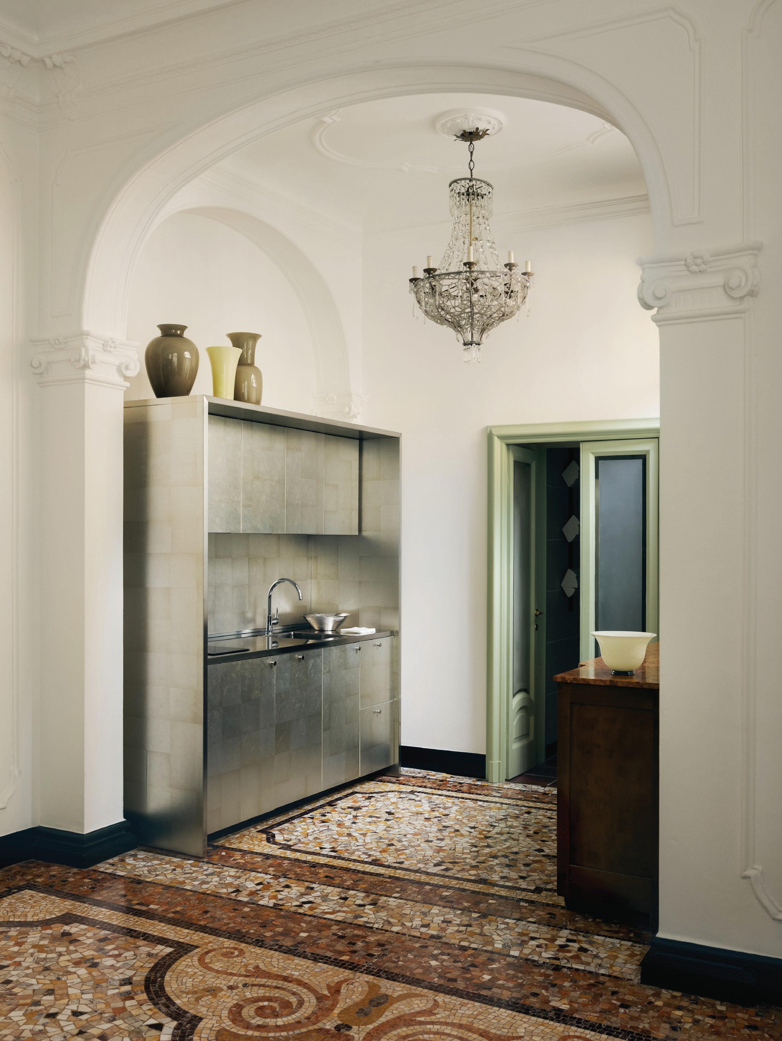 In their own Milan pied-à-terre, design studio Tutto Bene crafts a quiet meditation on form, ritual and time. The jewel of the space is a compact kitchen cube, layered with square silver leaf details. An object within the bones of the palazzo architecture, the kitchen joinery was created through a painstaking artisanal process. This luminous volume is a sculptural focal point, where preparation becomes performance and everyday rituals are elevated to ceremony.