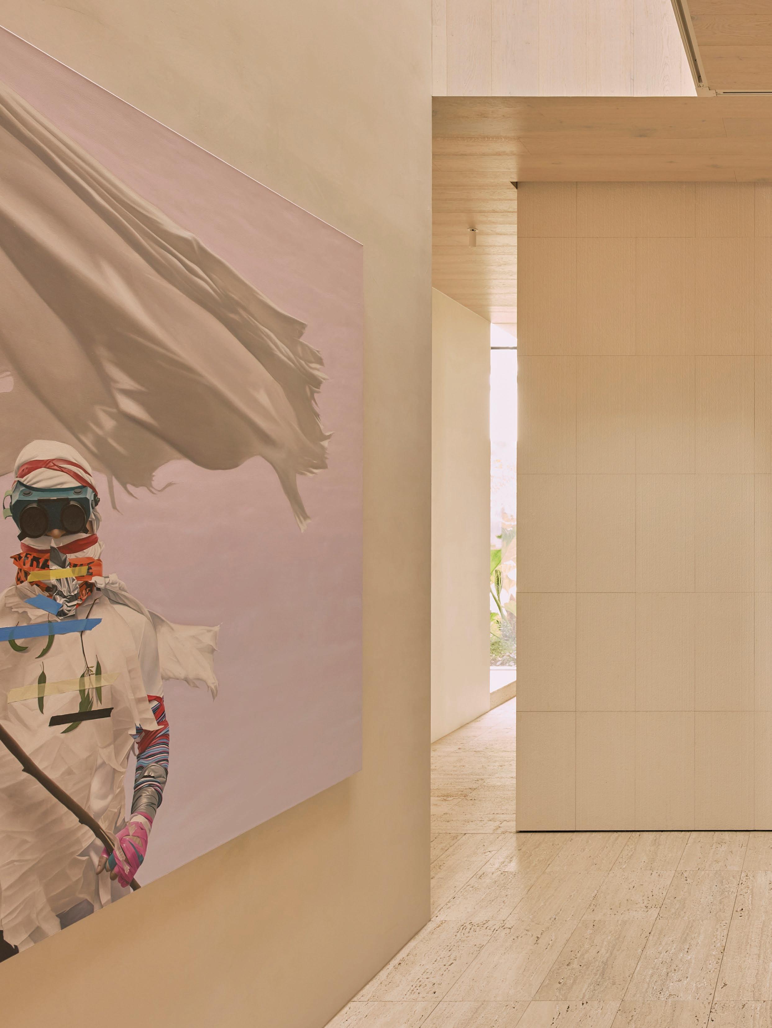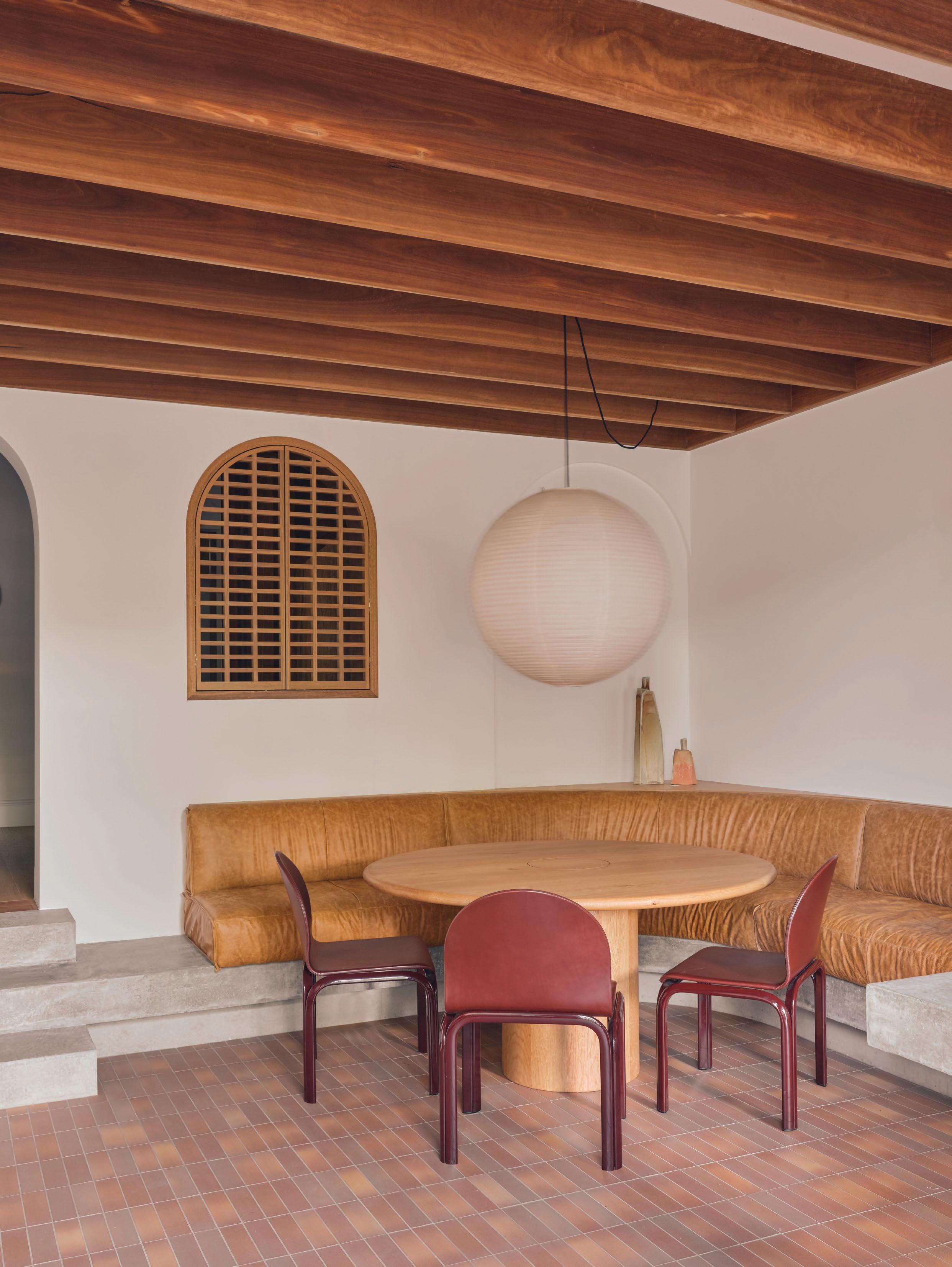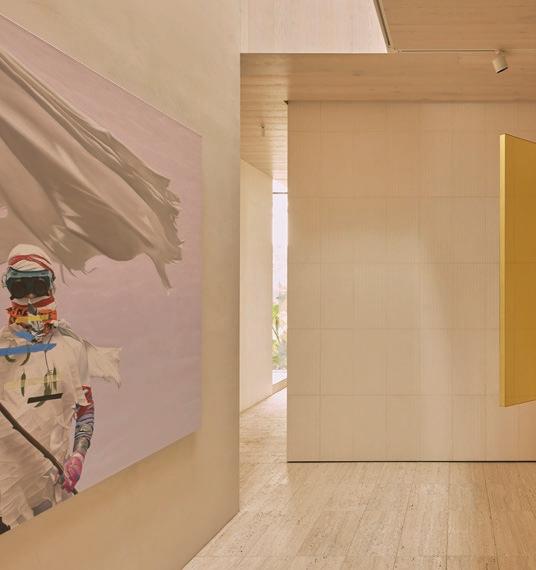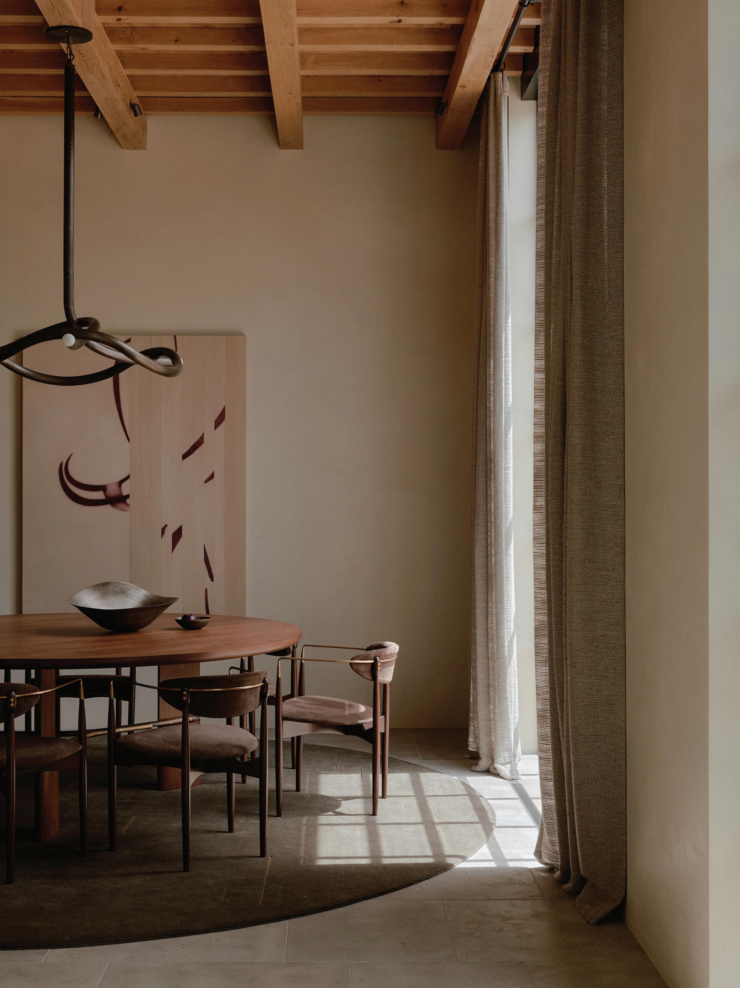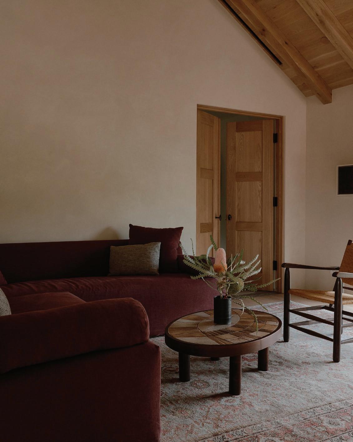 This page: Structural elements such as sandstone doorframes create a sense of effortless sophistication throughout the home. Opposite page: Cognac-toned timber cabinets and custom furnishings unify the spaces, complementing warm off-white tones applied on walls.