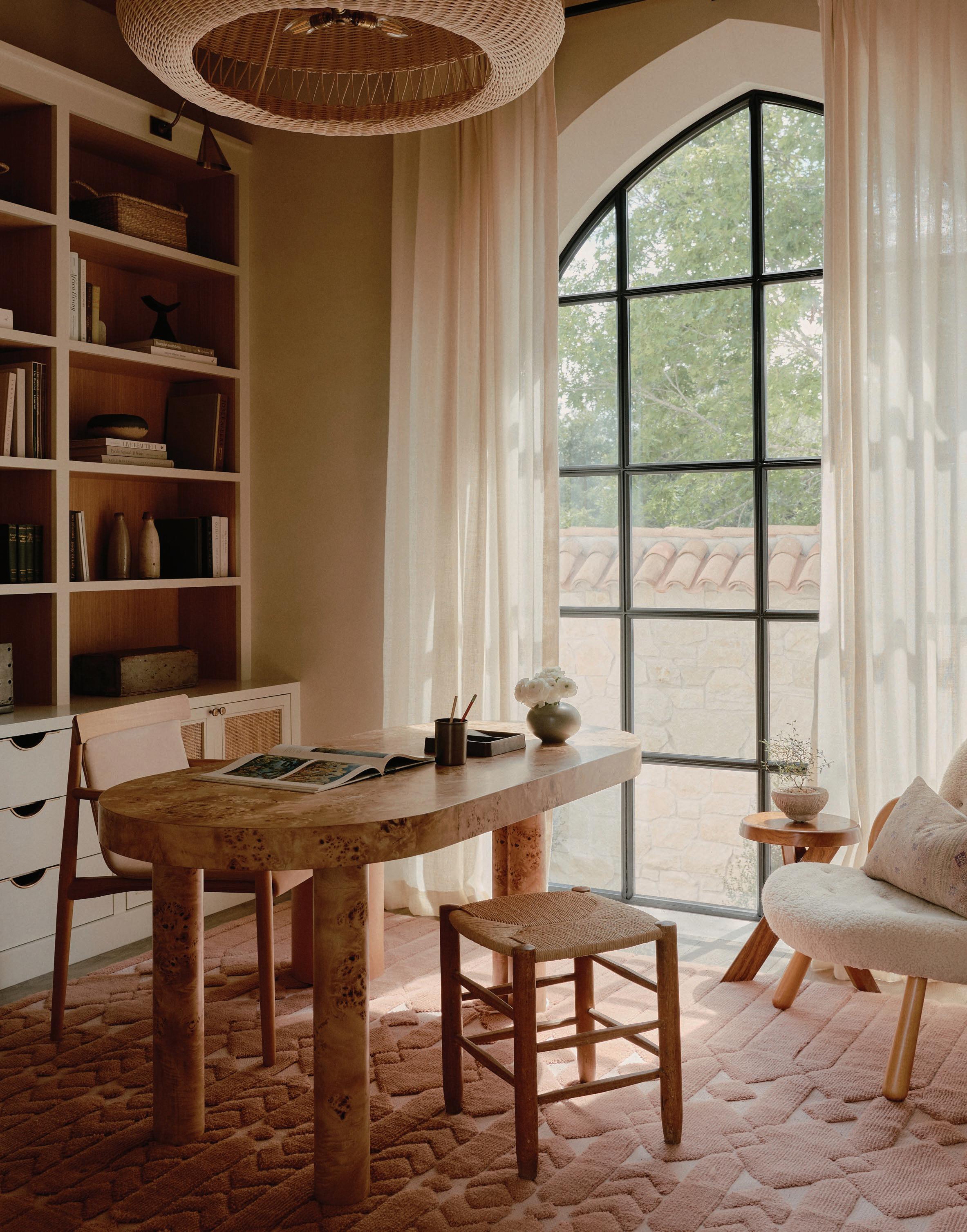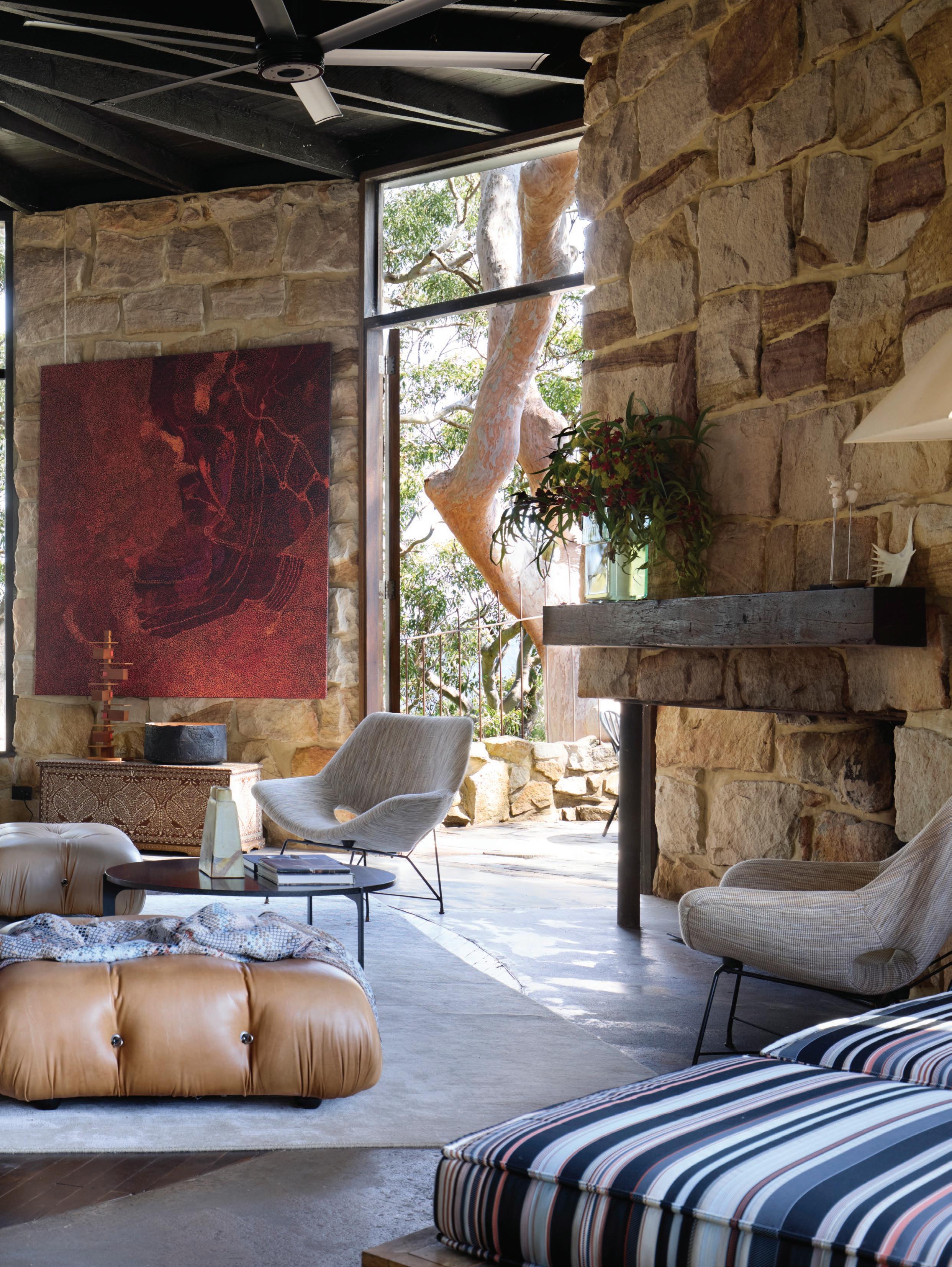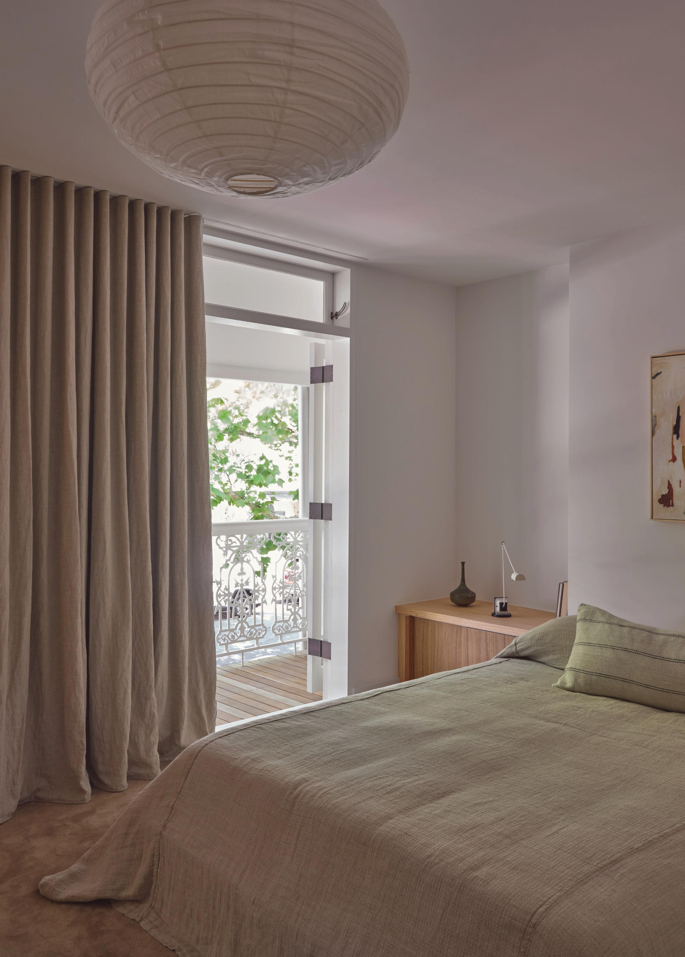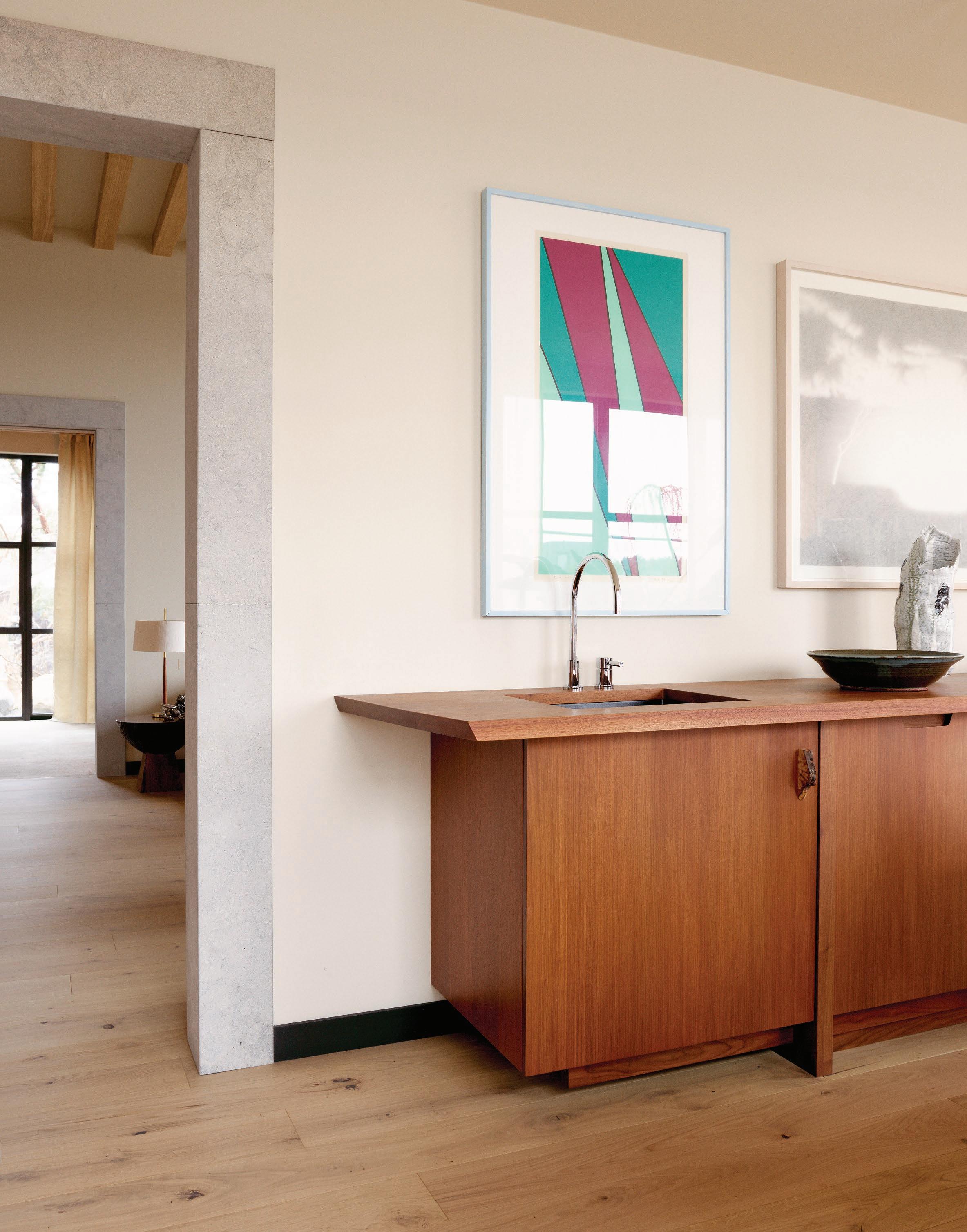 This page: Structural elements such as sandstone doorframes create a sense of effortless sophistication throughout the home. Opposite page: Cognac-toned timber cabinets and custom furnishings unify the spaces, complementing warm off-white tones applied on walls.