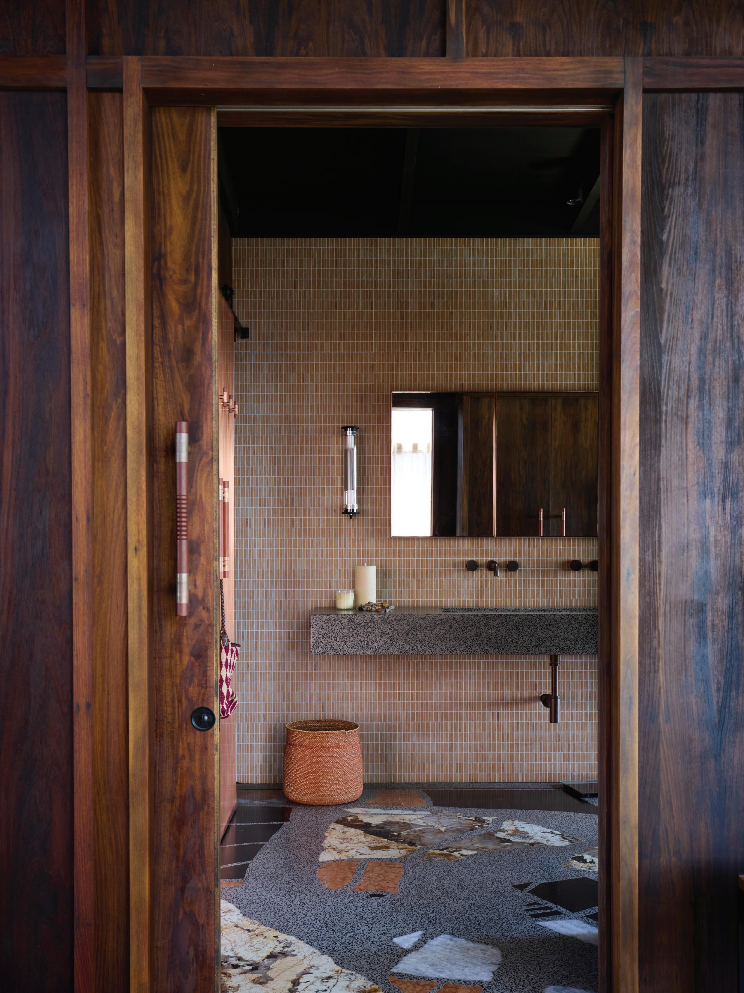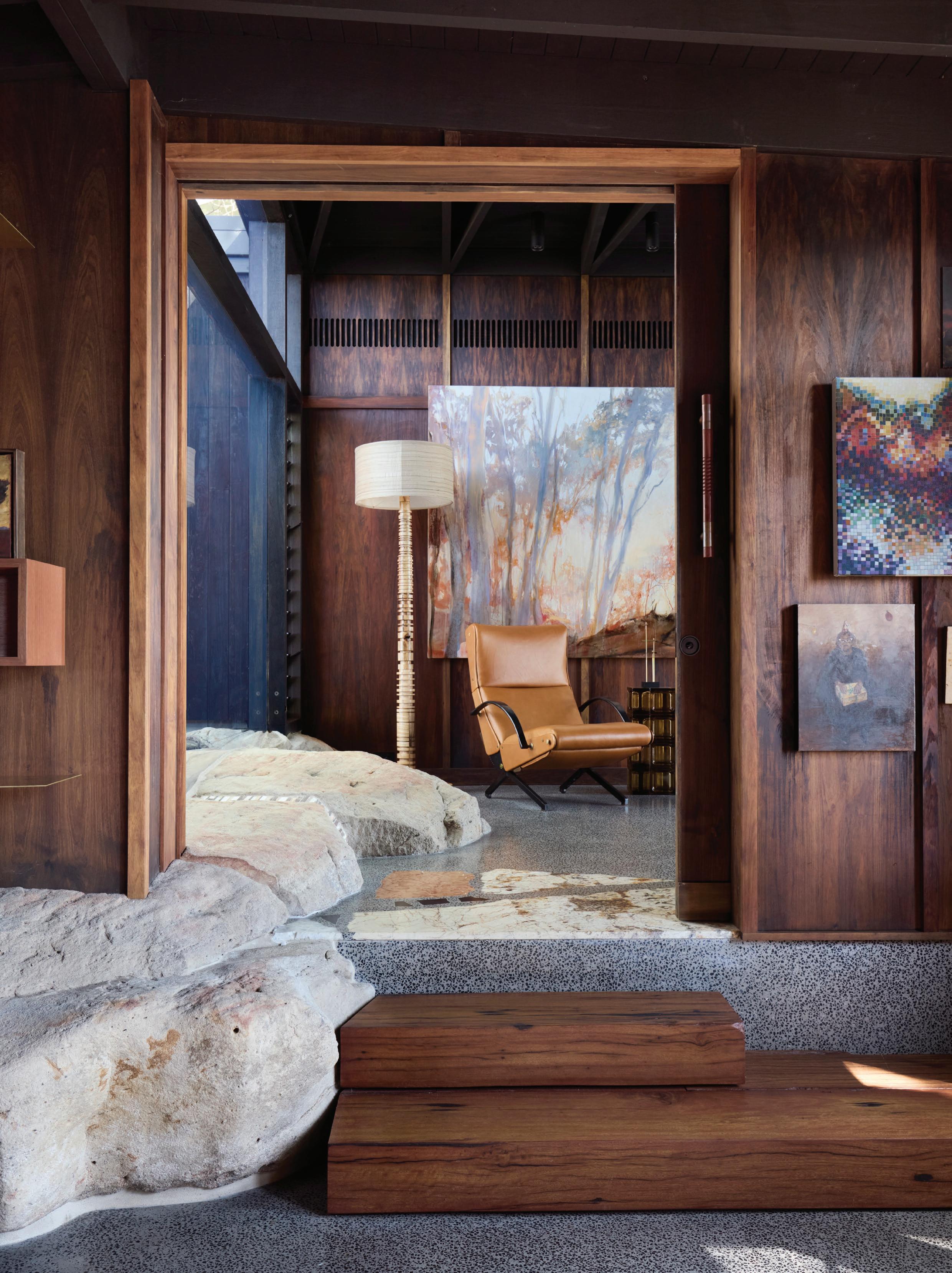 This page: Dedicated display spaces throughout the home enable residents to curate a rotating display of eclectic artworks and design objects from their collection. The primary en suite and walk-in robe are lined in leather toned Douglas fir timber panelling with bold quartzite flooring seamlessly connecting the spaces.