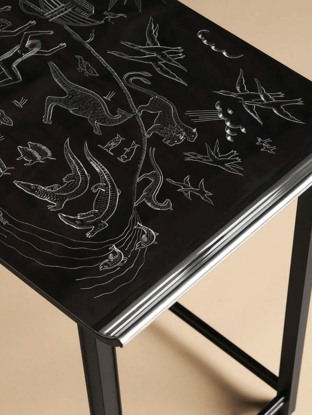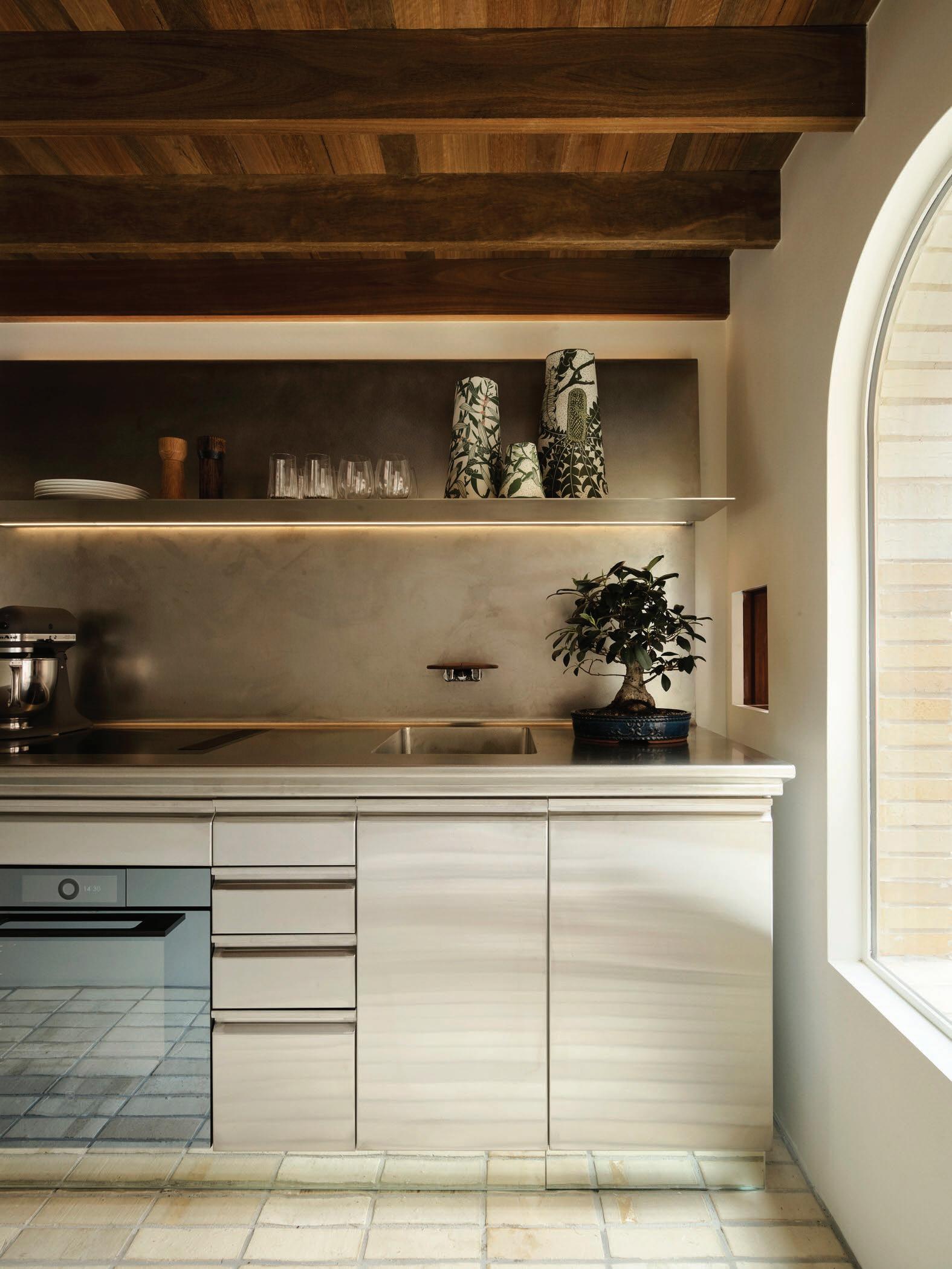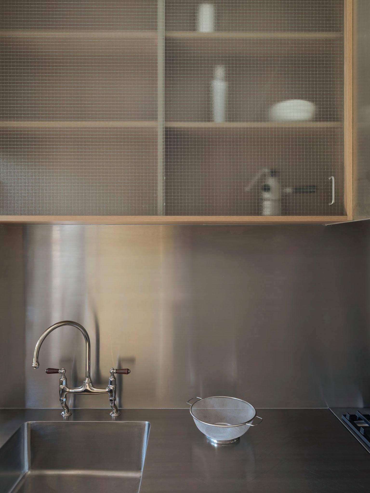 A visual counterpoint to the silver box is a black square cabinet that divides and demarcates the other zones. Together, these twin forms oppose the original architecture, inciting a dialogue between modernist purity and historic depth. Subtle, symbolic and exquisitely crafted, this kitchen glimmers with restrained opulence.