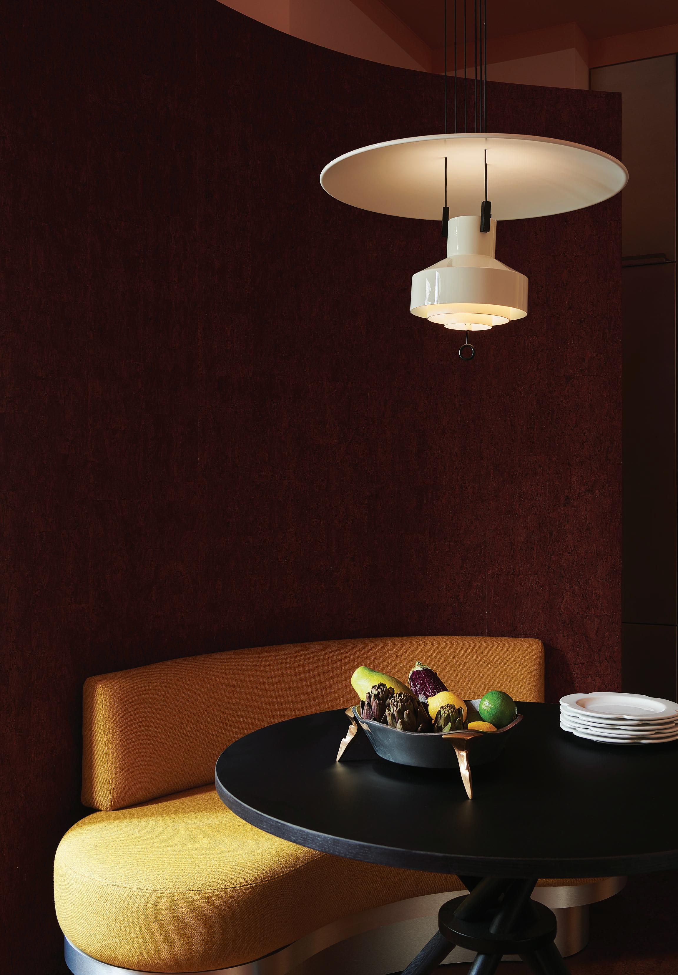 page: A peach-toned ceiling and cork floors bring a warmth and tactility to the space, while the Jesper Stähl table and Slow Love chair by Christophe Pillet from Remix Gallery add a level of craft. Opposite page: A curving partition in the kitchen corner allows for a seating nook, breaking the space, featuring a Saliscendi pendant by Achille and Pier Giacomo Castiglioni.