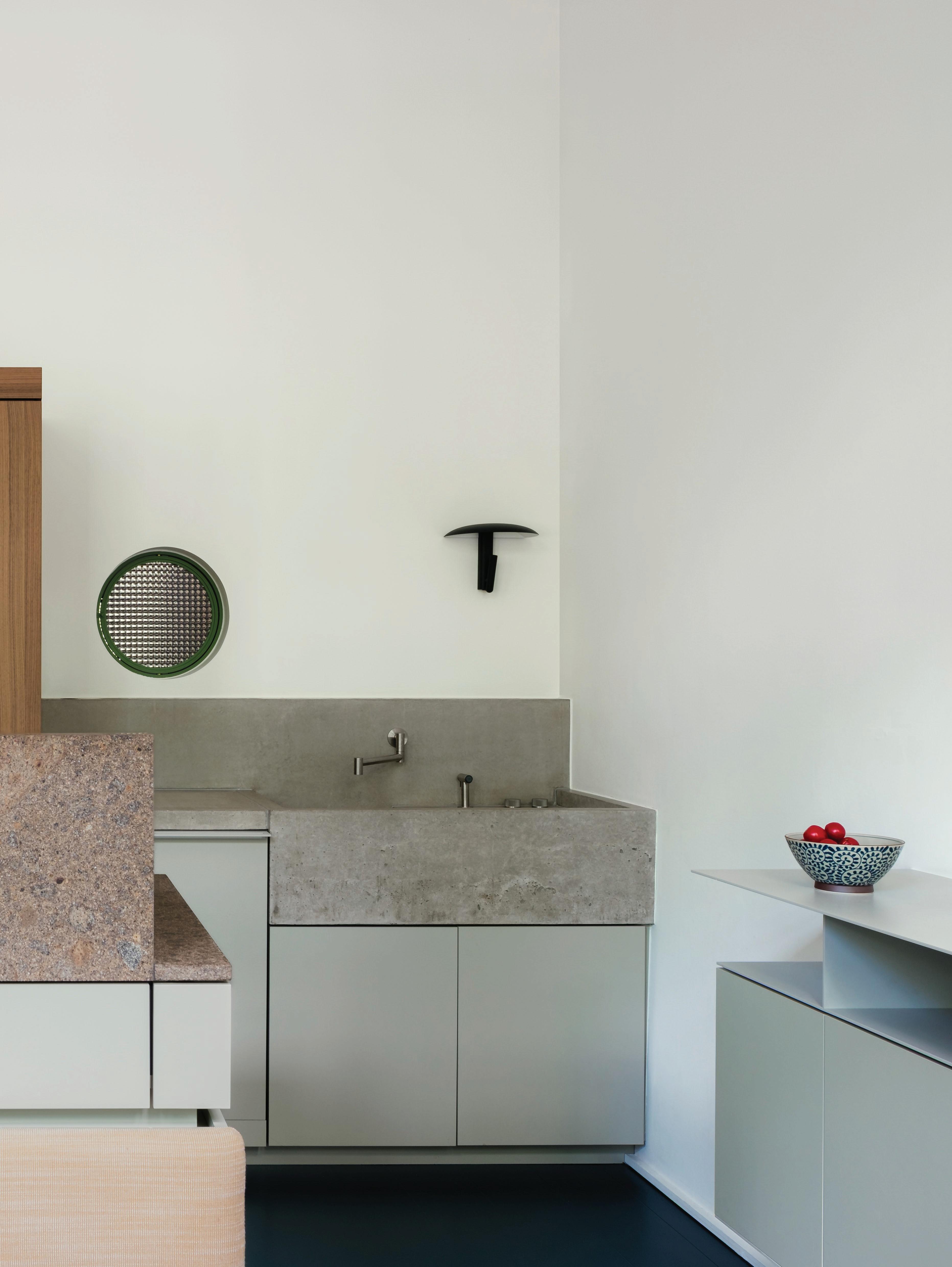 Infused with a hint towards Post Modernism, yolo is a refreshing update to living big with less in the city. A Skupa Breadstick table features in the foreground with the Studio Alm Chubby chair and a Vitra Potence wall lamp by Jean Prouve above. Appliances in the kitchen include the V-ZUG Combair V4000 Pyrolytic oven, while the island features a Zip HydroTap G5.