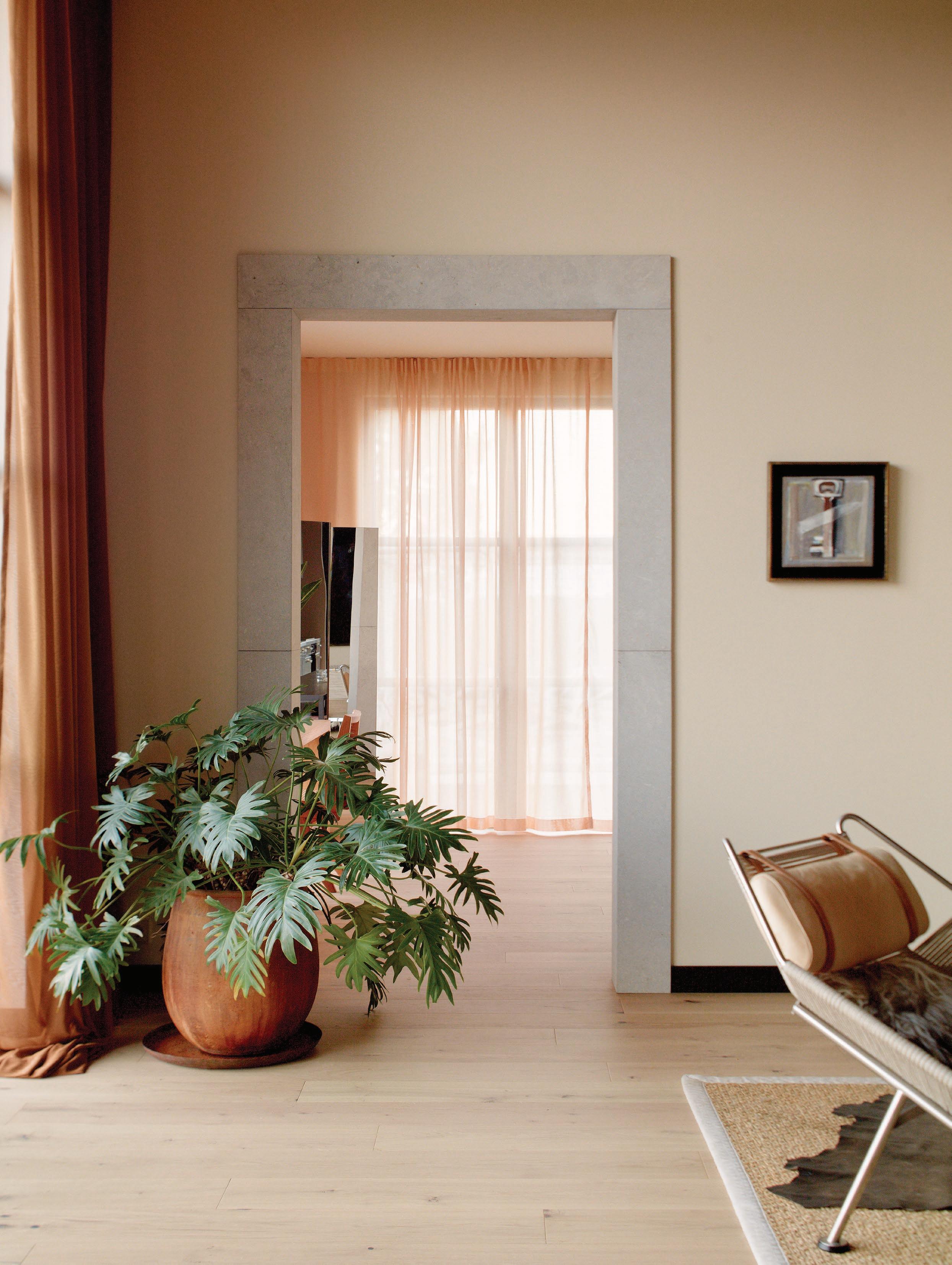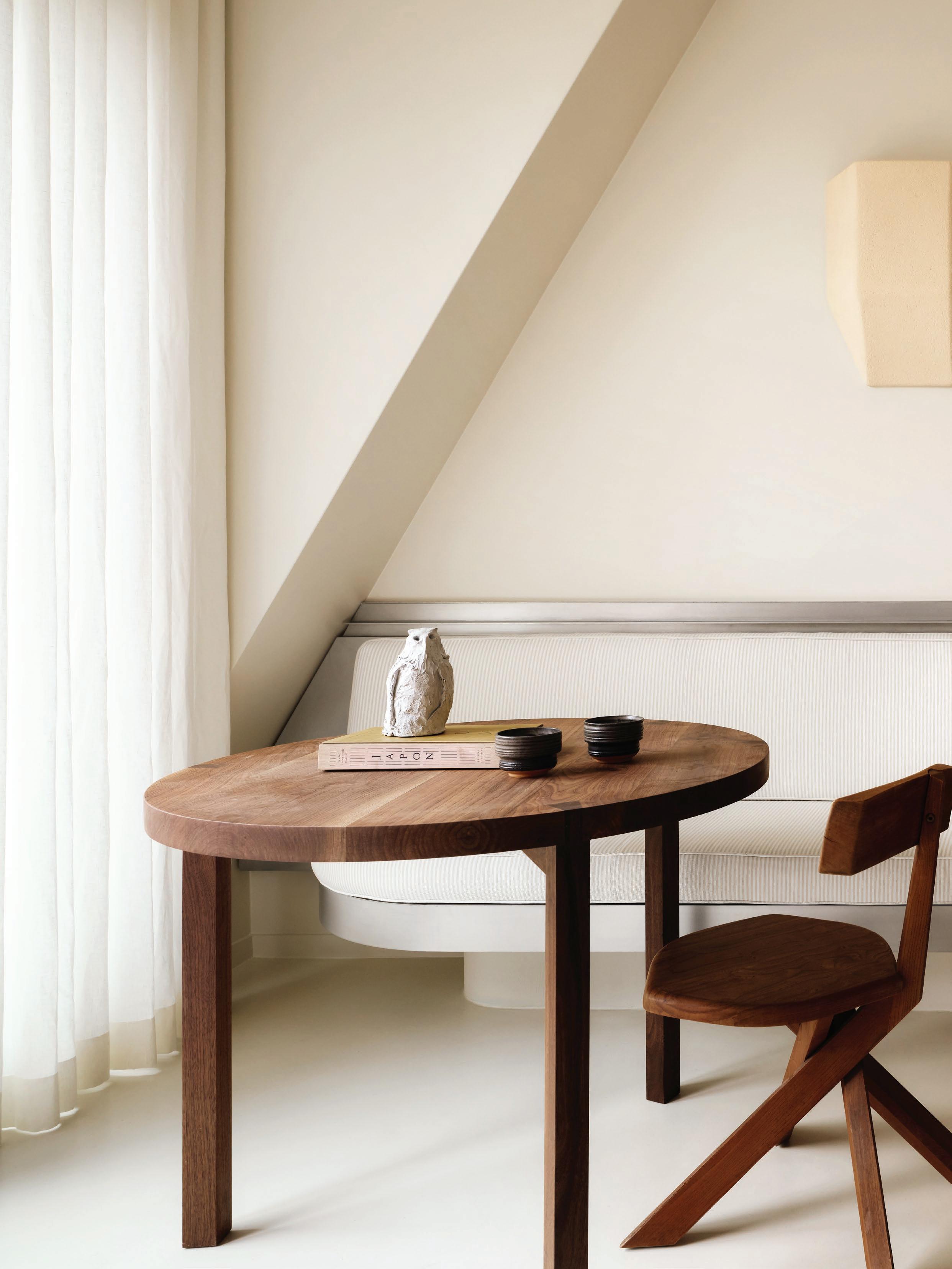 Esteemed among the fashion, art and architecture spheres for designing a series of Acne Studios boutiques worldwide, Halleroed is synonymous with an architectural signature based on a subtle interplay between light, colour and texture. A palette of warm off-white tones is enlivened by accents of burgundy, marble and a uniform cognac-toned wood that continues throughout the home. These tones and textures converse with a curated collection of furniture pieces, including the Utrecht armchair by Gerrit Thomas Rietveld for Cassina, Hans Wegner's iconic Flag Halyard chair, and a glass and steel coffee table by Warren Platner for Knoll.
