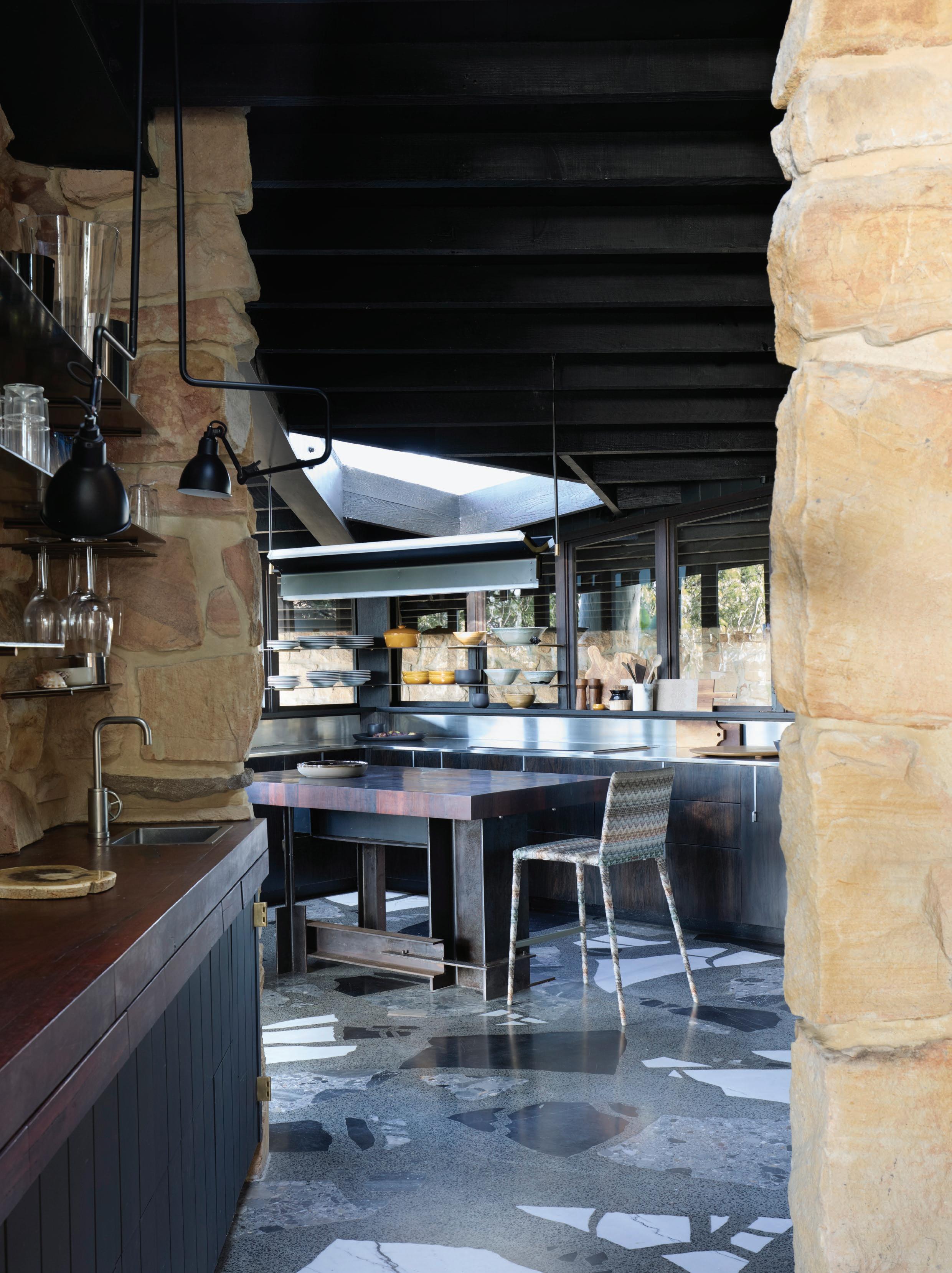 On a bed of Tongue & Groove Hekke flooring, a rippled green stone is paired with oak joinery and a bas-relief sculpted island bench with Miyazaki bar stools by Inoda + Sveje tucked underneath. Behind, the floor plan was redesigned to accommodate a walk-in pantry and scullery.