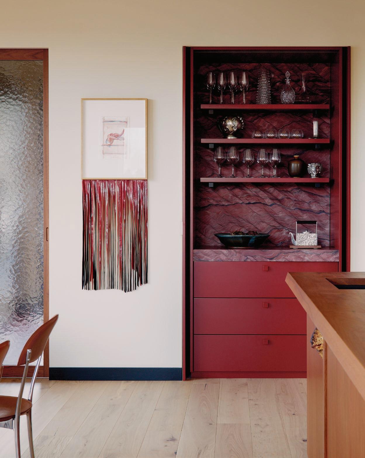 This page: Glass and tile elements form part of the kitchen’s material palette, enhancing the home’s tactile narrative. Opposite page: Custom timber cabinetry in the kitchen and dining areas echoes a warm natural character and nuanced colour palette, featuring vibrant pops of burgundy.