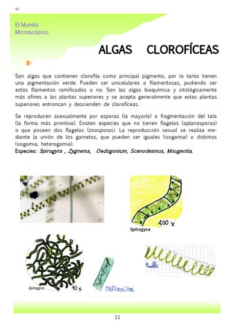 Son algas que contienen clorofila como principal pigmento, por lo tanto tienen una pigmentación verde. Pueden ser unicelulares o filamentosas, pudiendo ser estos filamentos ramificados o no. Son las algas bioquímica y citológicamente más afines a las plantas superiores y se acepta generalmente que estas plantas superiores entroncan y descienden de clorofíceas. Se reproducen asexualmente por esporas (la mayoría) o fragmentación del talo (la forma más primitiva). Existen especies que no tienen flagelos (aplanosporas) o que poseen dos flagelos (zoosporas). La reproducción sexual se realiza mediante la unión de los gametos, que pueden ser iguales (isogamia) o distintos (oogamia, heterogamia). Especies: Spirogyra , Zygnema, Oedogonium, Scenodesmus, Mougeotia,