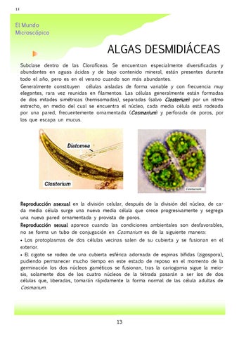 ALGAS DESMIDIÁCEAS Subclase dentro de las Clorofíceas. Se encuentran especialmente diversificadas y abundantes en aguas ácidas y de bajo contenido mineral, están presentes durante todo el año, pero es en el verano cuando son más abundantes. Generalmente constituyen células aisladas de forma variable y con frecuencia muy elegantes, rara vez reunidas en filamentos. Las células generalmente están formadas de dos mitades simétricas (hemisomadas), separadas (salvo Closterium) por un istmo estrecho, en medio del cual se encuentra el núcleo, cada media célula está rodeada por una pared, frecuentemente ornamentada (Cosmarium) y perforada de poros, por los que escapa un mucus.