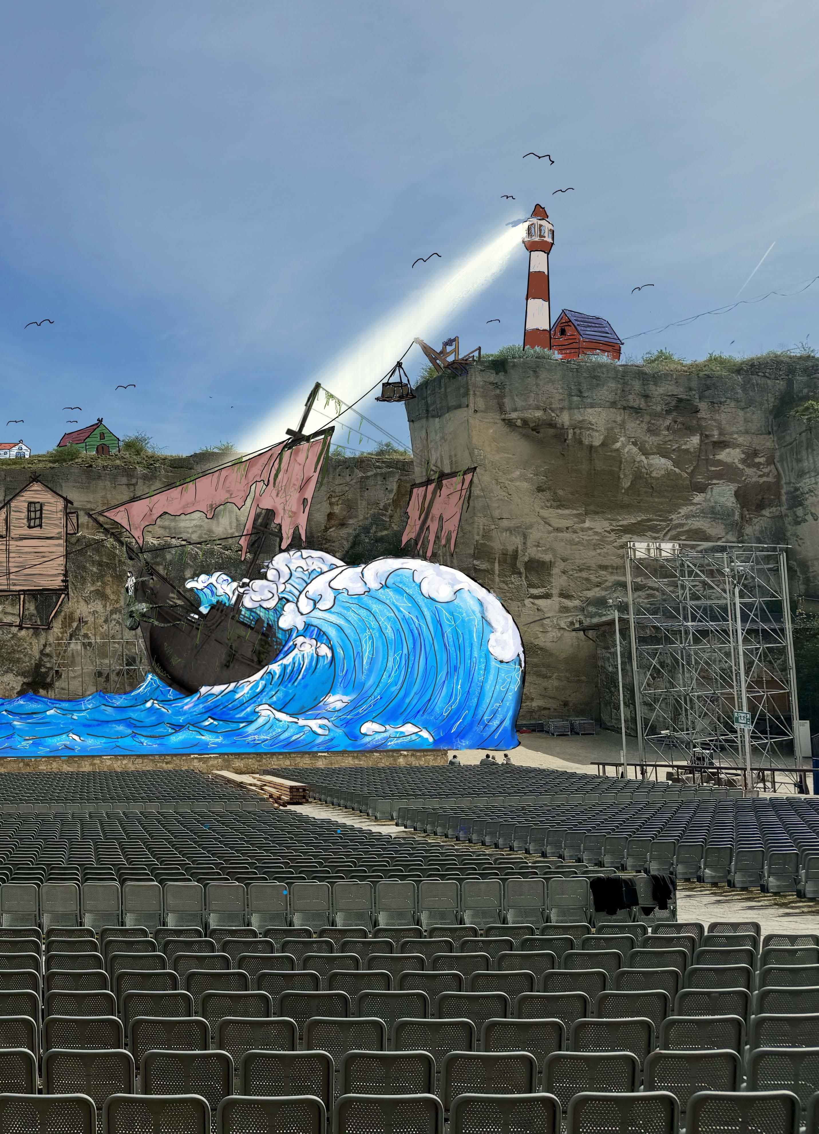 Aufführung von Der fliegende Holländer in der Oper im Steinbruch. Die Ideen des Bühnendesigners Momme Hinrichs nehmen nach und nach Gestalt an: So wird die schroffe Felskulisse des Steinbruchs St. Margarethen in die tosende Meerlandschaft von Wagners Der fliegende Holländer verwandelt: „Mit Der fliegende Holländer bringen wir erstmals eine Wagner-Oper nach St. Margarethen und sie scheint wie für diesen Ort geschaffen. Die kantigen Felswände und die karge Landschaft dieser archaischen Arena erinnern stark an die norwegische Küste. Mit Begeisterung verfolgen das Leading Team und ich die Arbeiten am Bühnenbild und wir freuen uns schon darauf, wenn das geheimnisvolle Segelschiff im Steinbruch St. Margarethen auftaucht und Dalands Haus zum Schauplatz verzweifelter Liebesschwüre wird“, so Daniel Serafin, Intendant der Oper im Steinbruch.