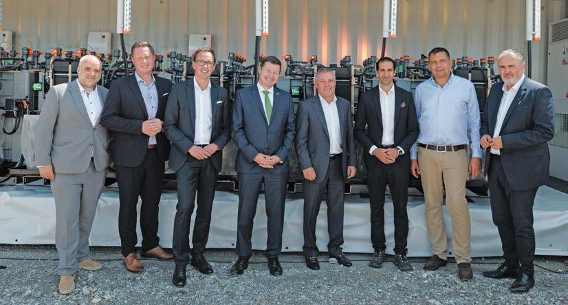 Damit kommt die innovative Organic-SolidFlowTechnologie erstmalig im Feld zum Einsatz und wird zukünftig überschüssig produzierte Energie des PVund Windparks aufnehmen und in weiterer Folge gezielt einspeisen. Der mobile Speicher in Containerform – sozusagen ein skalierbares „Lagerhaus für Strom“ – besteht aktuell aus sechs Batteriemodulen, die bis zu 500 kWh Energie speichern können und in den Gigawattstunden-Bereich erweiterbar sind.