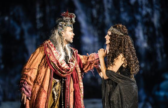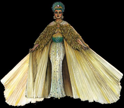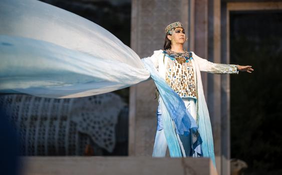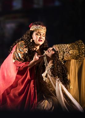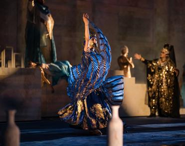tie laue Farben, die an den Nil erinnern, stehen im Kontrast zu feurigen orangeroten Kostümen, die die Wüste und die Leidenscha der Liebenden symbolisieren.