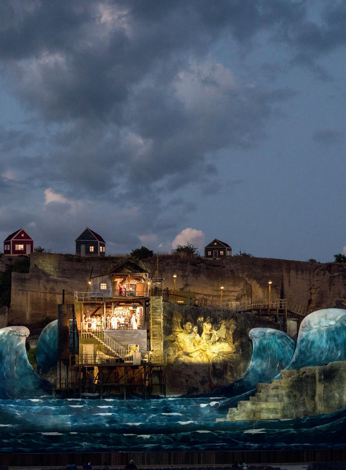 Regisseur Philipp M. Krenn versteht es gekonnt, Wagners Kompositionen lebendig werden zu lassen. Mit ihren maritimen Entwürfen verleiht Kostümdesignerin Eva Dessecker dem Werk eine unverwechselbare Farbpoesie und Bühnenbildner Momme Hinrichs setzt mit seinem einzigartigen Bühnenbilddesign neue Maßstäbe im visuellen Erzählen. Natur spielt dabei eine Schlüsselrolle – und wo könnte diese Szenerie realistischer dargestellt werden als in der atemberaubenden Kulisse eines UNESCO-geschützten Steinbruchs? Die schroffen Felswände, wo einst das Urmeer tobte, und die karge Landschaft dieser archaischen Arena erinnern bereits stark an die norwegische Küste. Hier entfalten sich raue See, Sturm und Schicksal in voller Wucht.