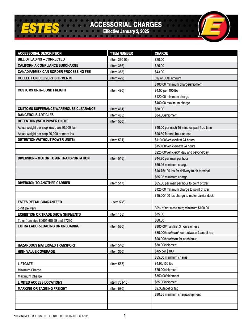 Maximum Charge: The highest amount of freight and/or accessorial charges Estes will bill the customer.