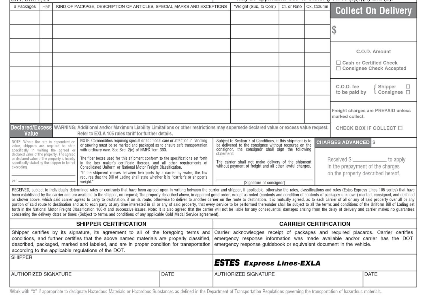 • Limitation of Liability—varies with the class of the commodity, $5 per pound and a maximum of $50,000 per shipment