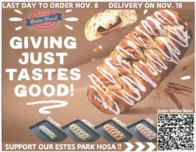 Sponsored by the Estes Park Police Department’s Auxiliary Unit, the Blue Santa program purchases and delivers non-perishable food and hygiene products to disabled, shut-in, and elderly community members need ing holiday cheer in De cember. Estes Park has about 100 Blue Santa recipients each year. Nominations for community members to receive a delivery should be submitted before Nov. 30, 2024. Community members may email nominations to BlueSanta@estes.org or use the online nomination form at estes.org/bluesanta. Bright Christmas recipients are not eligible for Blue Santa. You can help by sending your monetary donation to the Blue Santa Program, c/o Estes Park Police Auxiliary, P.O. Box 1287, Estes Park, CO 80517; or leave a donation in one of the Blue Santa donation jars around town. Jars are located at Animal Medical Center, Bank of Col-
