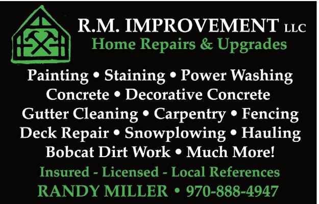 38 » Friday, February 17, 2023 epnews.com HOT TUBS & POOL SERVICES PROFESSIONAL BUSINESS BUILDER Cory D. Workman, Au.D. Phone: 970-586-5255 1186 Graves Ave., Ste. B Estes Park, CO 80517 Fax: 970-577-7260 drcory@estesparkaudiology.com www.estesparkaudiology.com • Hearing Aids / New & Repair • Hearing Evaluations • Hearing Protection • Ear Care / Wax Removal • Dizziness / Balance HEARING & TINNITUS CARE 970-586-1685 Custom Homes, Additions, Kitchens, Baths, Historic Renovations, Remodels and Design Work Full service general contracting since 1998 Charles Santagati glaciercreekinc.com 1191 Graves Ave GENERAL CONTRACTOR FLOORING cont. MAINTENANCE/REPAIR SERVICES SERVING ESTES PARK FOR 20 YEARS (970)-577-9855 parkflooring.com D DIAMOND D HANDYMAN SERVICE Home Maintenance & Repairs Snow Removal “Consider It Done!” Licensed & Insured Dave 303-877-2007
