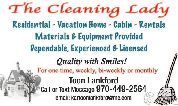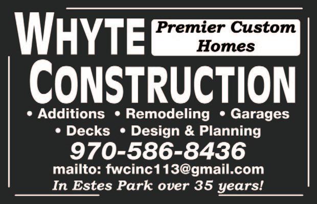 38 » Friday, February 24, 2023 epnews.com HOT TUBS & POOL SERVICES PROFESSIONAL BUSINESS BUILDER Cory D. Workman, Au.D. Phone: 970-586-5255 1186 Graves Ave., Ste. B Estes Park, CO 80517 Fax: 970-577-7260 drcory@estesparkaudiology.com www.estesparkaudiology.com • Hearing Aids / New & Repair • Hearing Evaluations • Hearing Protection • Ear Care / Wax Removal • Dizziness / Balance HEARING & TINNITUS CARE 970-586-1685 Custom Homes, Additions, Kitchens, Baths, Historic Renovations, Remodels and Design Work Full service general contracting since 1998 Charles Santagati glaciercreekinc.com 1191 Graves Ave GENERAL CONTRACTOR FLOORING cont. MAINTENANCE/REPAIR SERVICES SERVING ESTES PARK FOR 20 YEARS (970)-577-9855 parkflooring.com D DIAMOND D HANDYMAN SERVICE Home Maintenance & Repairs Snow Removal “Consider It Done!” Licensed & Insured Dave 303-877-2007