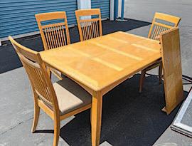 Light wood Dining Table with leaf and 4 solid wood chairs with upholstered seat cushions. Table and chairs are in good condition. The seat cushions need some love. Call David (702)285-4445