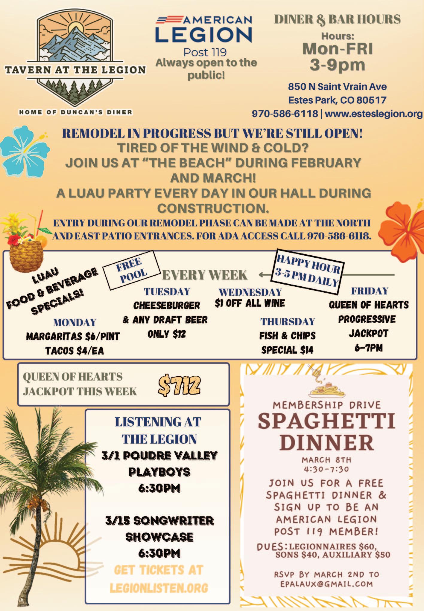 Be sure to check next week’s Estes Park News to learn more about Post 119’s mission in the community and a snapshot of its history in Estes Park. Seating for the dinner is limited, so to guarantee your space, please RSVP by March 2nd to EPALaux@gmail.com.