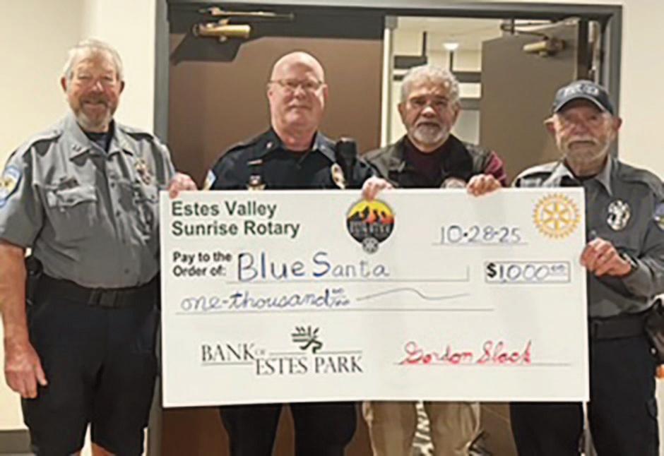 Every holiday season, the Blue Santa Program collects non-perishable food, gifts, and hygiene products for disabled, shut-in, and elderly community members. Blue Santa is sponsored by the Estes Park Police Auxiliary. The program depends on donations to give these community members a little extra cheer at this time of year. And every year, the Estes Park Sunrise Rotary donates $1,000 to support the Blue Santa Program.