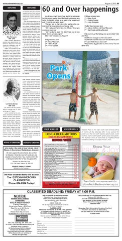 or e-mail: classieds@estevanmercury.ca Business Ofce Located at 68 Souris Avenue North in Estevan (Across from the Water Tower) Phone 634-2654 for further information Ofce Hours: 8:00 a.m. to 5:00 p.m. Monday through Friday